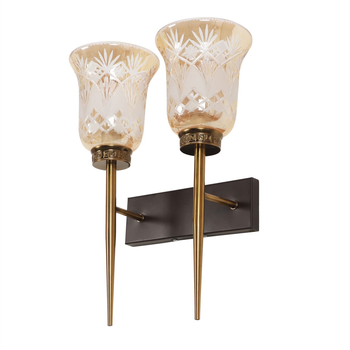 Antique, brown mild steel double wall light with bell shaped designer glasses with engraved design. It is maintenance free, comes with an E27 holder, only the change of lamp is required, which is available locally everywhere. Application includes both residential and commercial premises wherever it matches with your interiors. Can be customized as per requirement. LAMPS NOT INCLUDED.