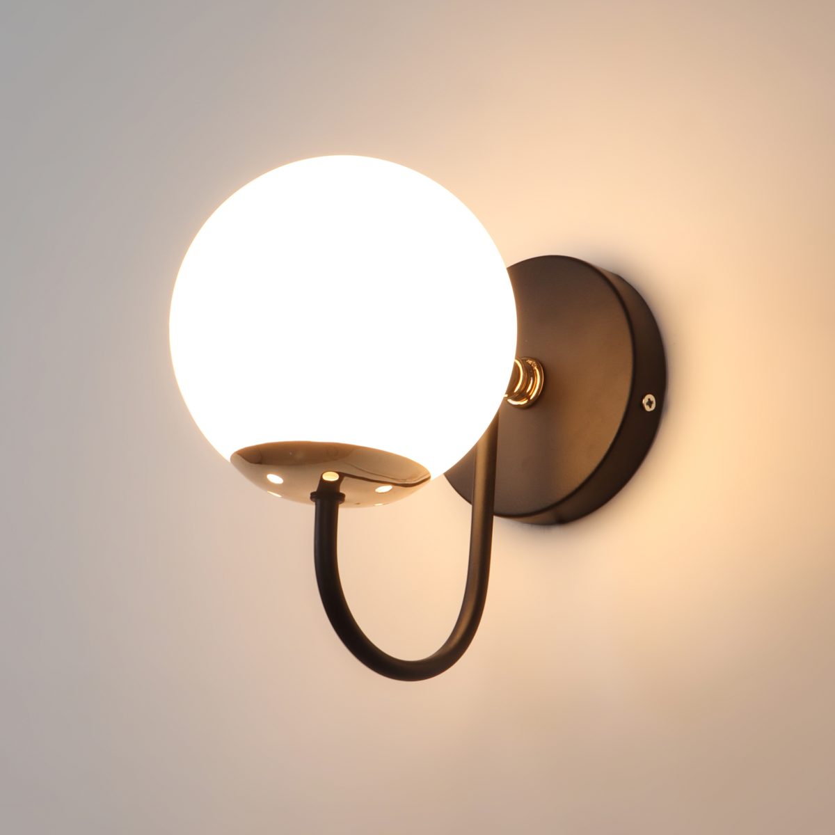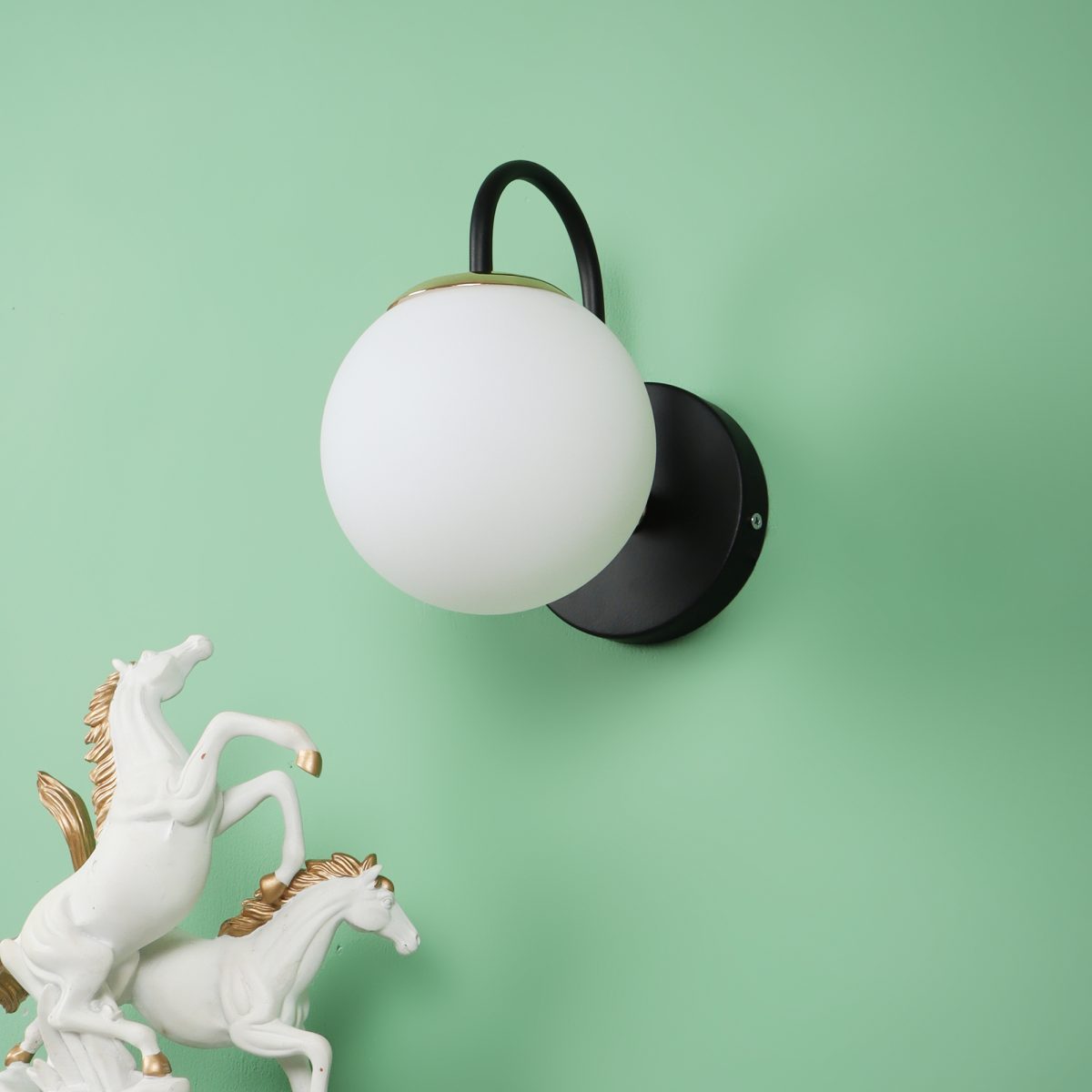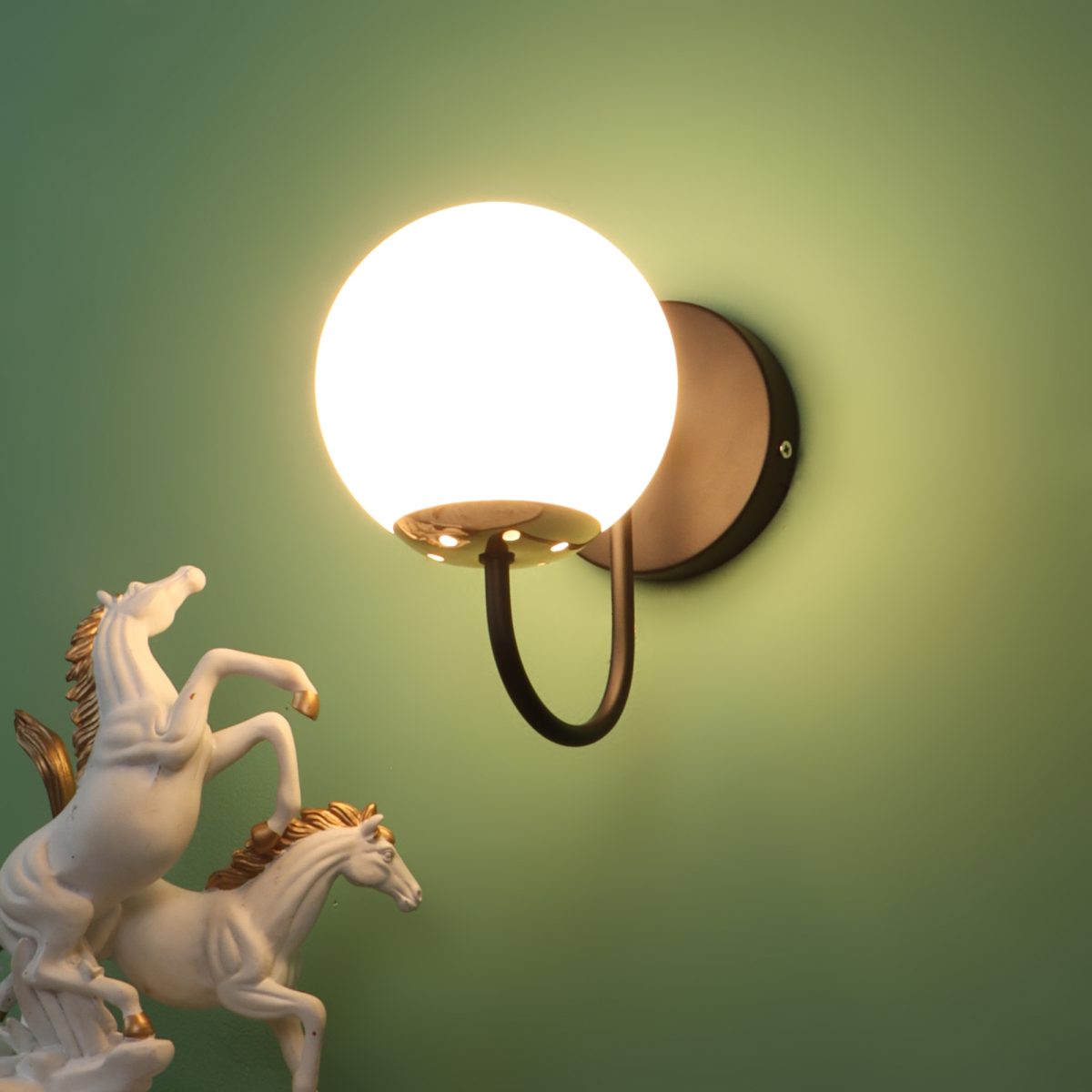 Gold finish single wall light with small round globe (doom) type white glass . It is maintenance free, easy to remove glass and wash it. Comes with an E27 holder, only the change of lamp is required, which is available locally everywhere. Application includes both residential and commercial premises wherever it matches with your interiors. Can be customized as per requirement in case of bulk quantities. LAMP NOT INCLUDED.