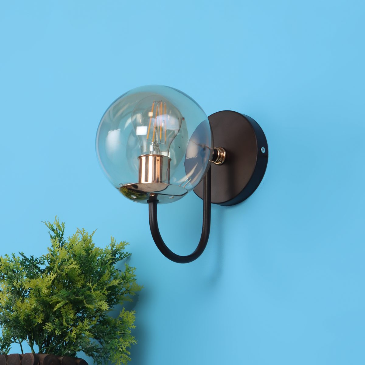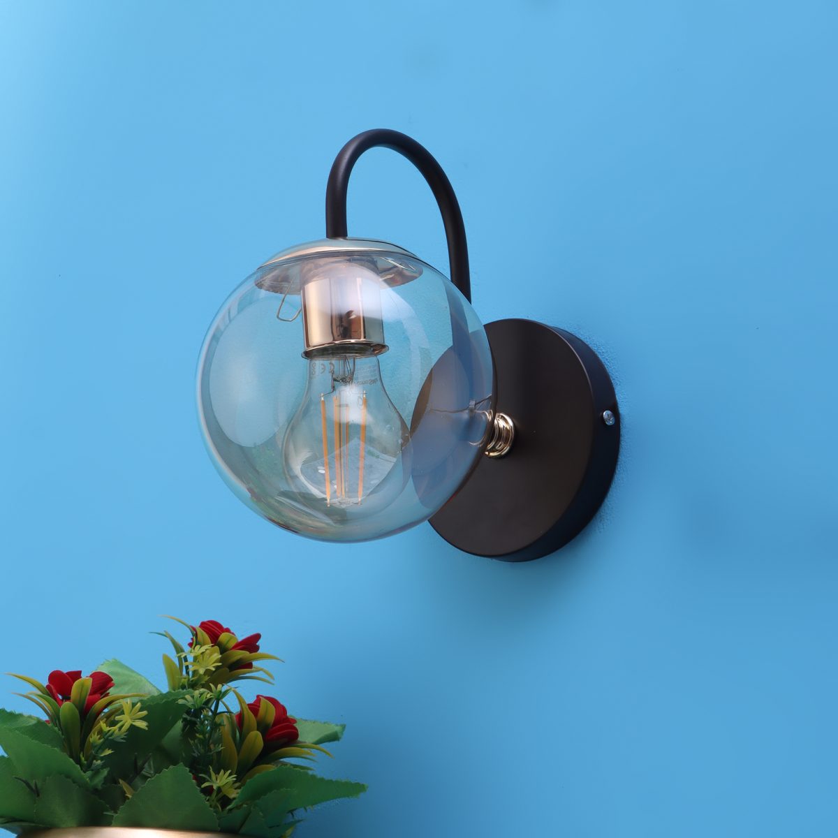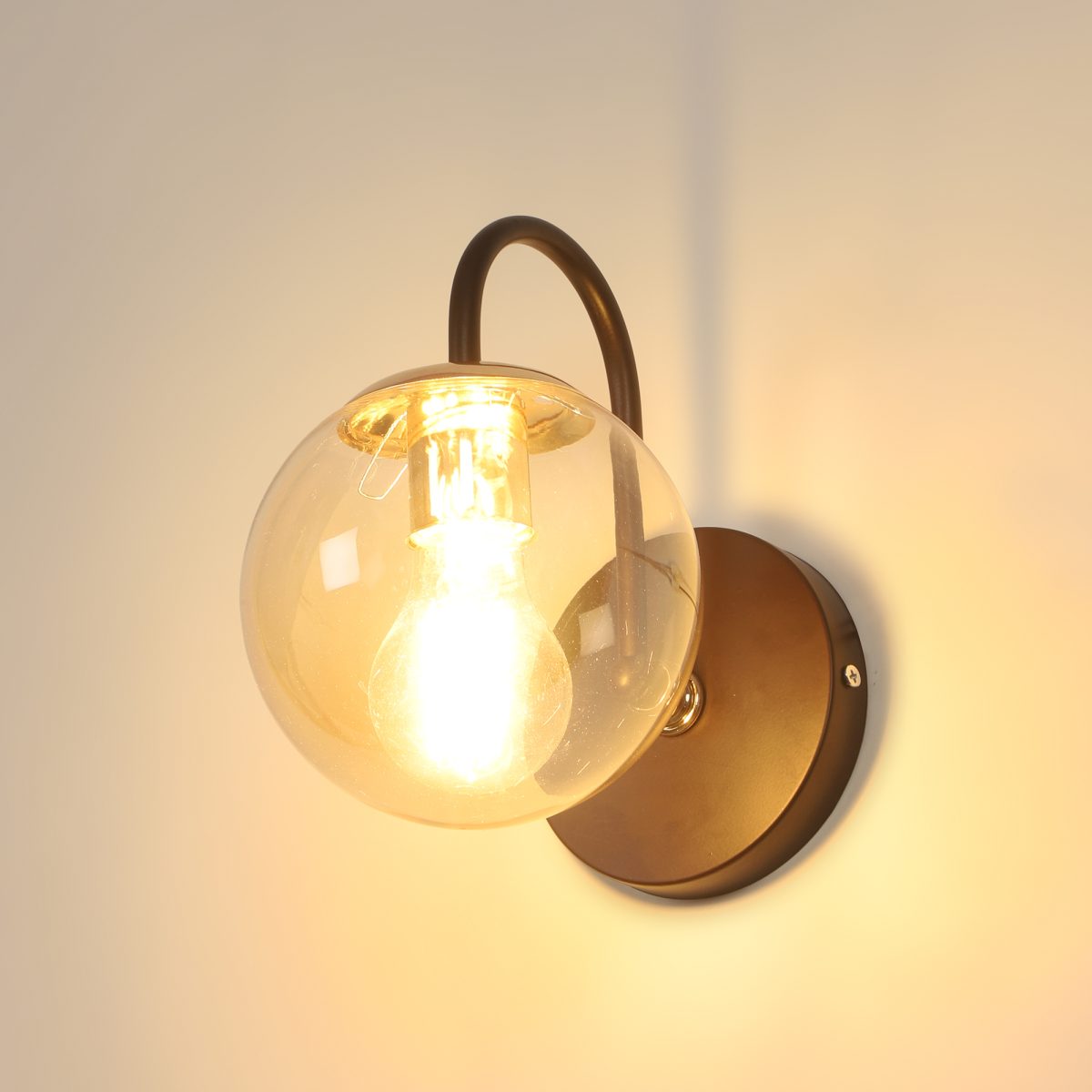Brown gold finish single wall light with small round globe (doom) type champaign coloured glass . It is maintenance free, easy to remove glass and wash it. Comes with an E27 holder, only the change of lamp is required, which is available locally everywhere. Application includes both residential and commercial premises wherever it matches with your interiors. Filament lamp is recommended to enhance its beauty. Can be customized as per requirement. LAMP NOT INCLUDED.