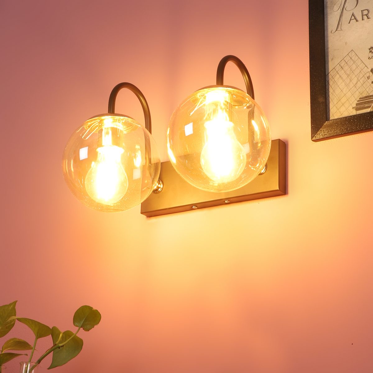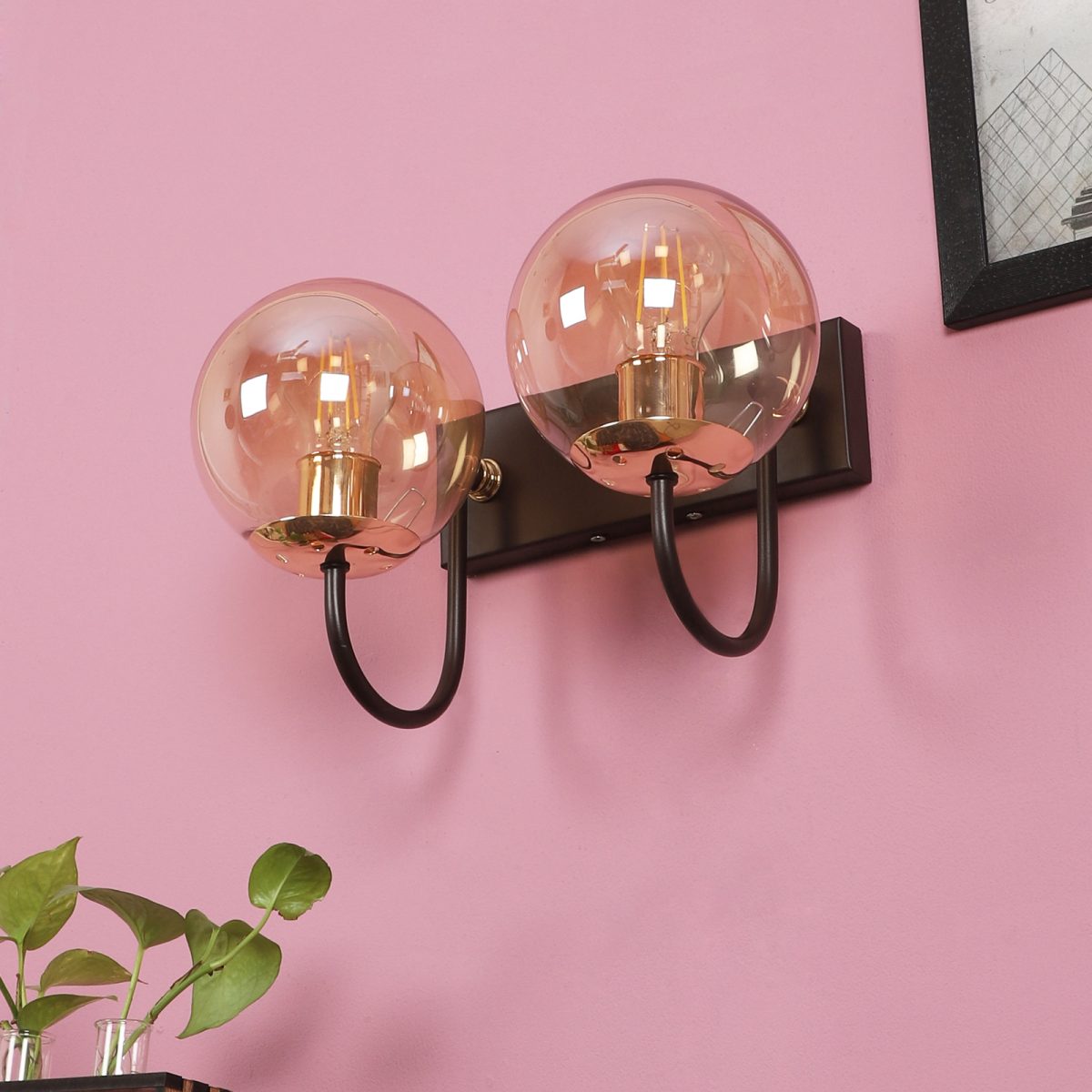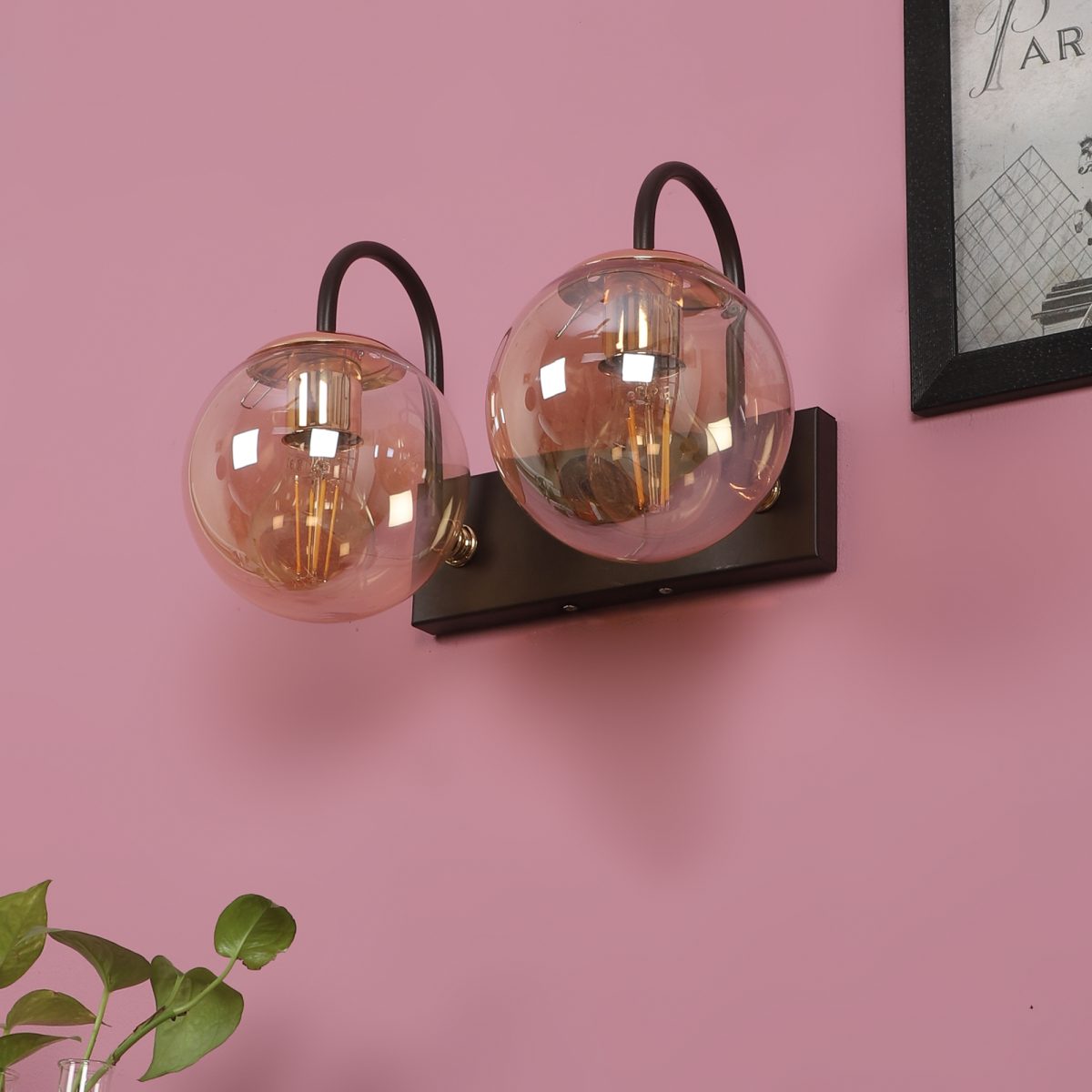 Brown gold finish double wall light with small round globe (doom) type champaign coloured glasses. It is maintenance free, easy to remove glasses and wash them. Comes with an E27 holder, only the change of lamp is required, which is available locally everywhere. Application includes both residential and commercial premises wherever it matches with your interiors. LED filament lamp is recommended to enhance its beauty. Can be customized as per requirement. LAMP NOT INCLUDED.
