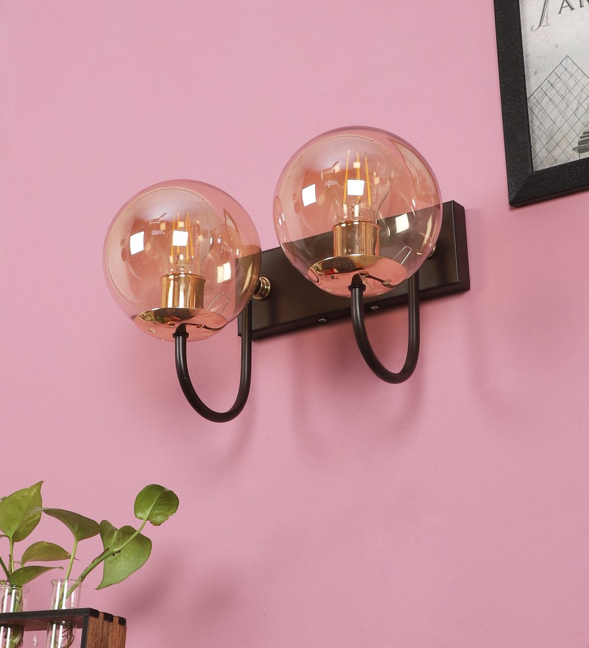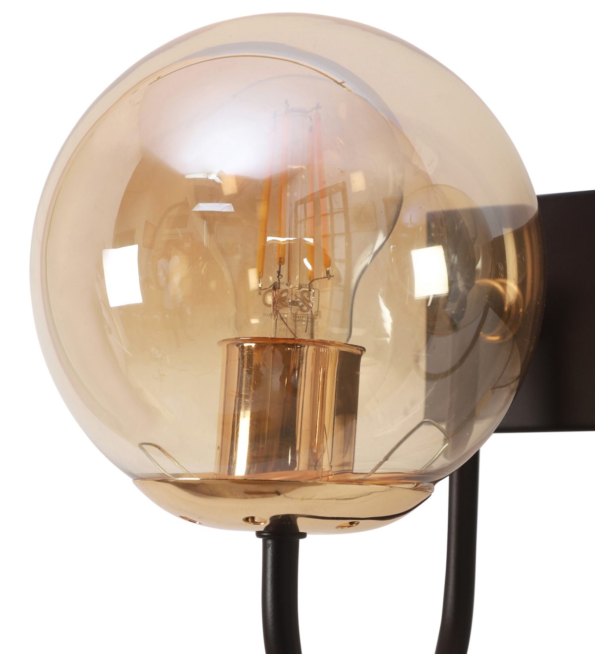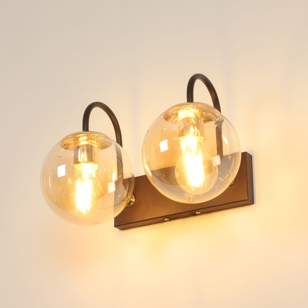 Brown gold finish double wall light with small round globe (doom) type champaign coloured glasses. It is maintenance free, easy to remove glasses and wash them. Comes with an E27 holder, only the change of lamp is required, which is available locally everywhere. Application includes both residential and commercial premises wherever it matches with your interiors. LED filament lamp is recommended to enhance its beauty. Can be customized as per requirement. LAMP NOT INCLUDED.