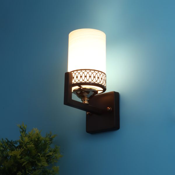 Dark brown finish double wall light having cylinderical white glass having self textured design mounted on a designer frame made of mild steel. It is maintenance free. It is easy to remove glasses and wash them. Comes with an E27 holder, only the change of lamp is required, which is available locally everywhere. Application includes both residential and commercial premises wherever it matches with your interiors. Can be customized as per requirement. LAMP NOT INCLUDED.