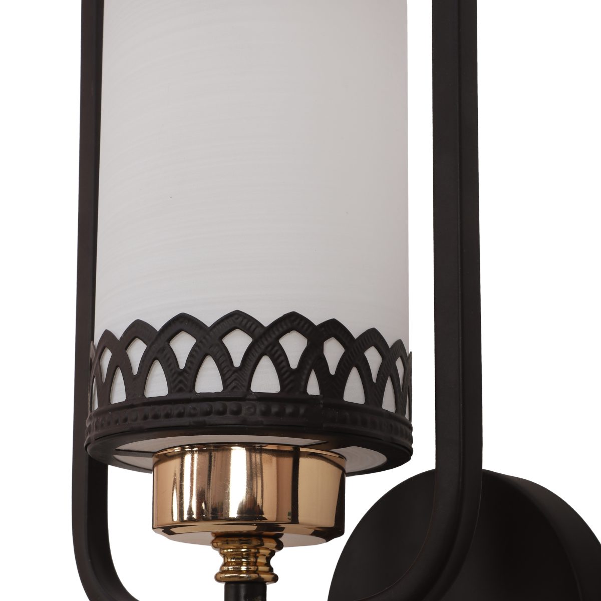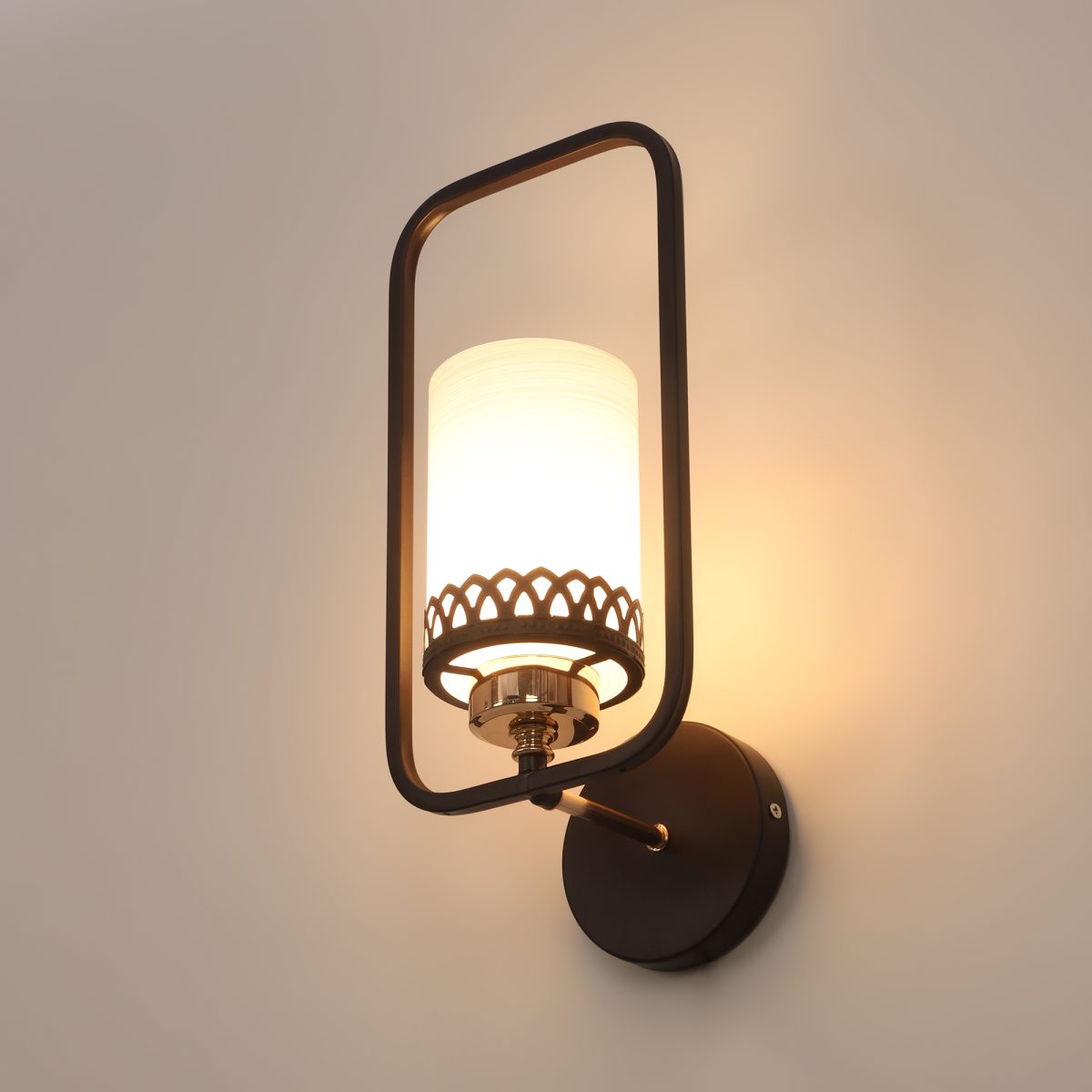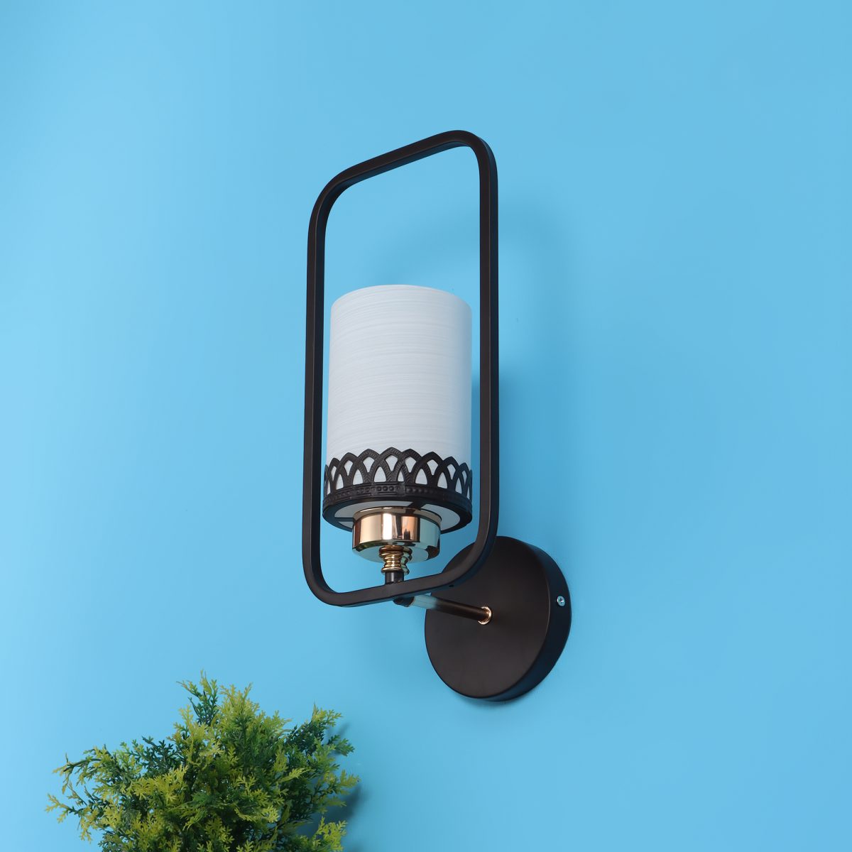 Dark brown finish single wall light having cylinderical white glass having self textured design mounted on a designer frame made of mild steel. It is maintenance free. It is easy to remove glass and wash it. Comes with an E27 holder, only the change of lamp is required, which is available locally everywhere. Application includes both residential and commercial premises wherever it matches with your interiors. Can be customized as per requirement, LAMP NOT INCLUDED.
