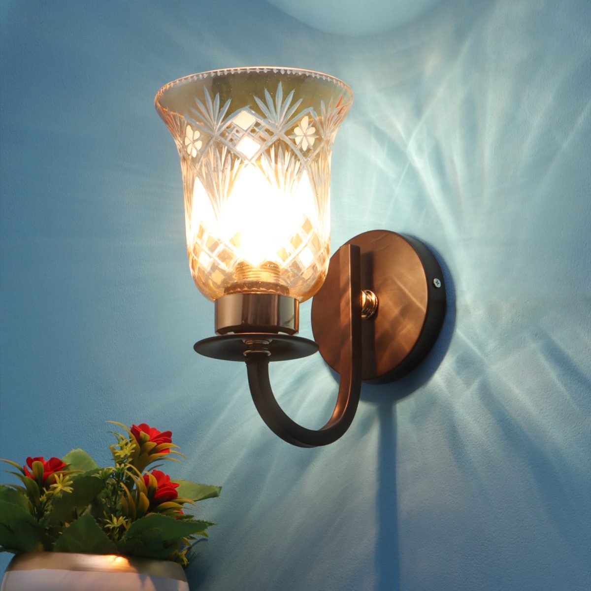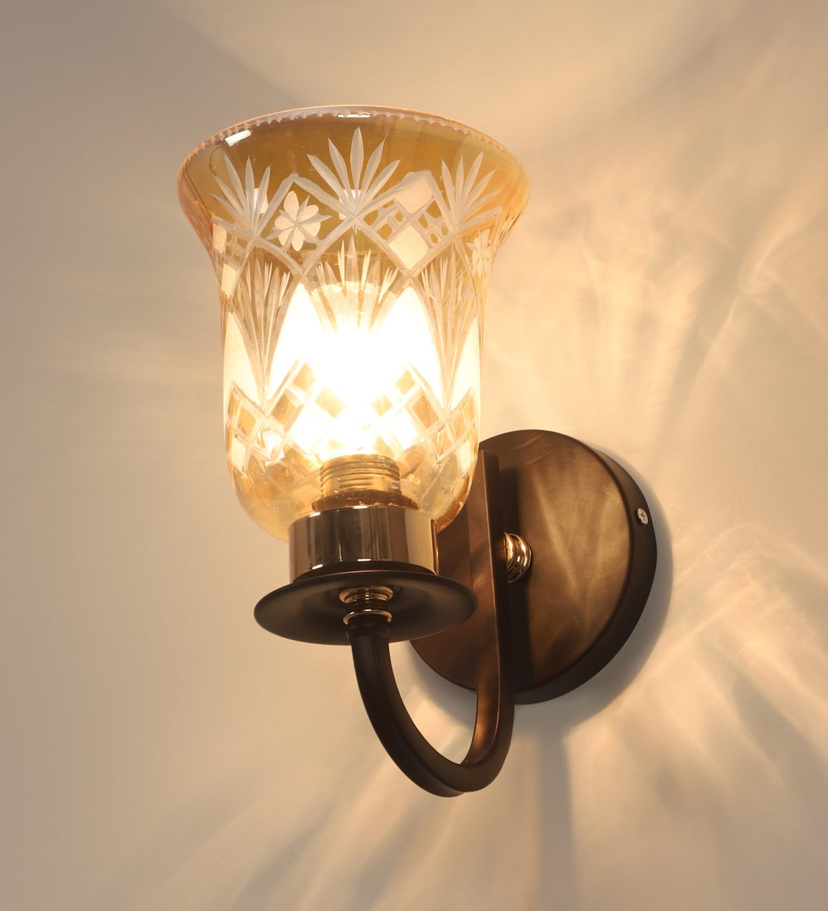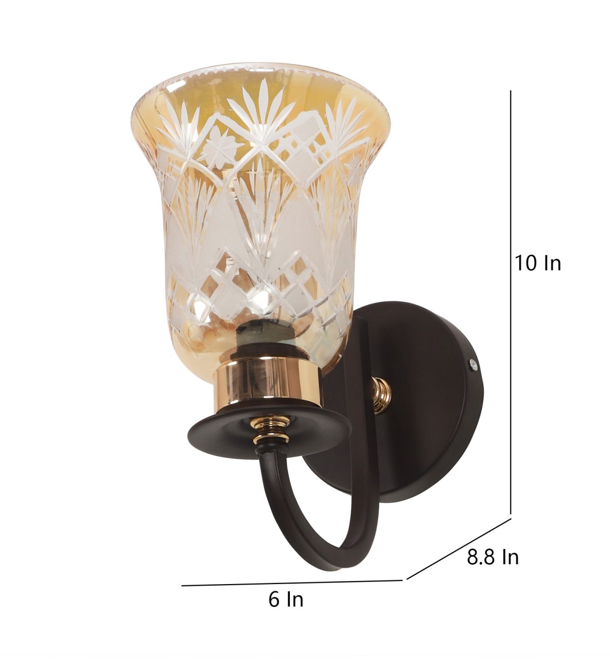 Dark brown finish single wall light having bell shaped glass having engraved design mounted on a designer frame made of mild steel. It is maintenance free. It is easy to remove glass and wash it. Comes with an E27 holder, only the change of lamp is required, which is available locally everywhere. Application includes both residential and commercial premises wherever it matches with your interiors. Can be customized as per requirement, LAMP NOT INCLUDED.