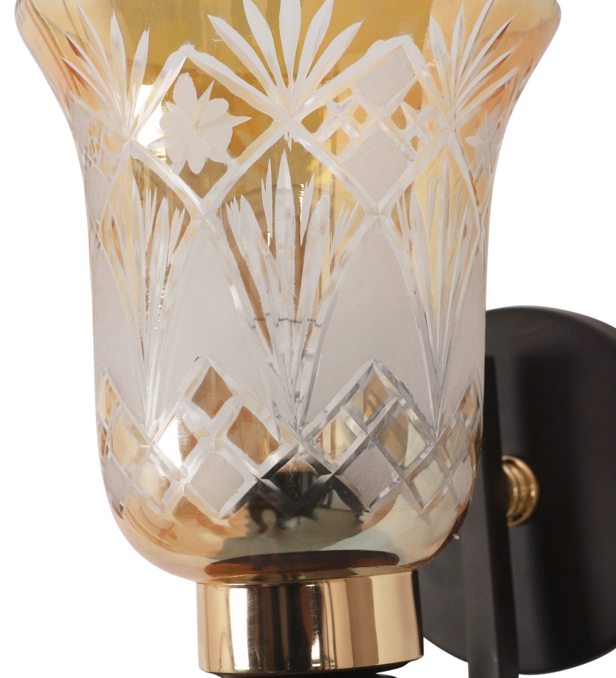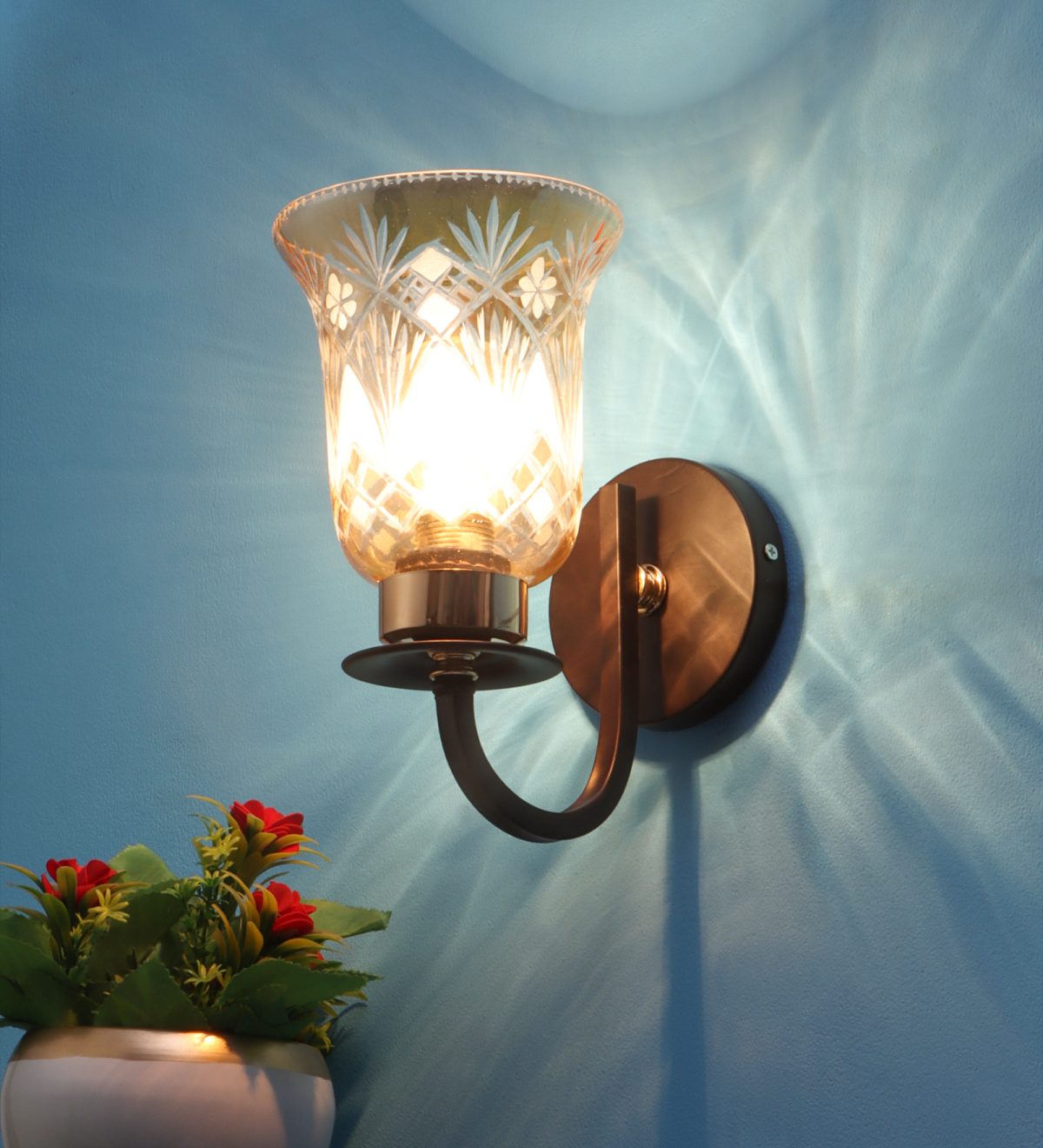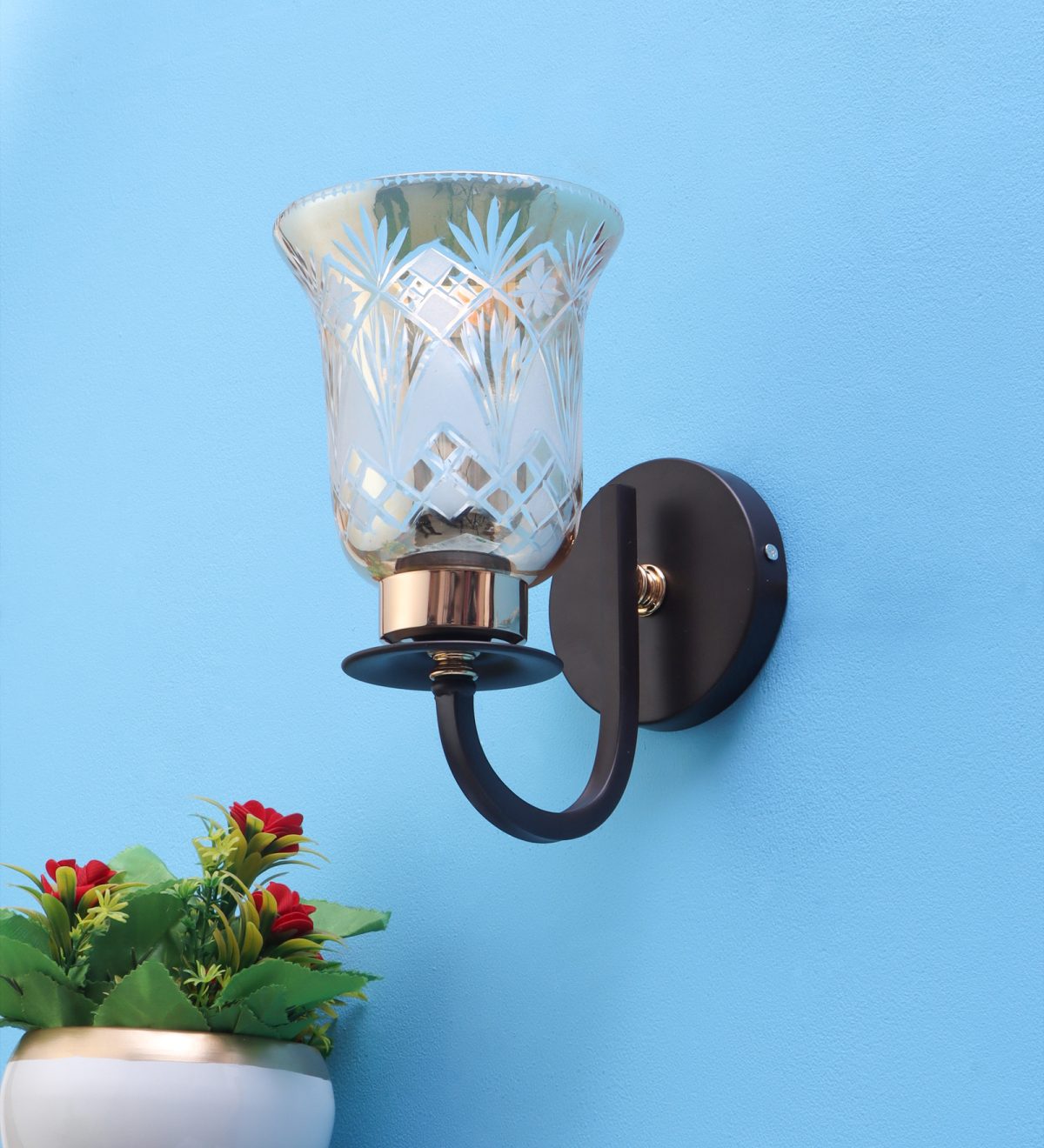 Dark brown finish single wall light having bell shaped glass having engraved design mounted on a designer frame made of mild steel. It is maintenance free. It is easy to remove glass and wash it. Comes with an E27 holder, only the change of lamp is required, which is available locally everywhere. Application includes both residential and commercial premises wherever it matches with your interiors. Can be customized as per requirement, LAMP NOT INCLUDED.