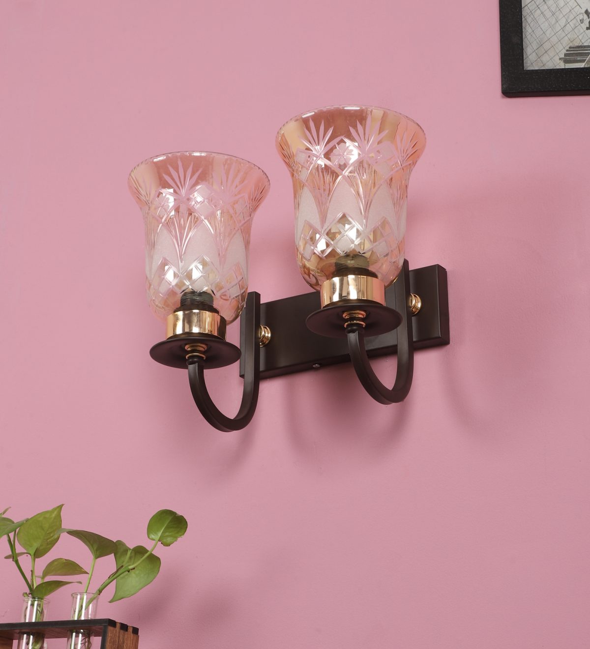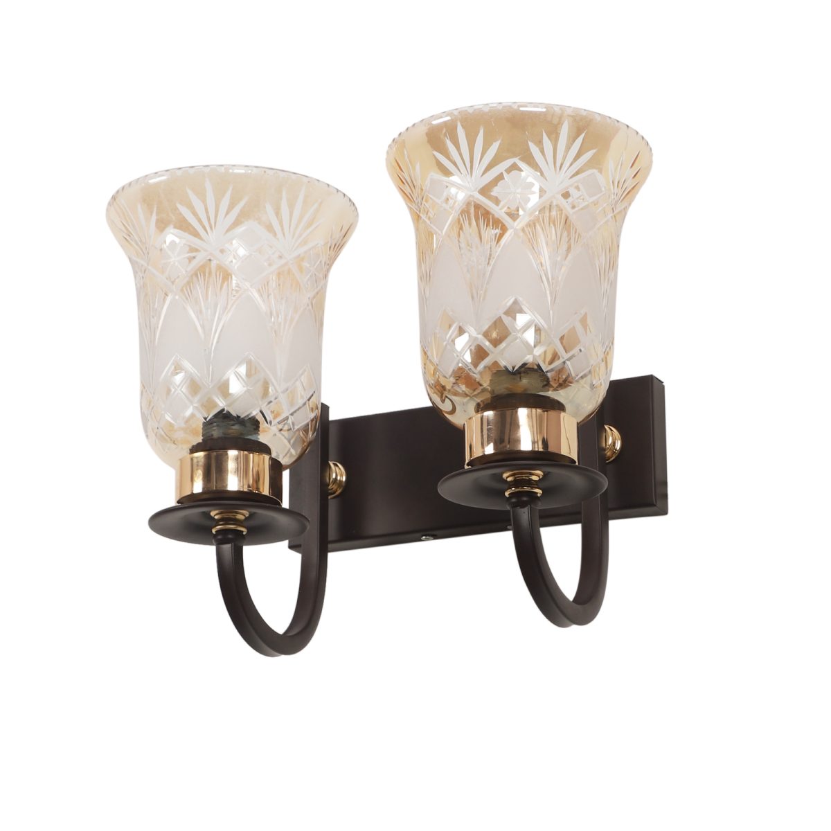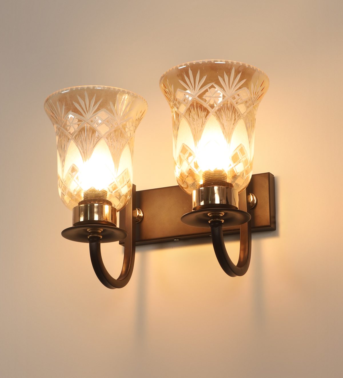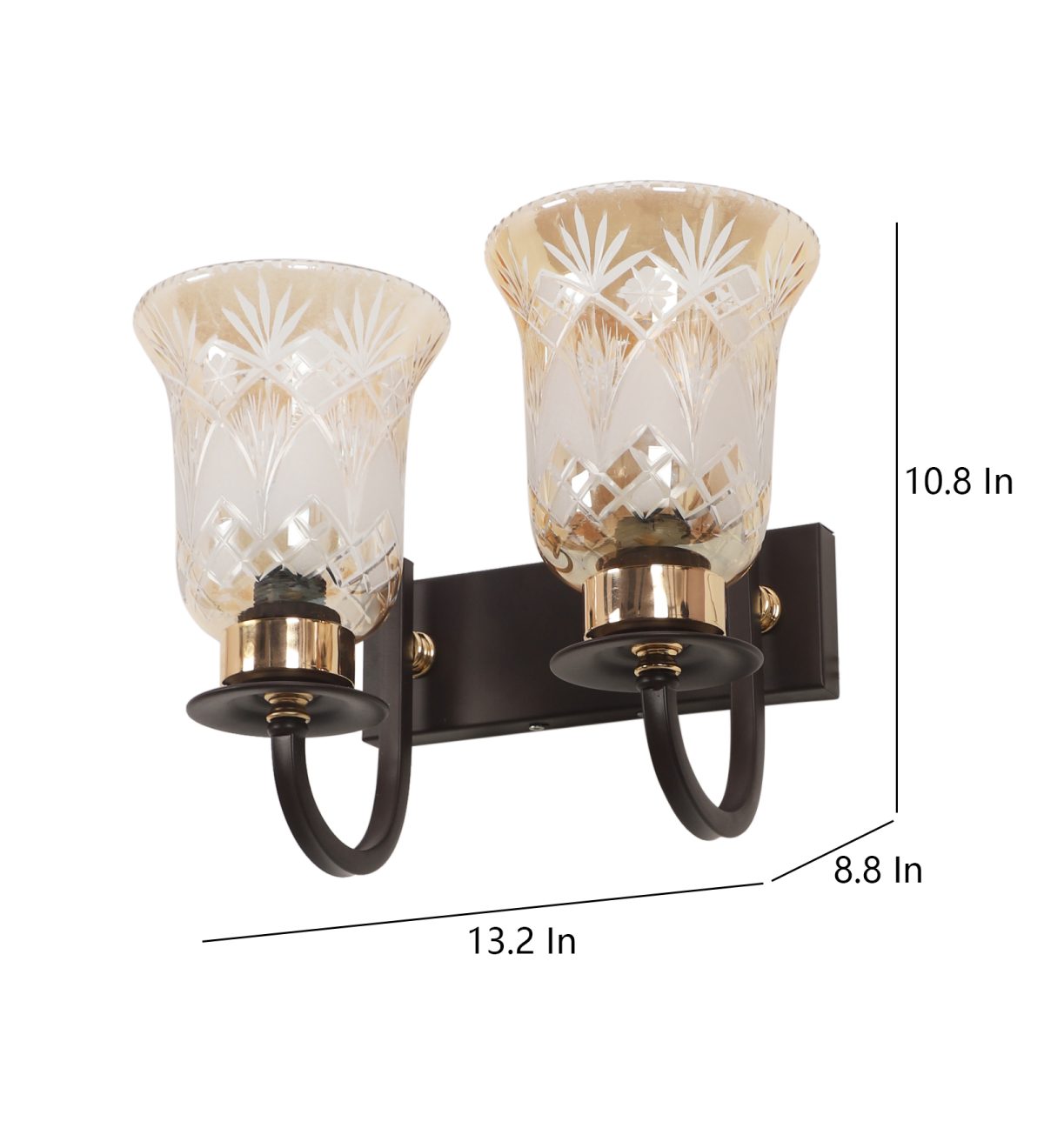 Dark brown finish double wall light having bell shaped glasses having engraved design mounted on a designer frame made of mild steel. It is maintenance free. It is easy to remove glasses and wash them. Comes with an E27 holder, only the change of lamp is required, which is available locally everywhere. Application includes both residential and commercial premises wherever it matches with your interiors. Can be customized as per requirement. LAMP NOT INCLUDED.