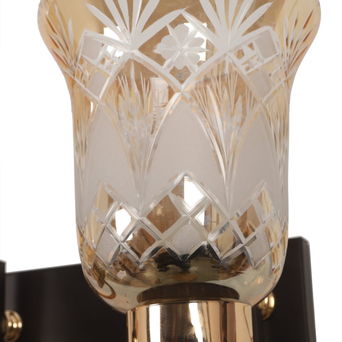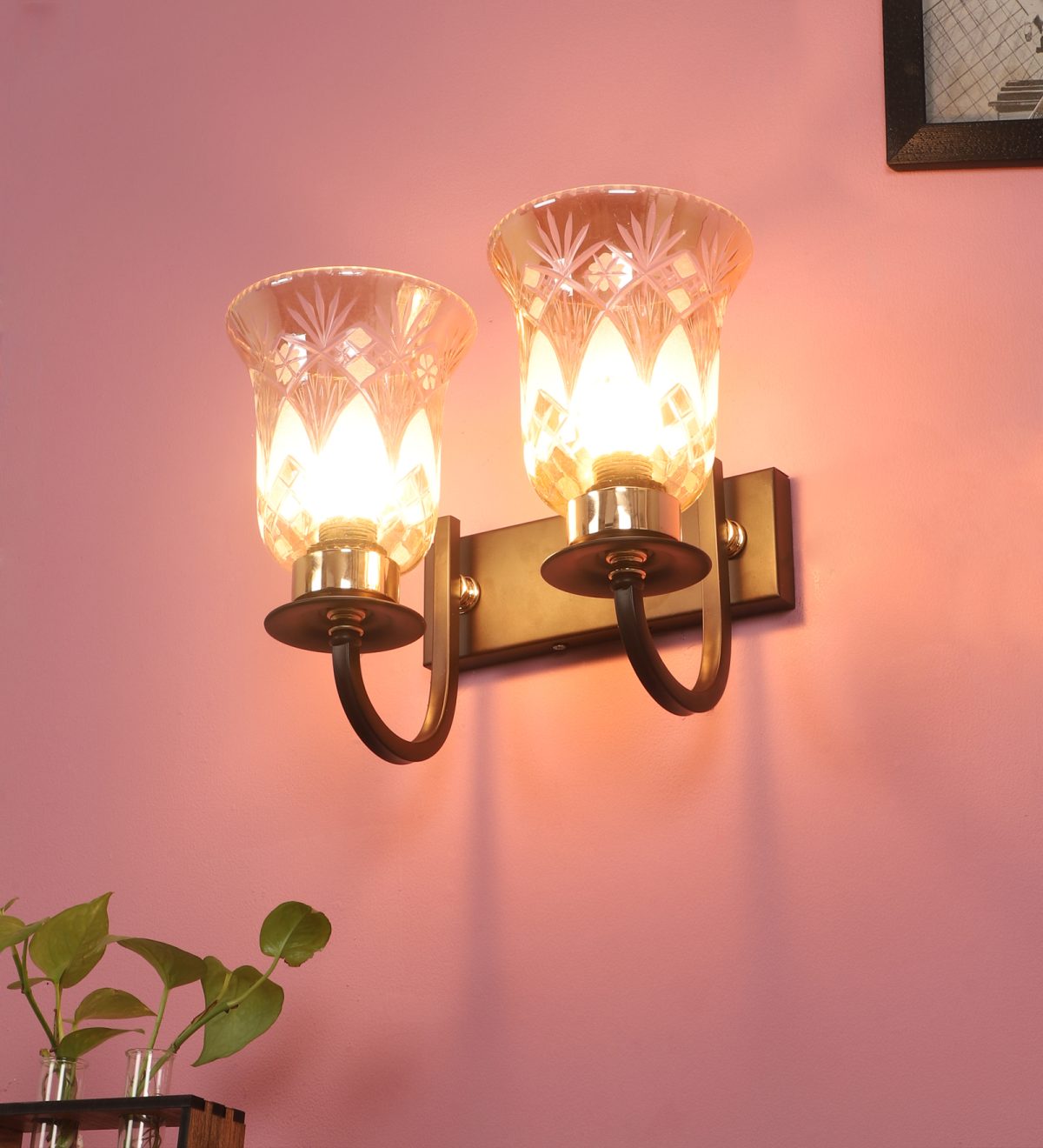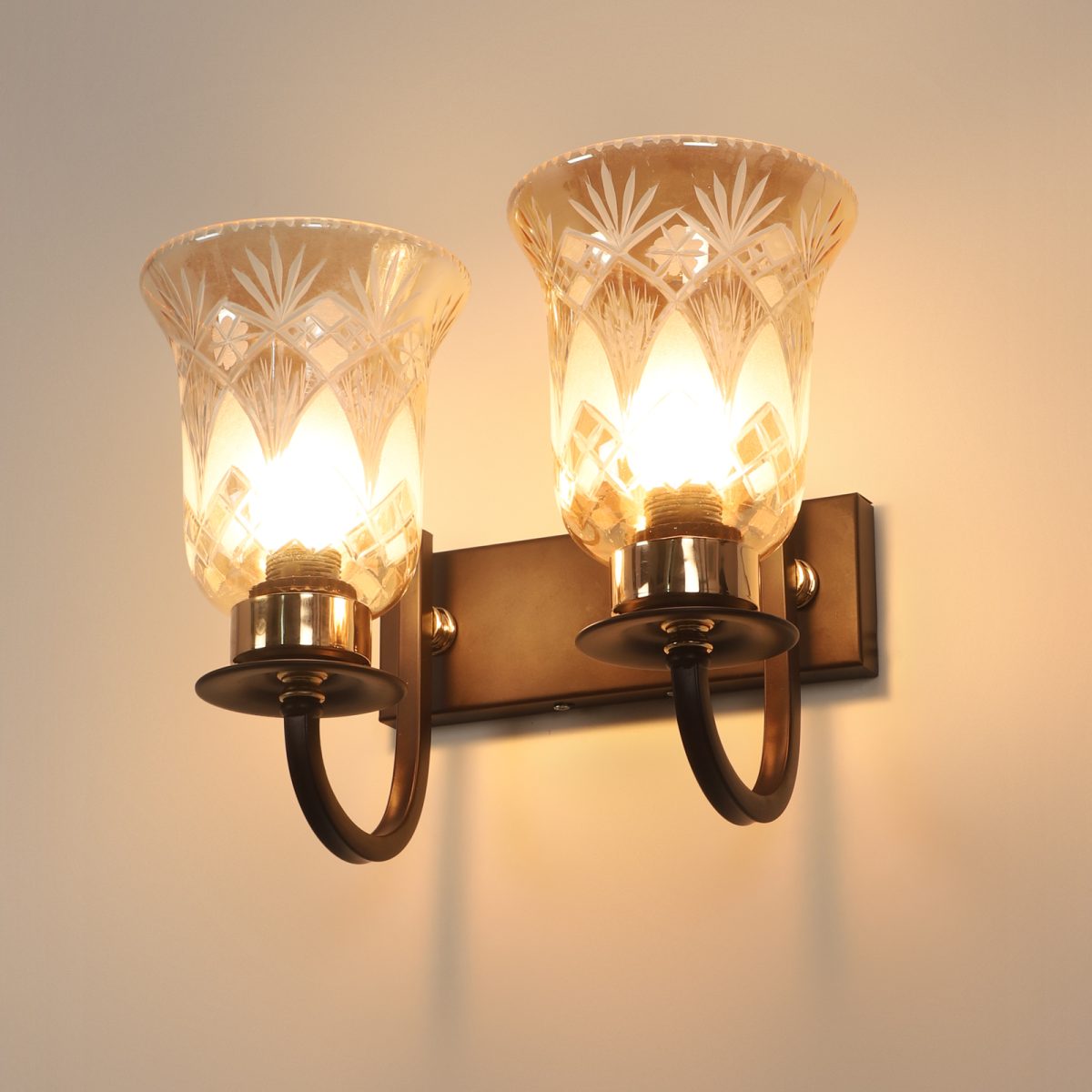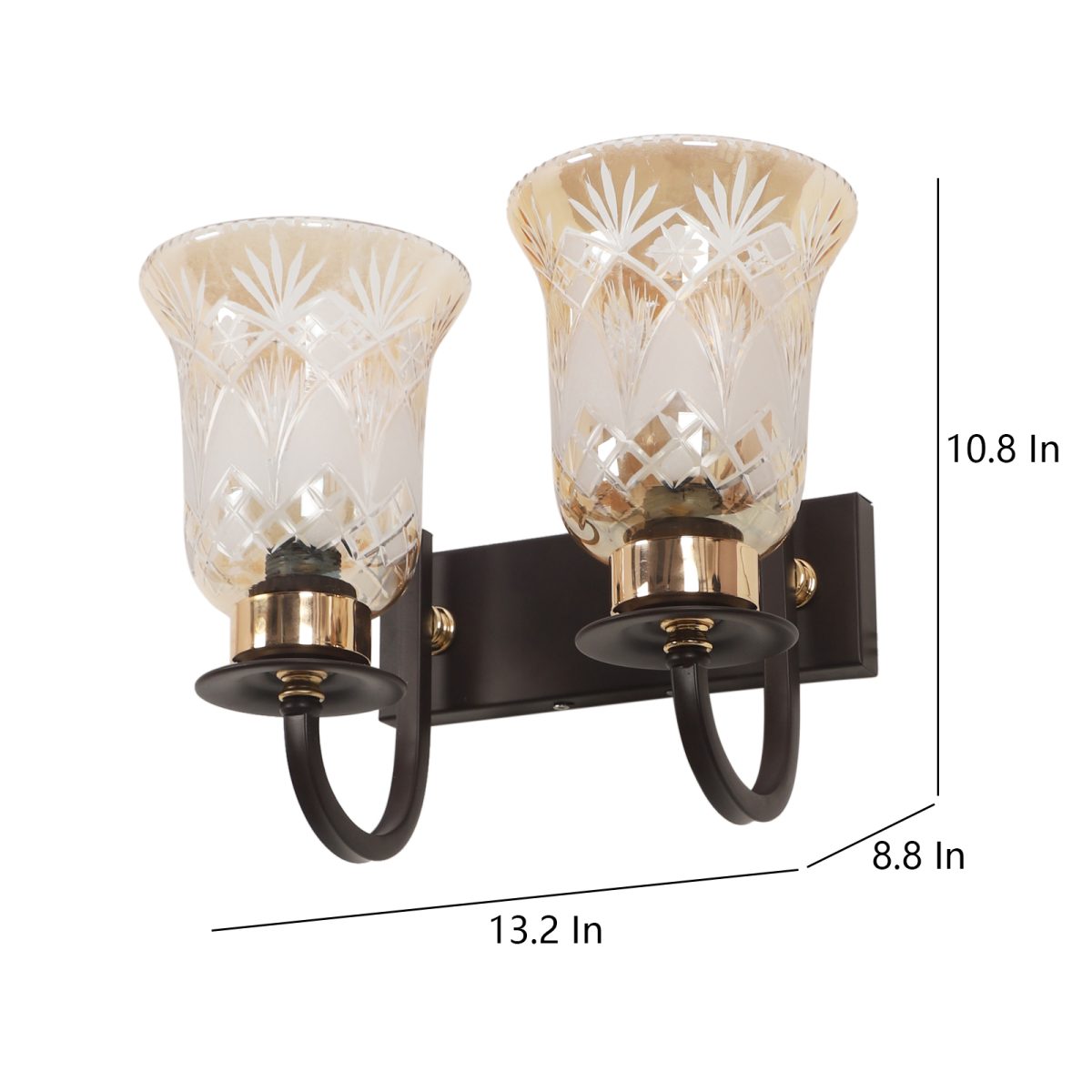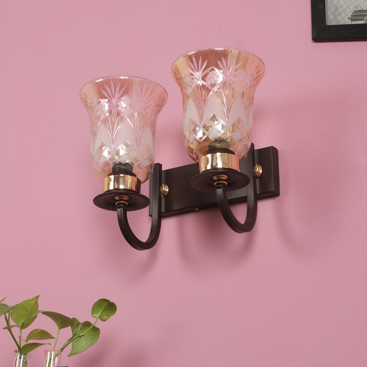 Dark brown finish double wall light having bell shaped glasses having engraved design mounted on a designer frame made of mild steel. It is maintenance free. It is easy to remove glasses and wash them. Comes with an E27 holder, only the change of lamp is required, which is available locally everywhere. Application includes both residential and commercial premises wherever it matches with your interiors. Can be customized as per requirement. LAMP NOT INCLUDED.