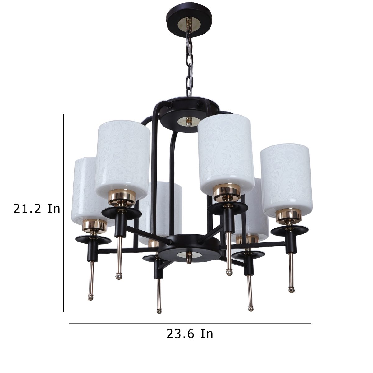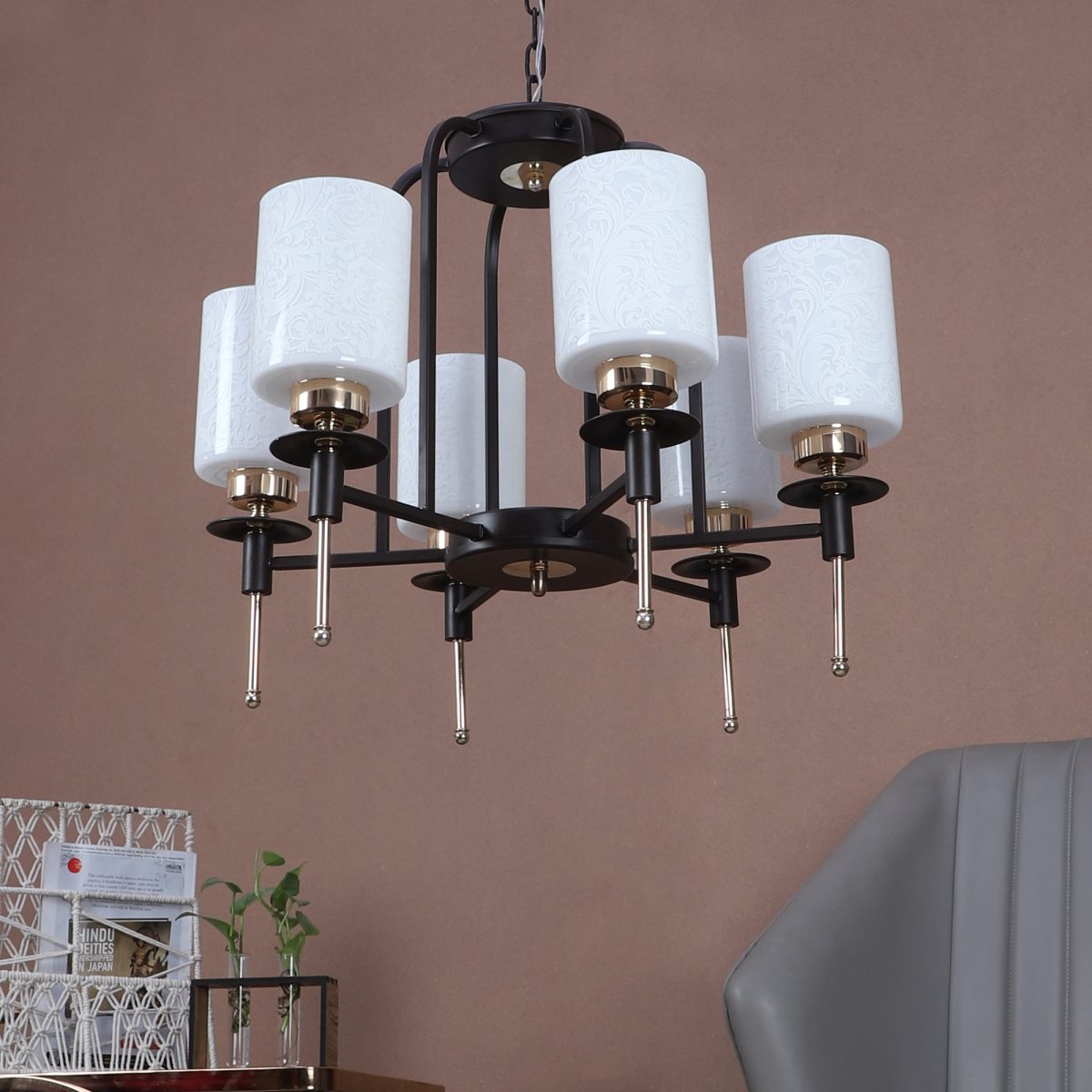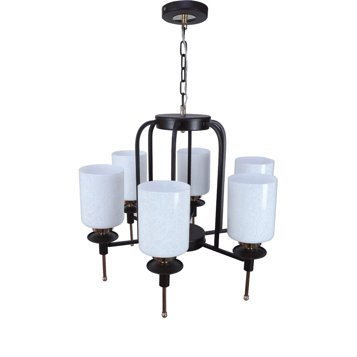 Dark brown, gold chandellier with round, cylindrical white glass with floral design mounted on a designer frame made of mild steel having six lights. This is a hanging type chandelier in which the base plate is fixed to the ceiling with the help of straight clamp and screws. The suspension can be adjusted at time of installation to the desired height. It is maintenance free, easy to remove glasses and wash them. Comes with an E27 holder, only the change of lamp is required, which is available locally everywhere. Application includes both residential and commercial premises wherever it matches with your interiors. Can be customized as per requirement. LAMP NOT INCLUDED.