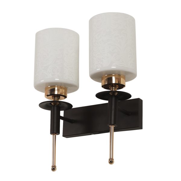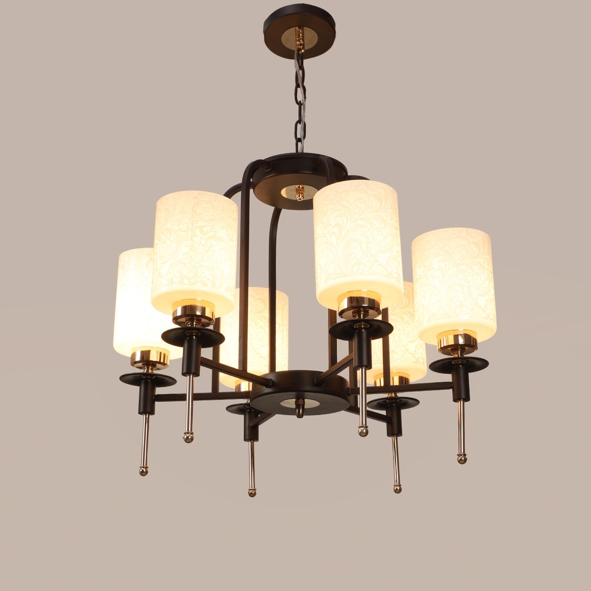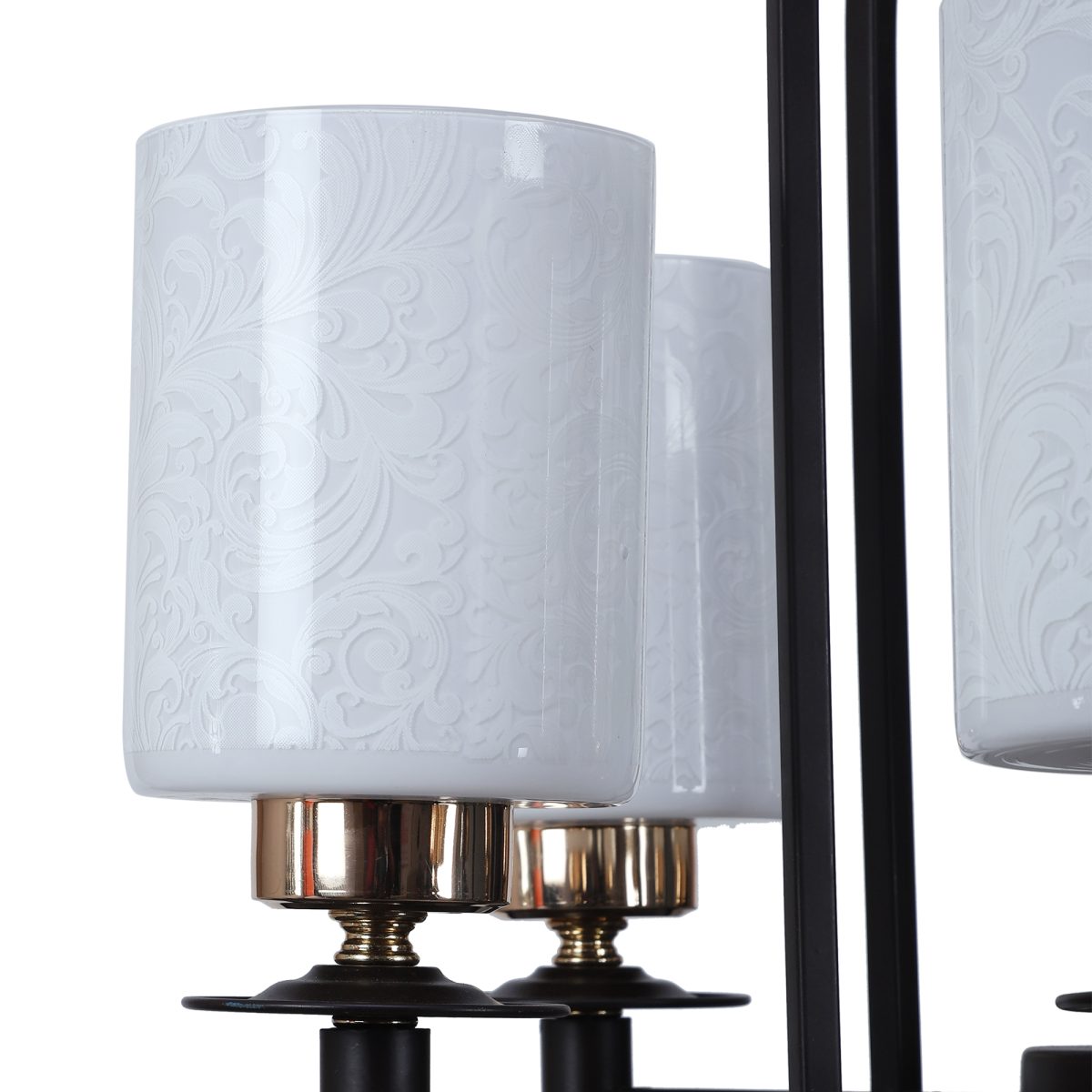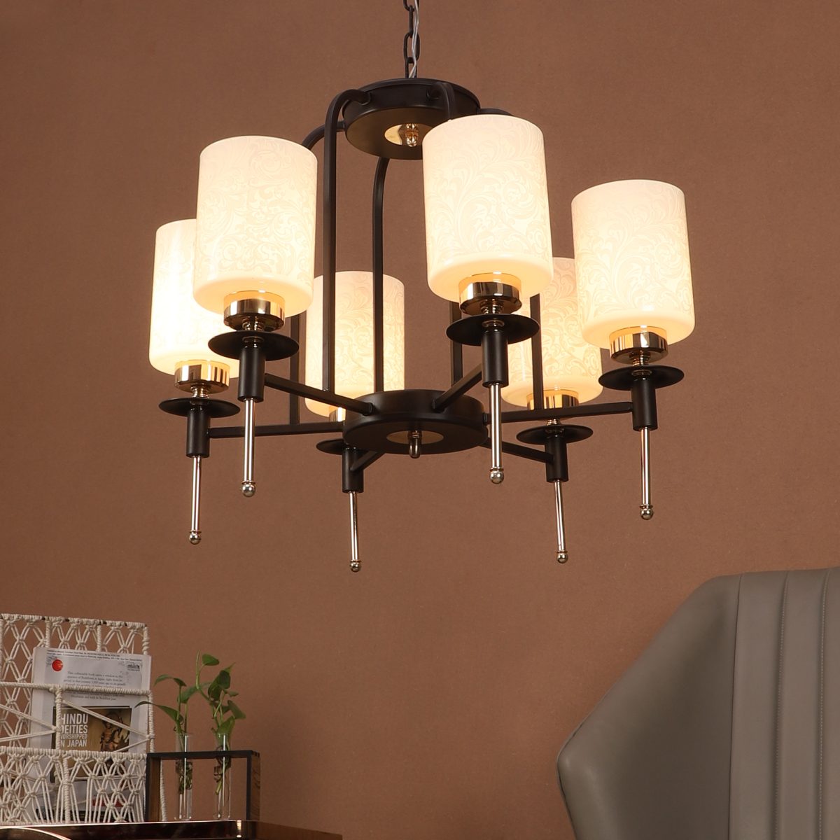 Dark brown, gold chandellier with round, cylindrical white glass with floral design mounted on a designer frame made of mild steel having six lights. This is a hanging type chandelier in which the base plate is fixed to the ceiling with the help of straight clamp and screws. The suspension can be adjusted at time of installation to the desired height. It is maintenance free, easy to remove glasses and wash them. Comes with an E27 holder, only the change of lamp is required, which is available locally everywhere. Application includes both residential and commercial premises wherever it matches with your interiors. Can be customized as per requirement. LAMP NOT INCLUDED.