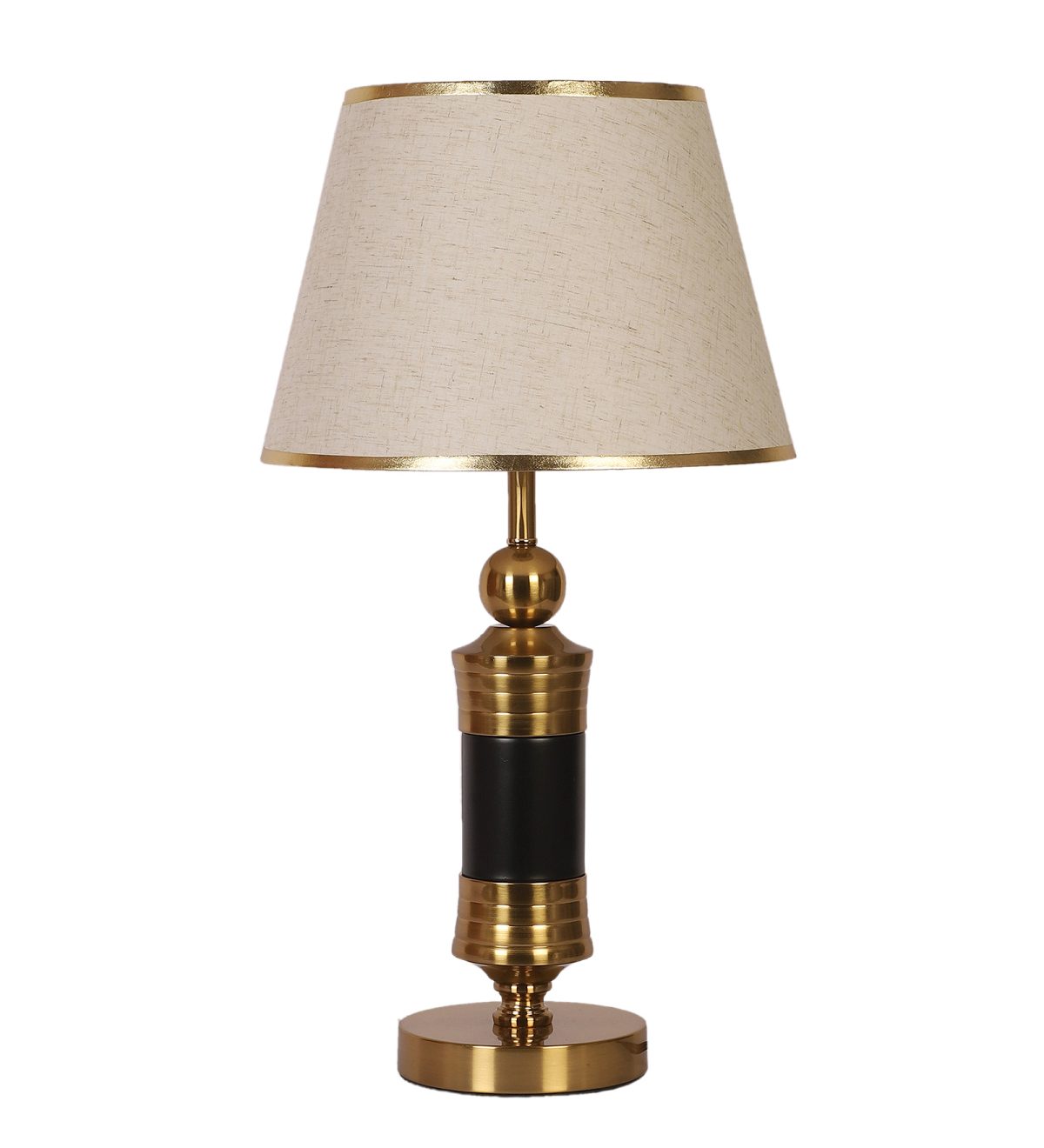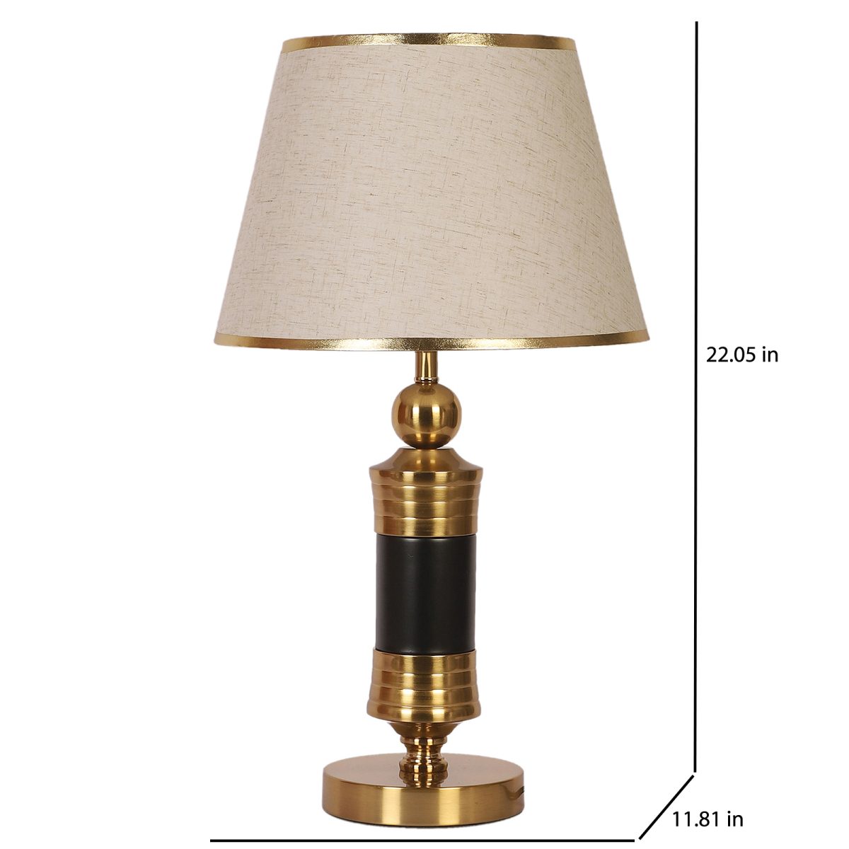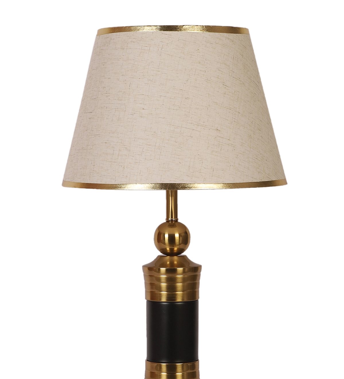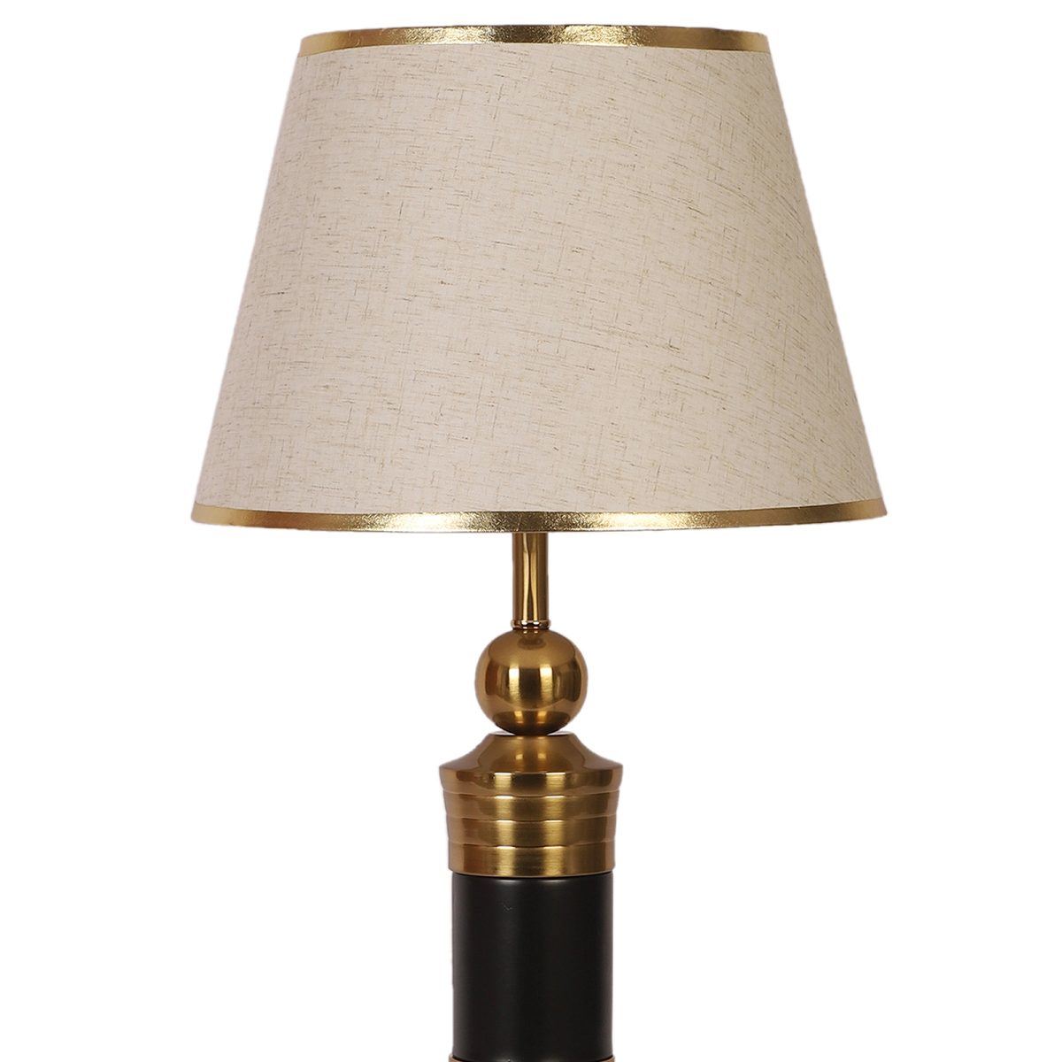 LEARC gold bronze and black finish table lamp with cream textured shade having golden border. LAMP NOT INCLUDED.