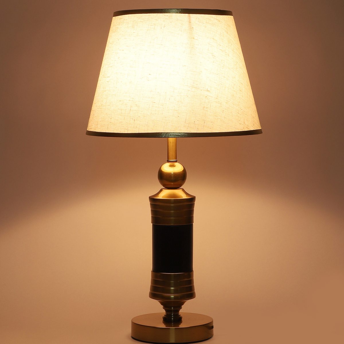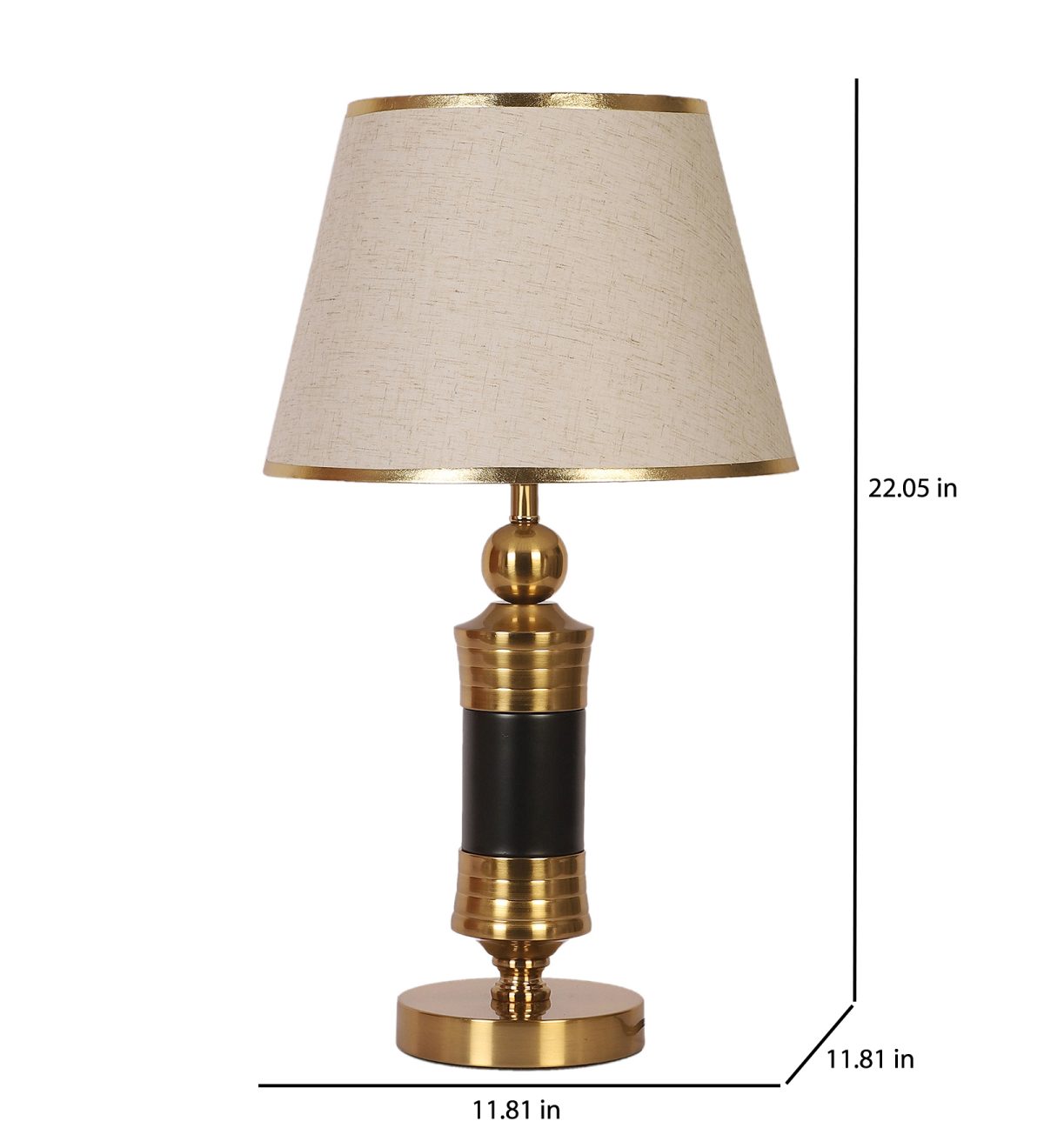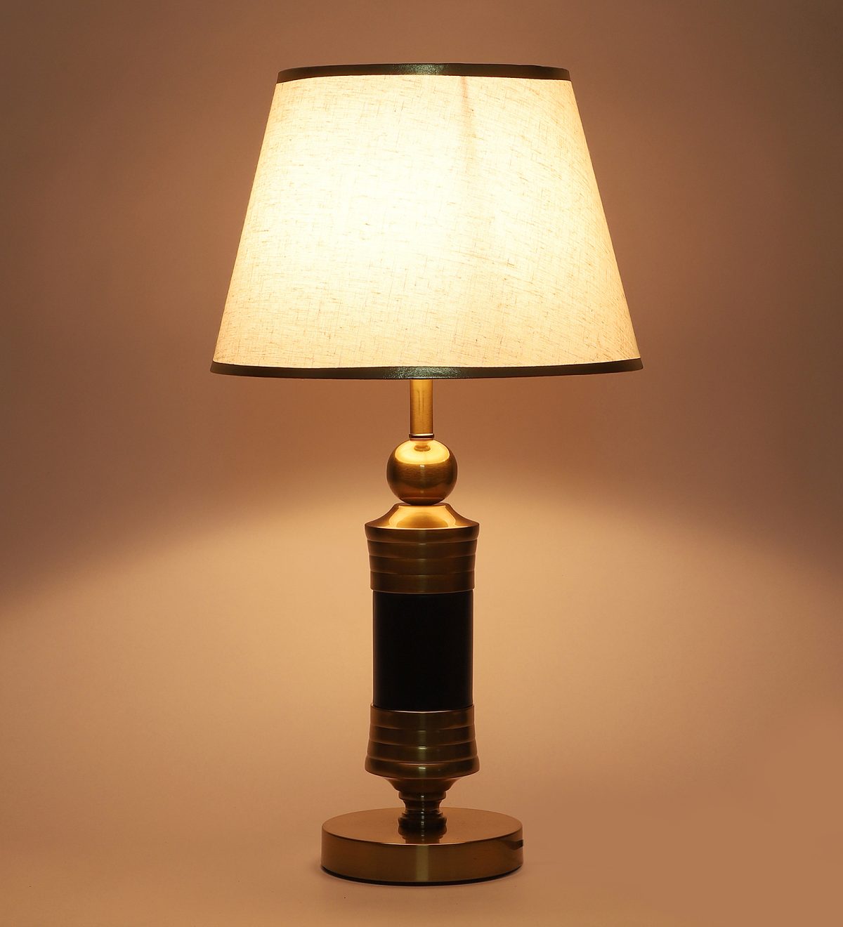LEARC gold bronze and black finish table lamp with cream textured shade having golden border. LAMP NOT INCLUDED.