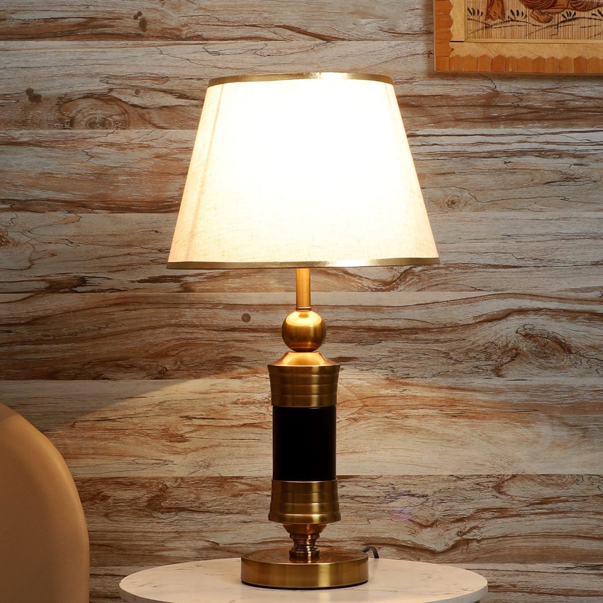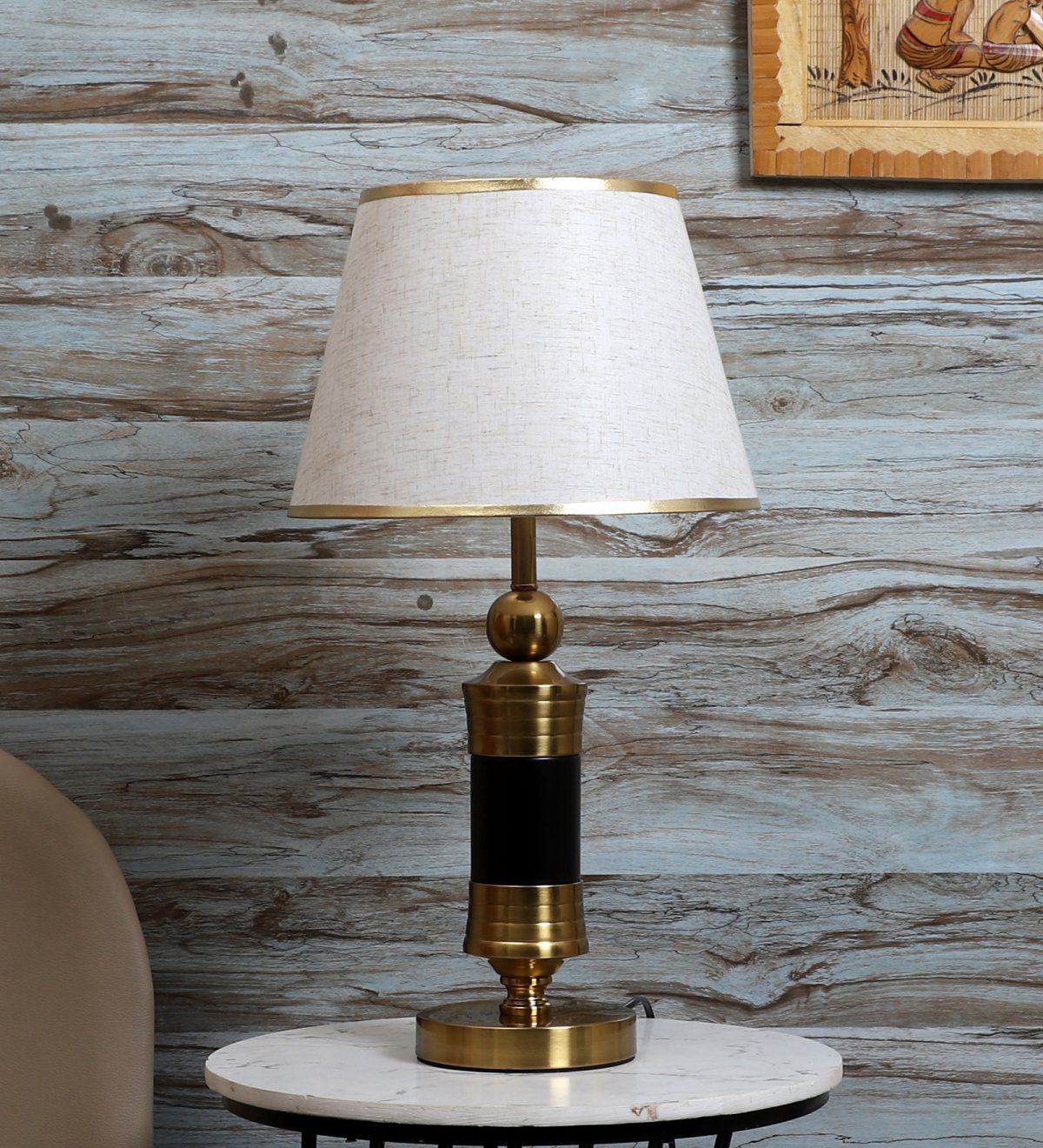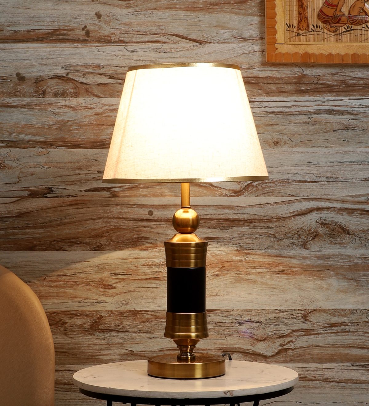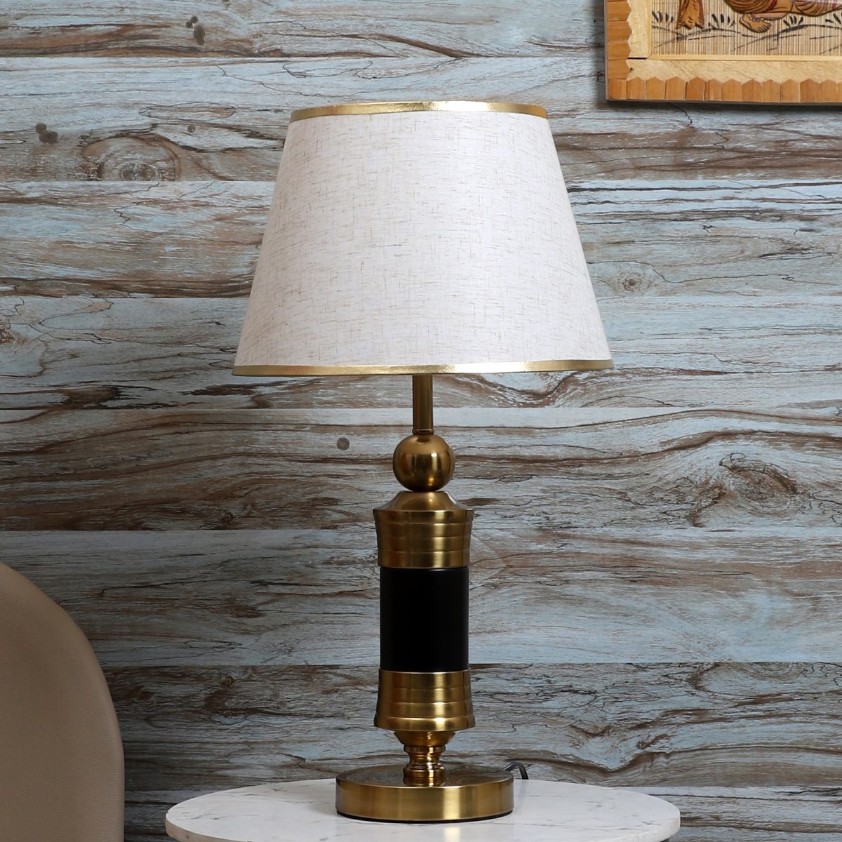 LEARC gold bronze and black finish table lamp with cream textured shade having golden border. LAMP NOT INCLUDED.