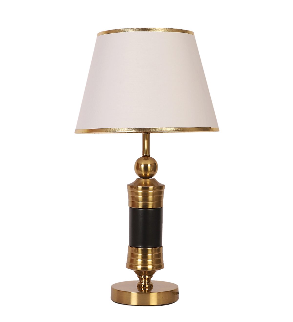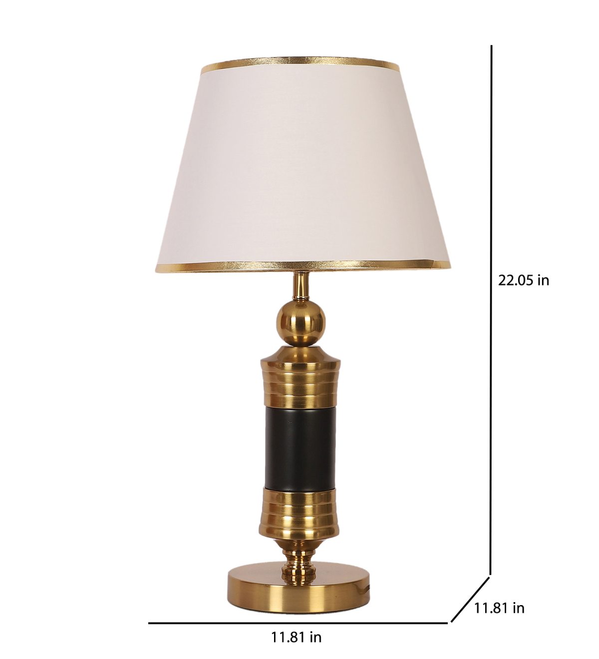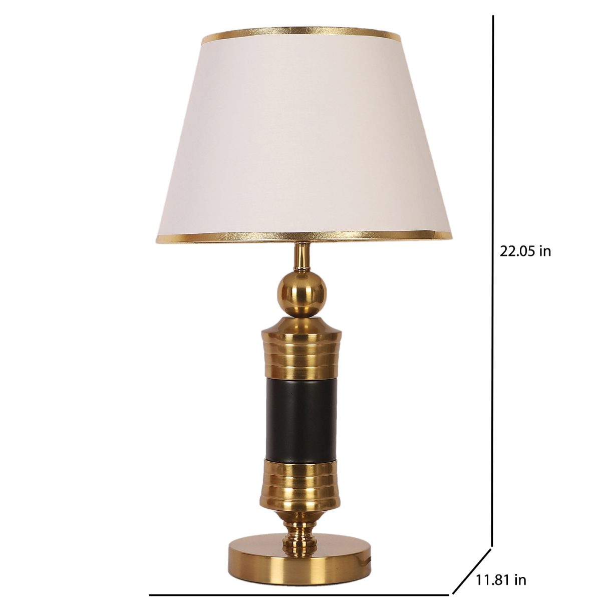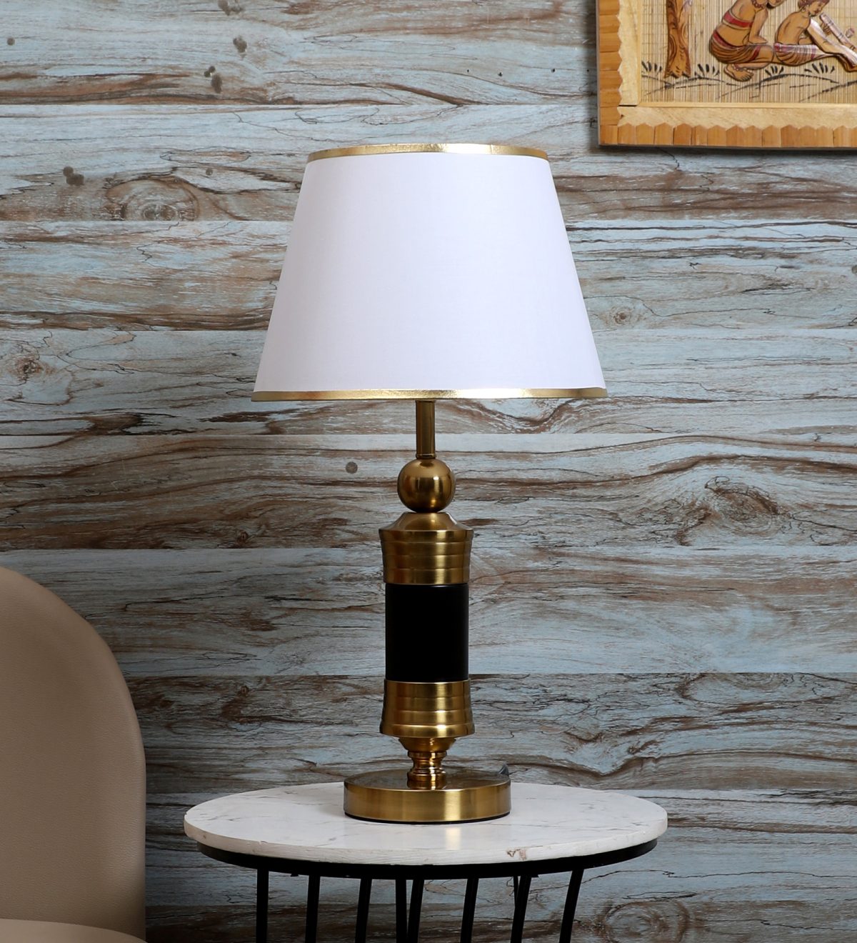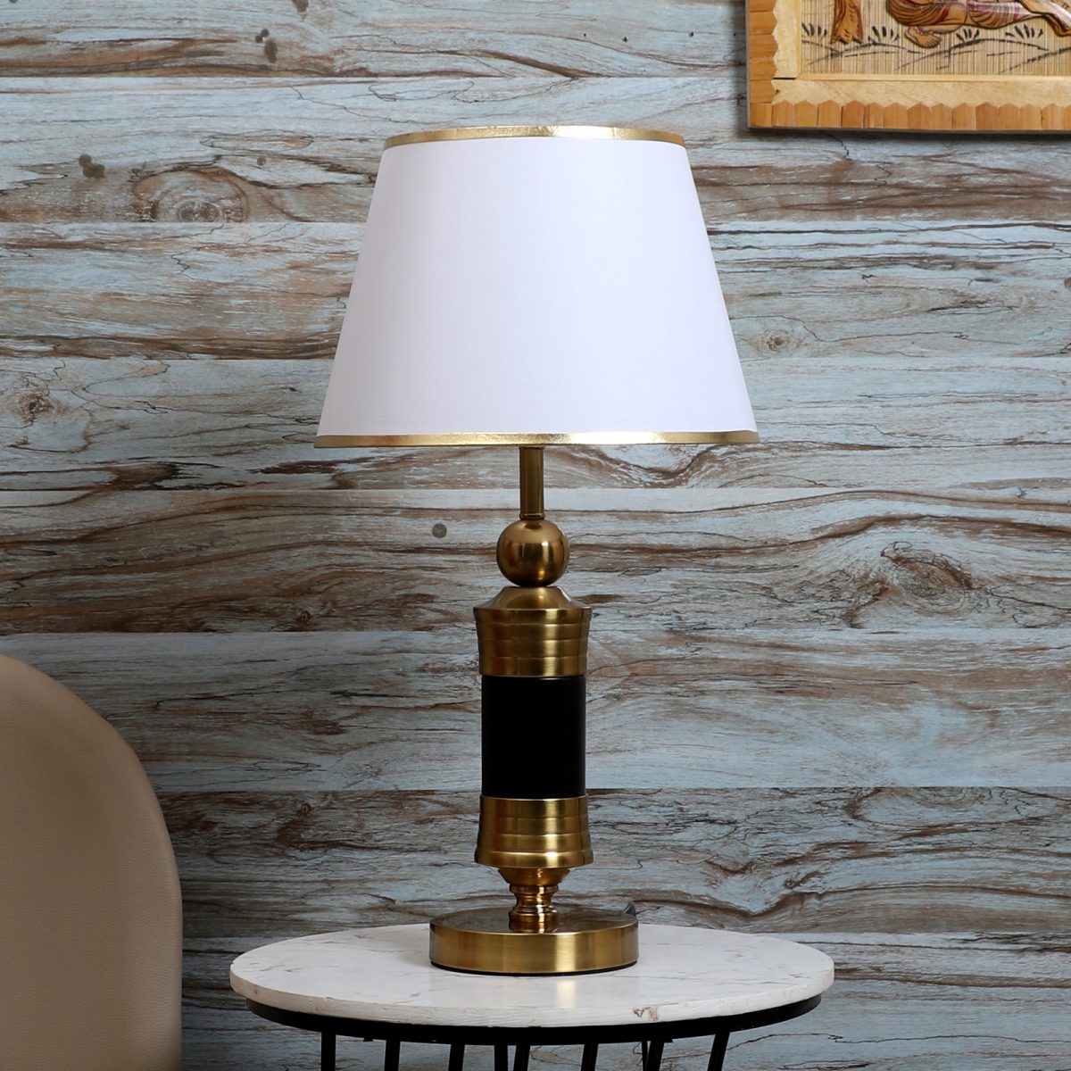 LEARC gold bronze and black finish table lamp with white shade having golden border. LAMP NOT INCLUDED.