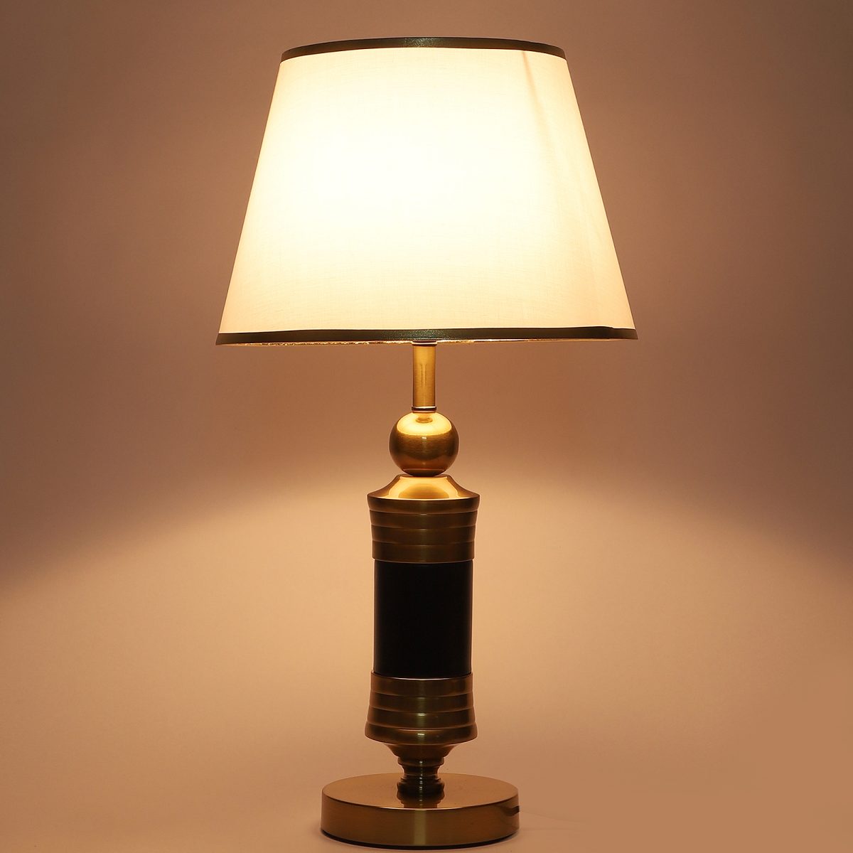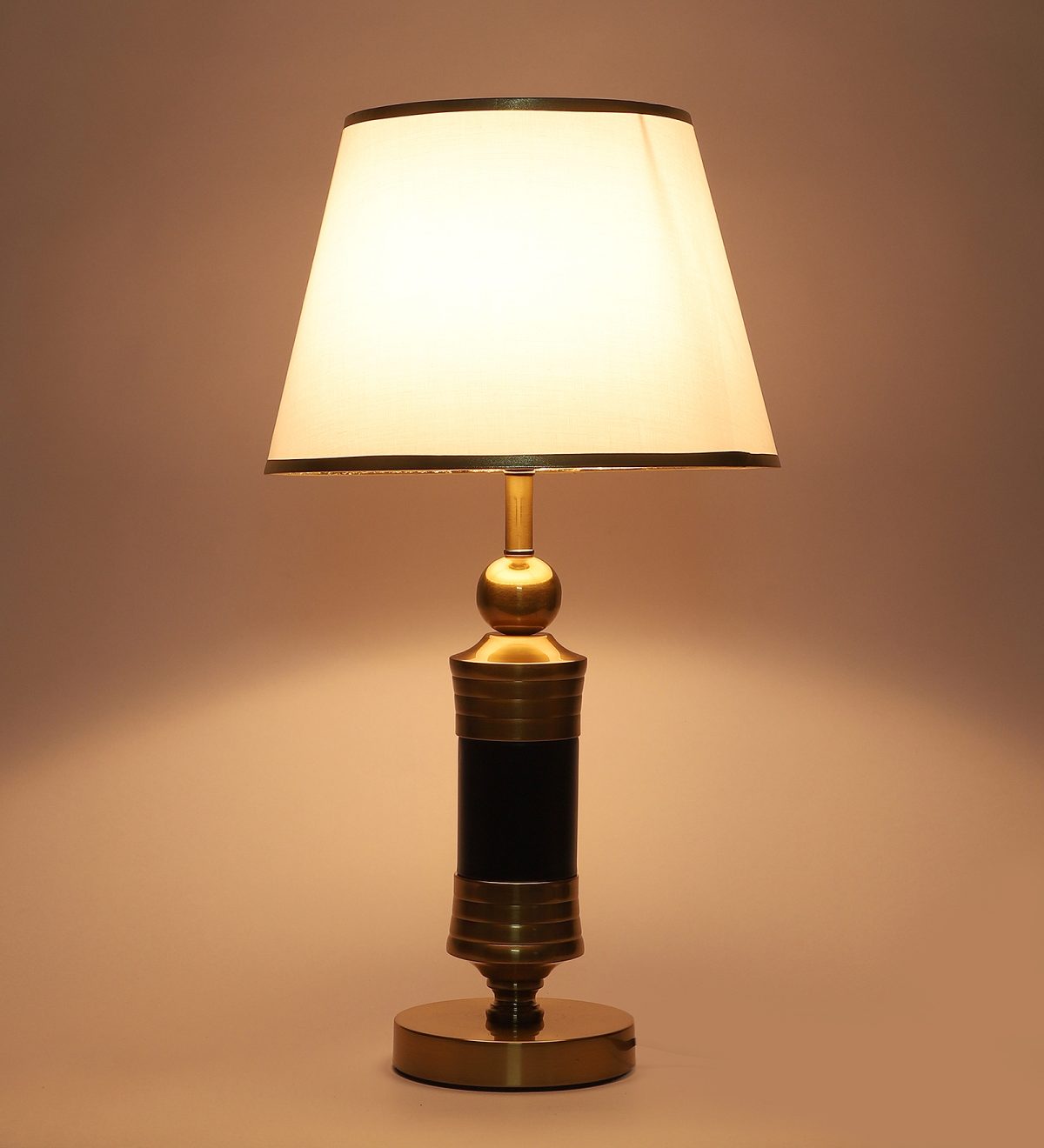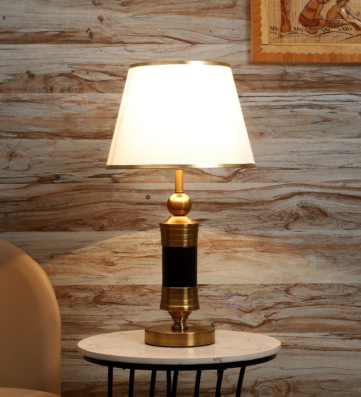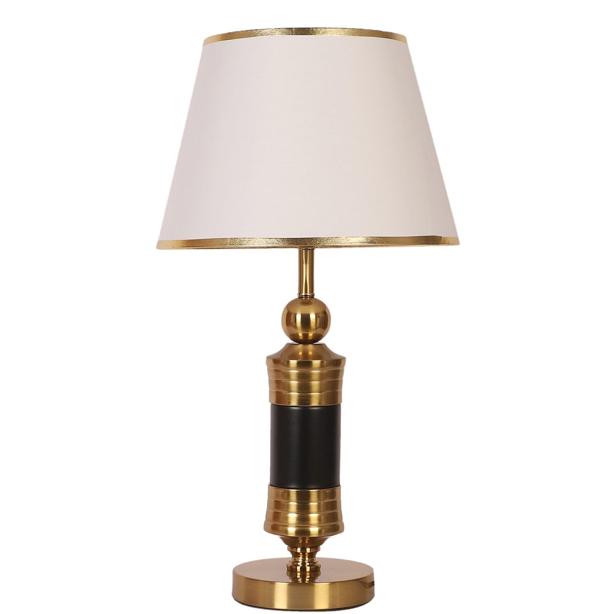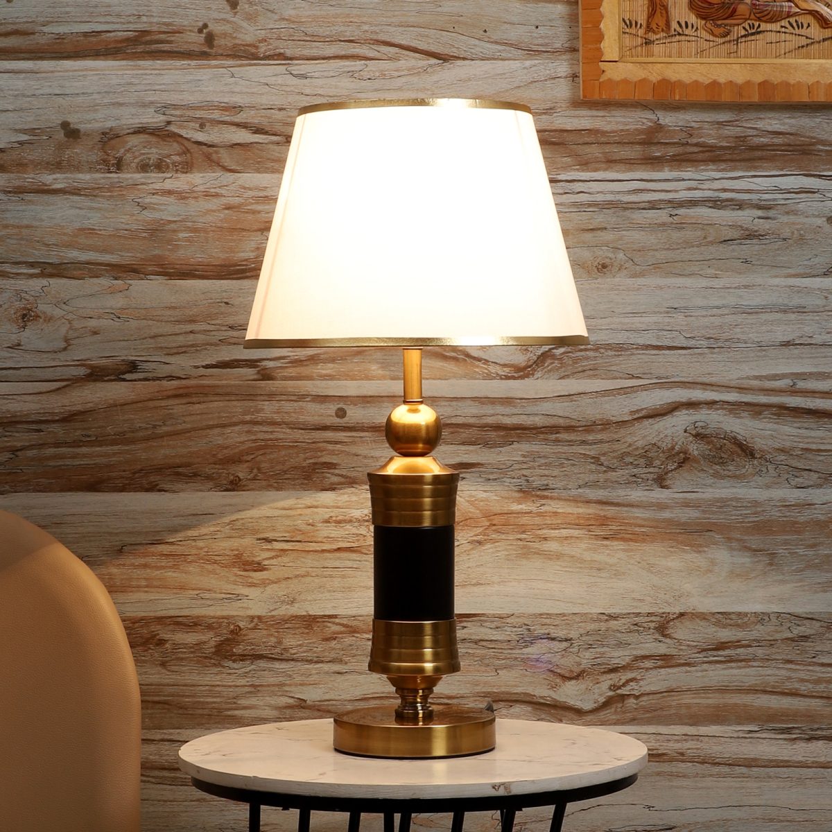 LEARC gold bronze and black finish table lamp with white shade having golden border. LAMP NOT INCLUDED.