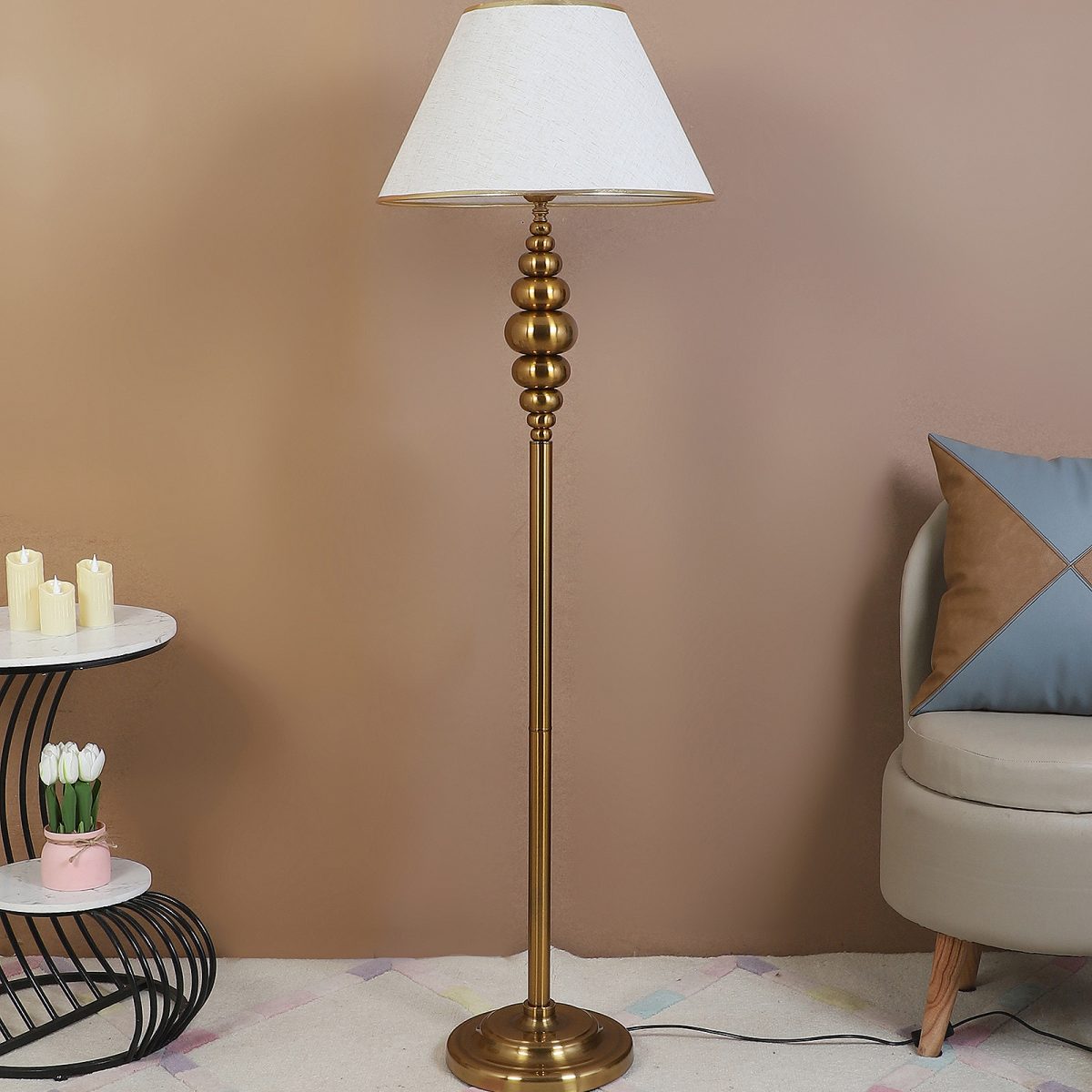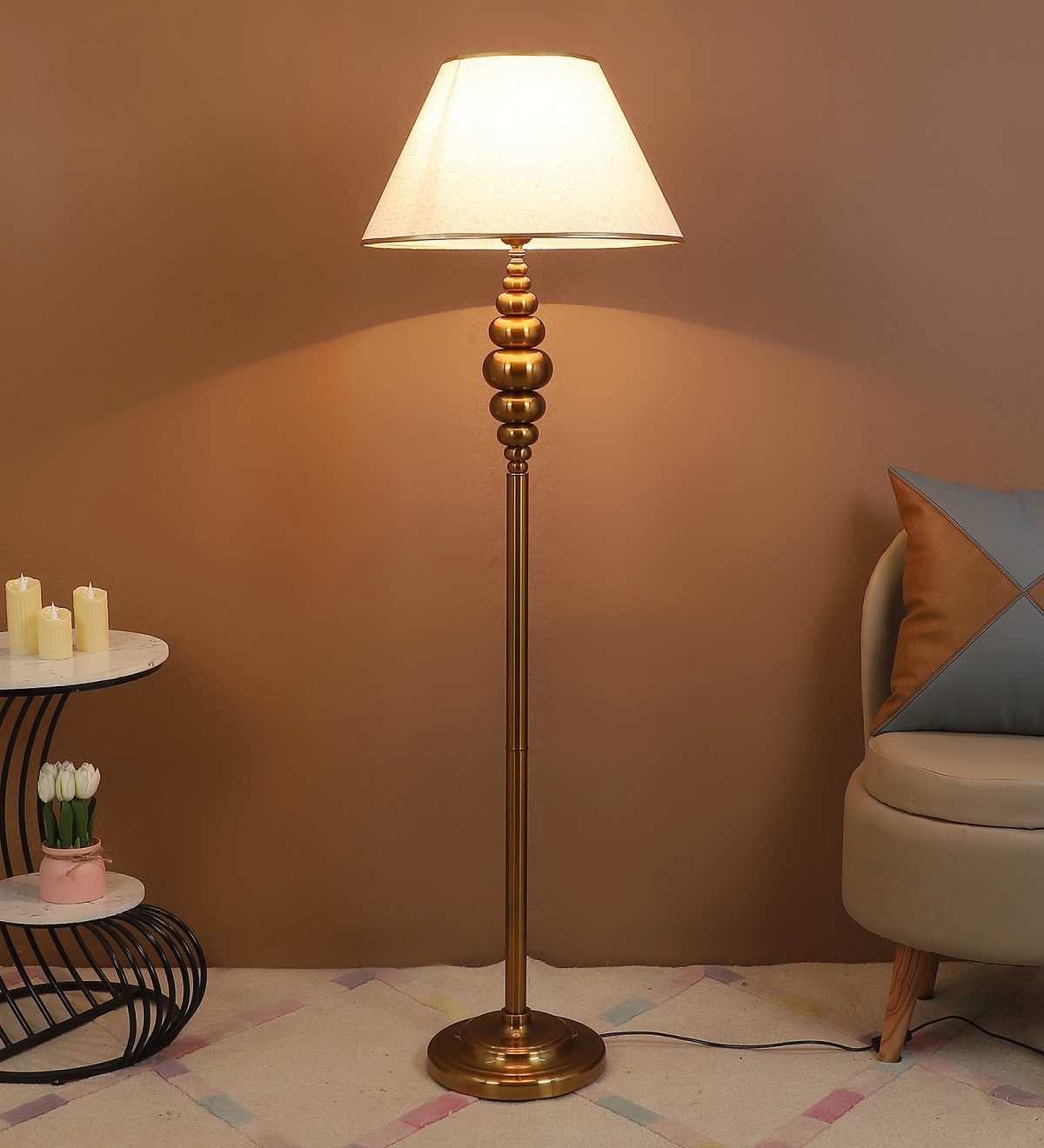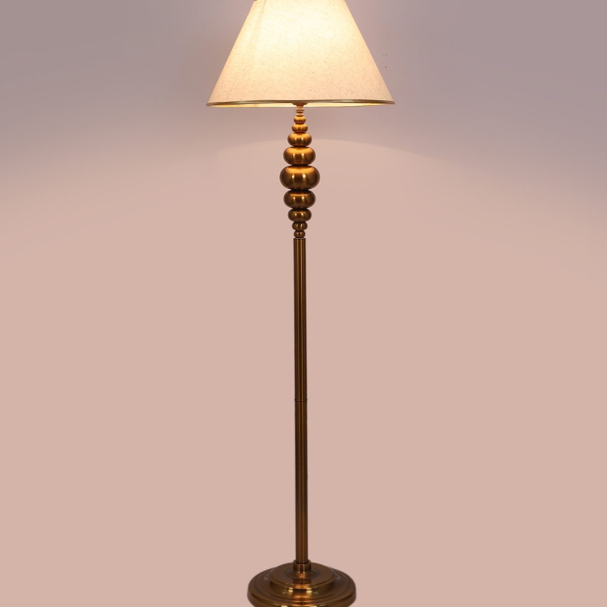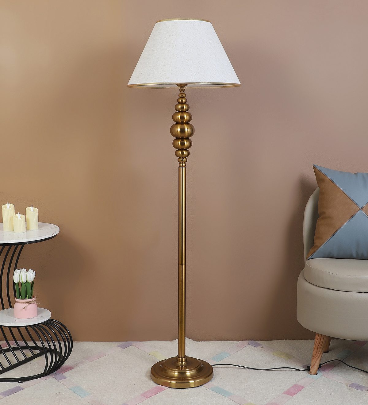 LEARC gold bronze finish floor lamp with cream textured shade having golden border. LAMP NOT INCLUDED.