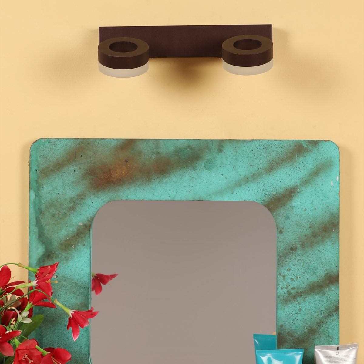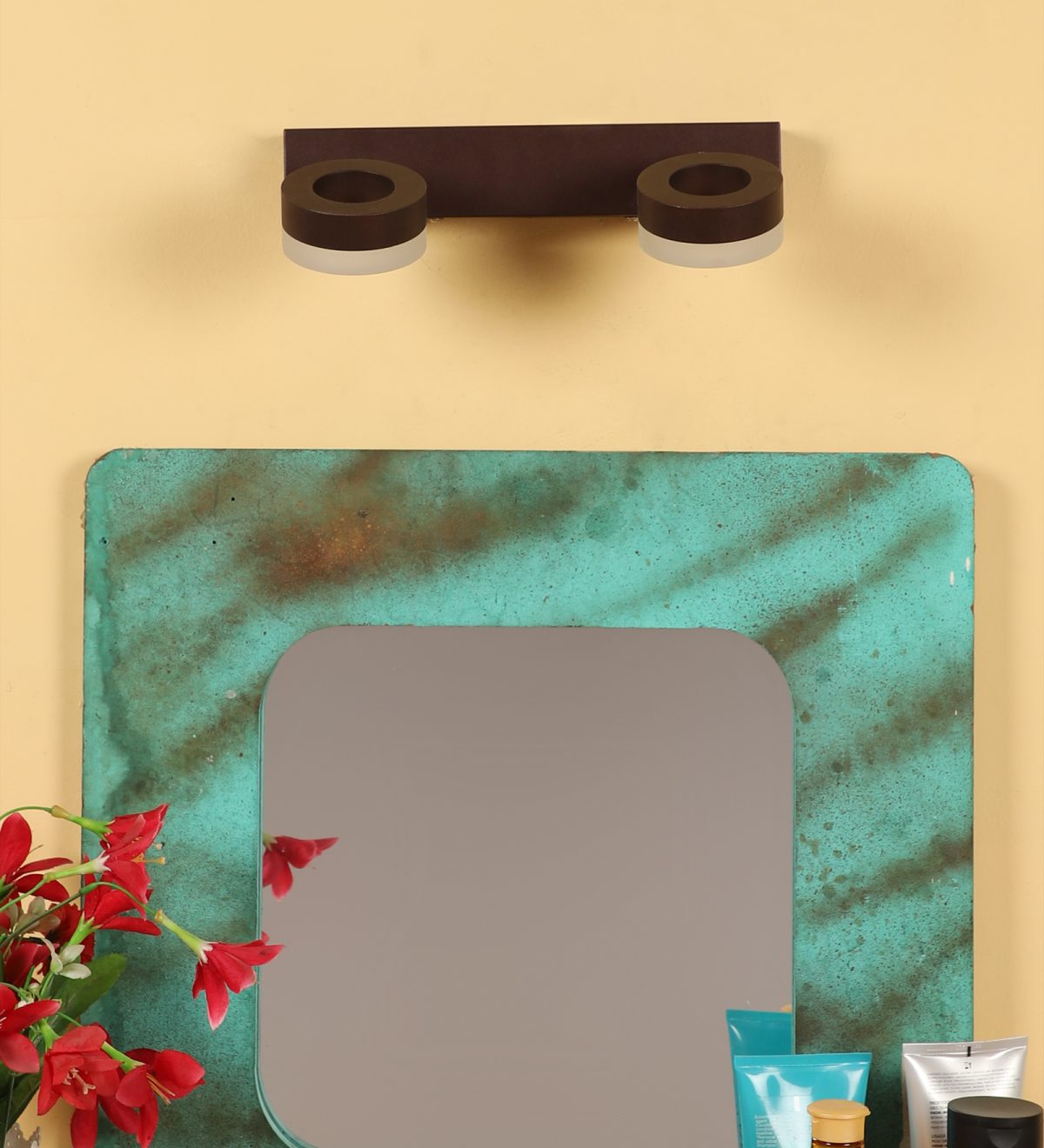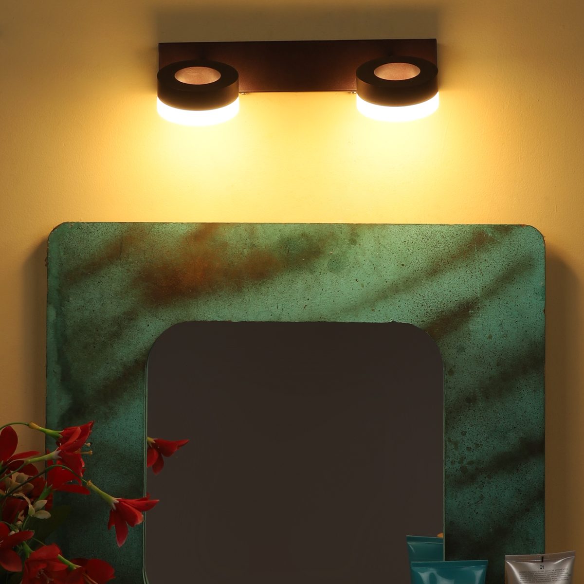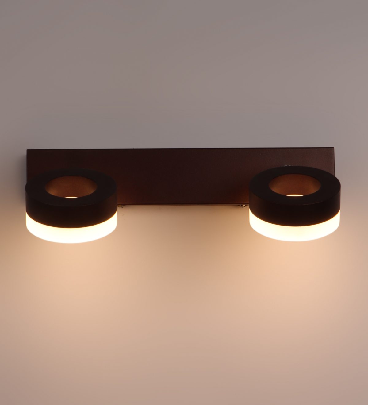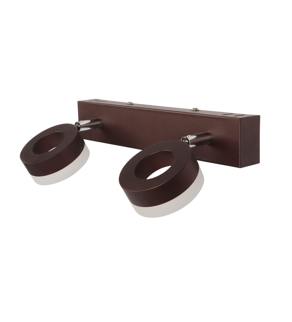 Aluminium, mild steel, dark brown finish double spot light using high quality LED and driver with high success rate having less than 0.5% replacement with warm white (yellow) light output. Great for installation above a dressing mirror, dressing table to provide illumination while applying make-up. It can also be used as a wall light, spot light, ceiling spot light bed side light, picture light. The lighting spot can be adjusted to any required position. Also availble in single spot option with code ML404-1.