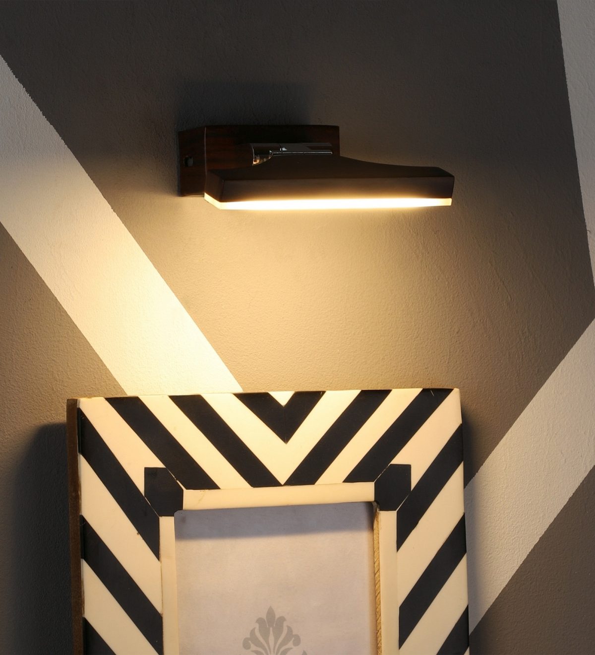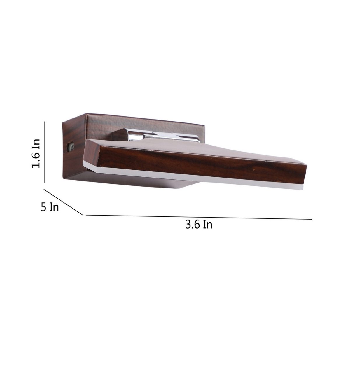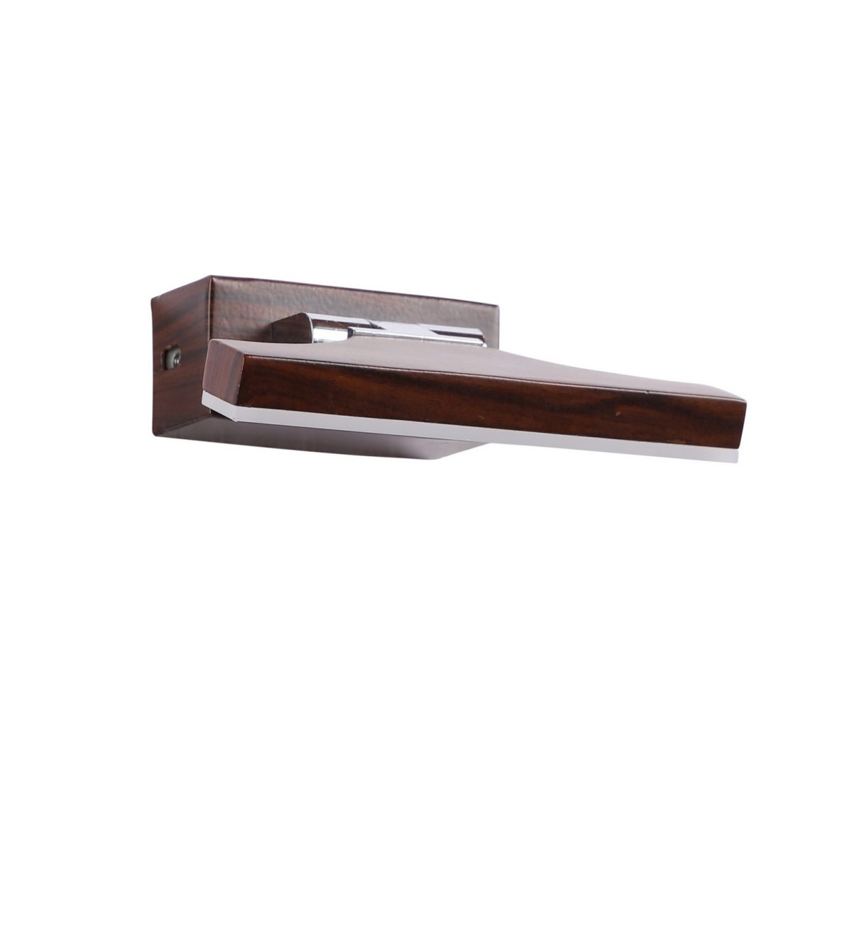 Exclusive dark brown (wood finish) LED picture light using high quality LED and driver with high success rate having less than 0.5% replacement with warm white (yellow) light output. It features one adjustible point. It is usually placed over the painting or a photo frame on the wall. Can also be used above the mirror. Its premium quality wood finish makes it one of the best selling product in our catalogue. Also available in white finish with code ML334-S. It can be made in silver, antique, copper, and black finish in case of bulk requirement.