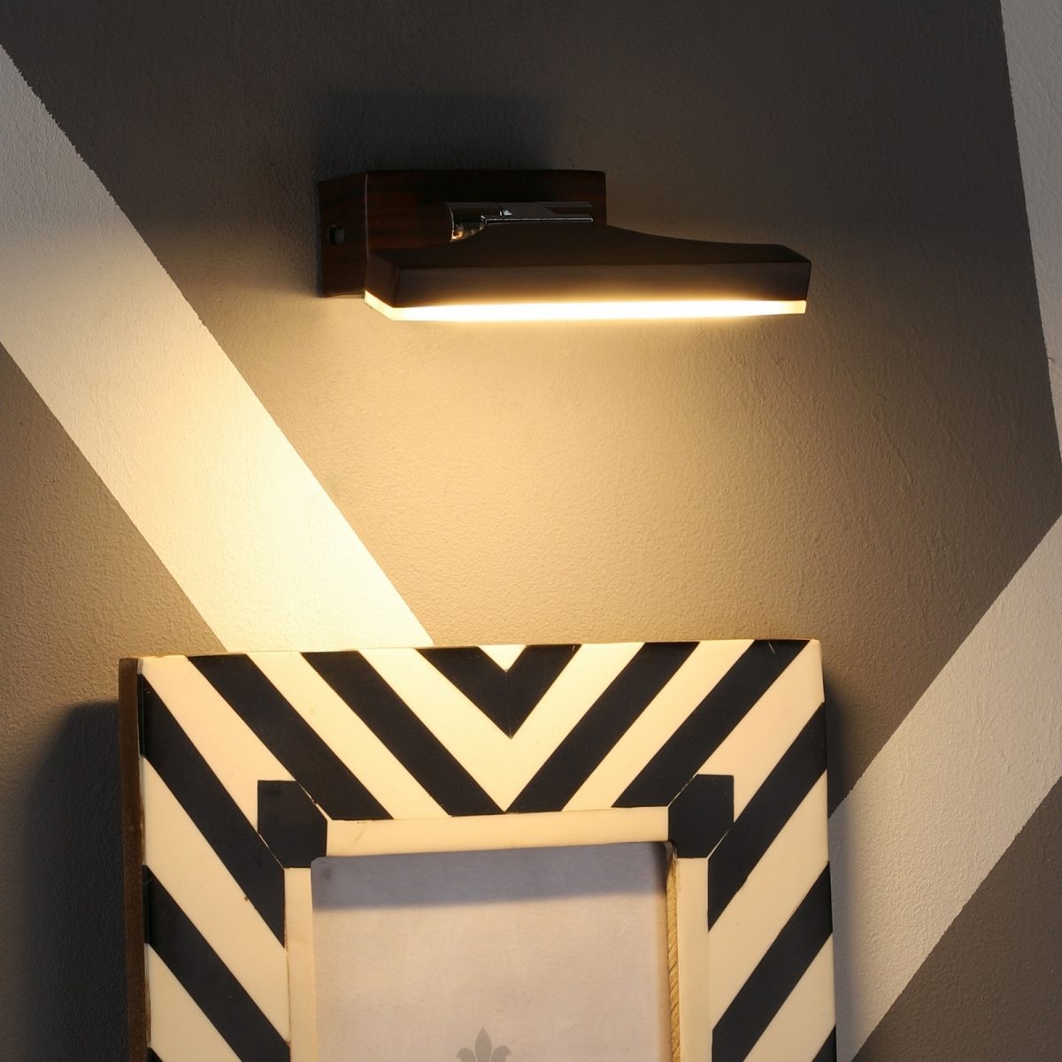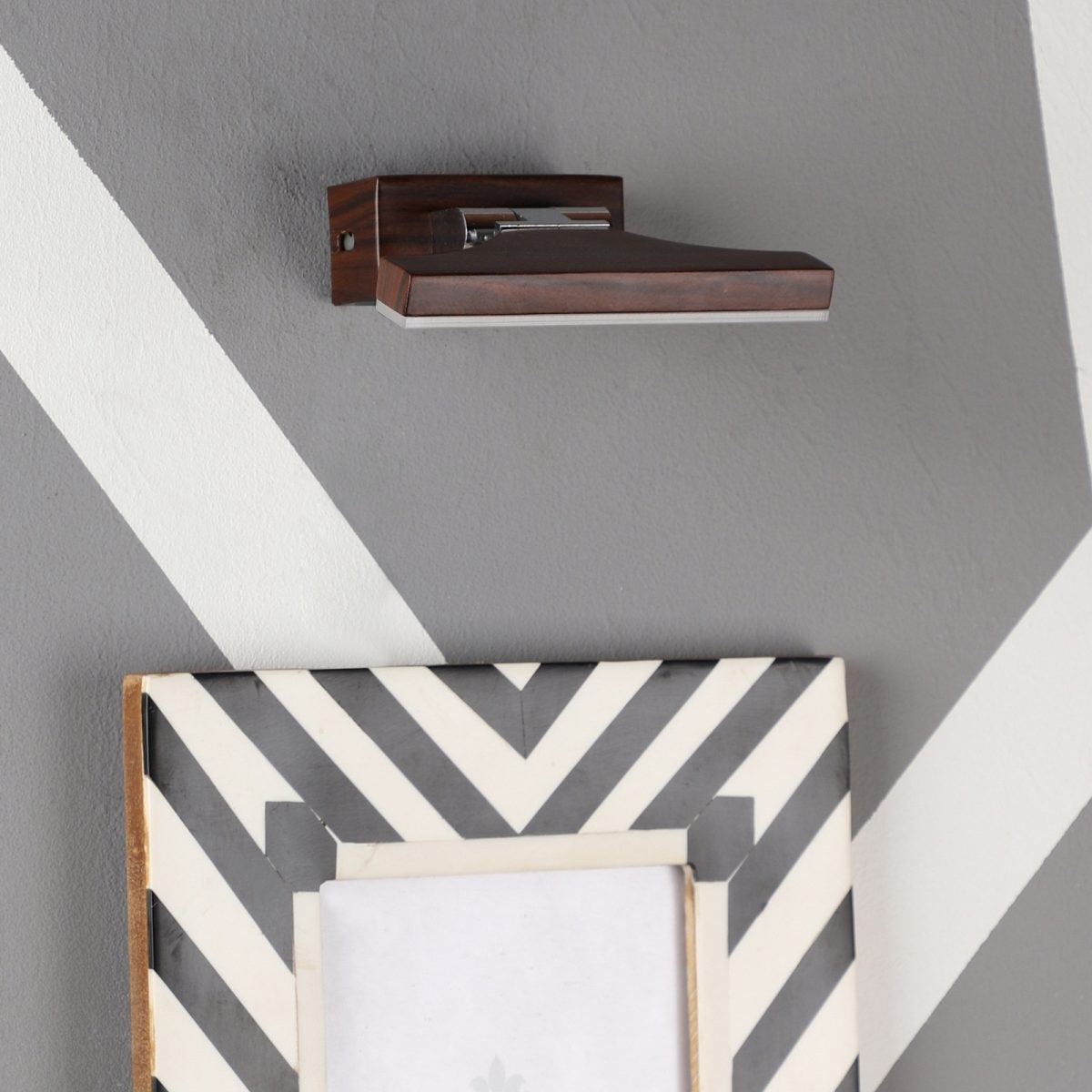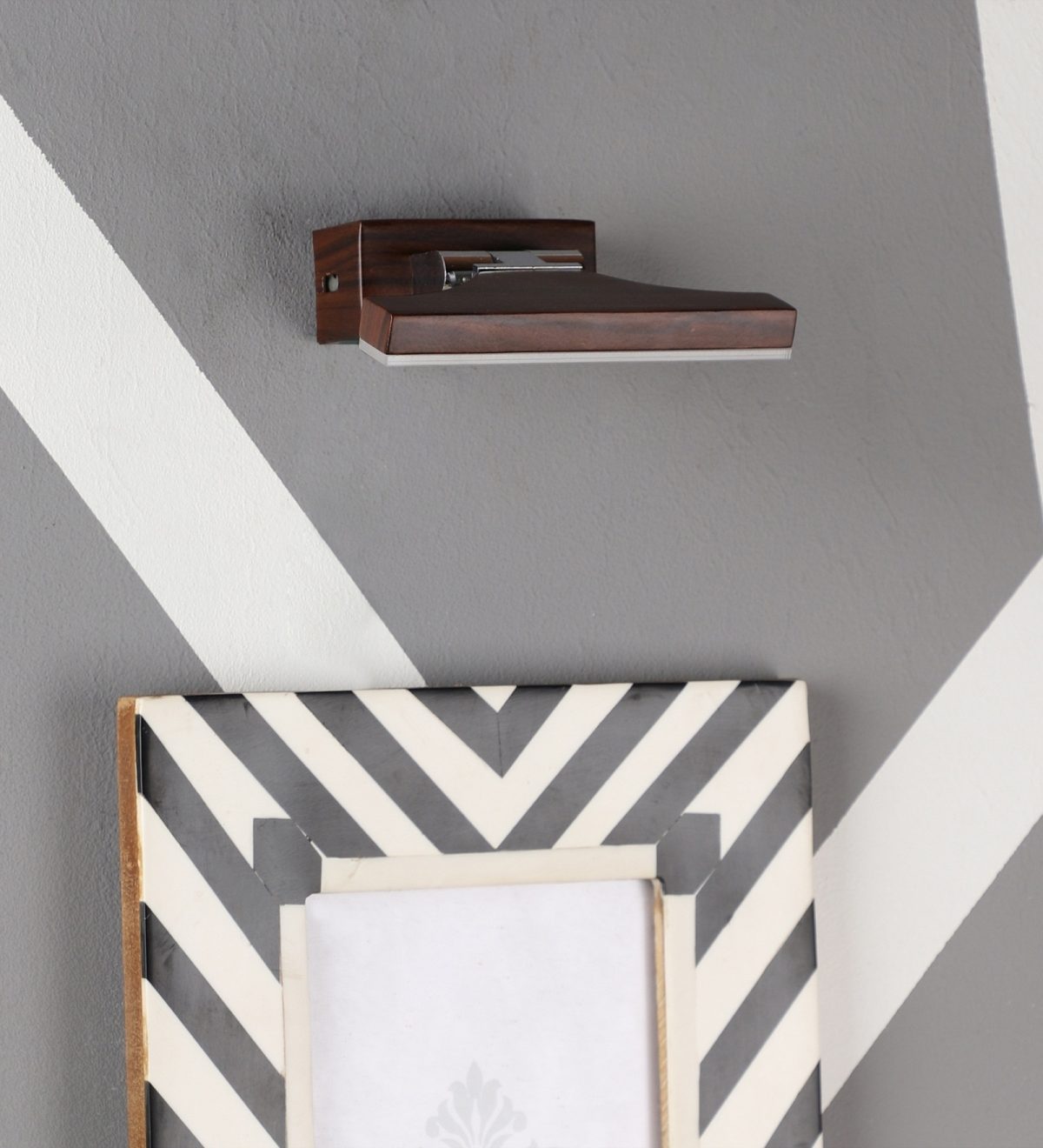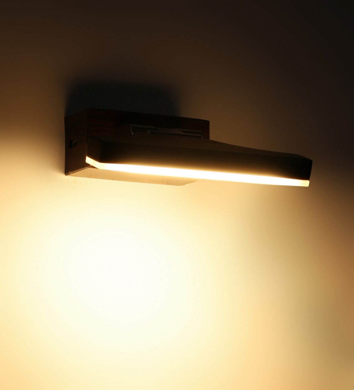 Exclusive dark brown (wood finish) LED picture light using high quality LED and driver with high success rate having less than 0.5% replacement with warm white (yellow) light output. It features one adjustible point. It is usually placed over the painting or a photo frame on the wall. Can also be used above the mirror. Its premium quality wood finish makes it one of the best selling product in our catalogue. Also available in white finish with code ML334-S. It can be made in silver, antique, copper, and black finish in case of bulk requirement.