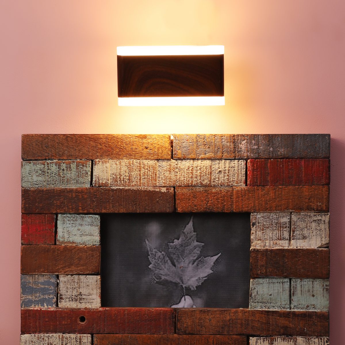 Brown (wood) finish up and down LED wall light using high quality LED and driver with high success rate having less than 0.5% replacement with warm white (yellow) light output. This design is largely preferred by architects and interior designers. Application includes both residential and commercial premises. Can also be used as a mirror light. Also available in big size with code ML332 and WL2489. It can be made in silver, antique, copper, white, and black finish having various width and wattage in case of bulk requirement.