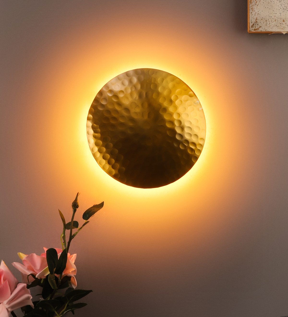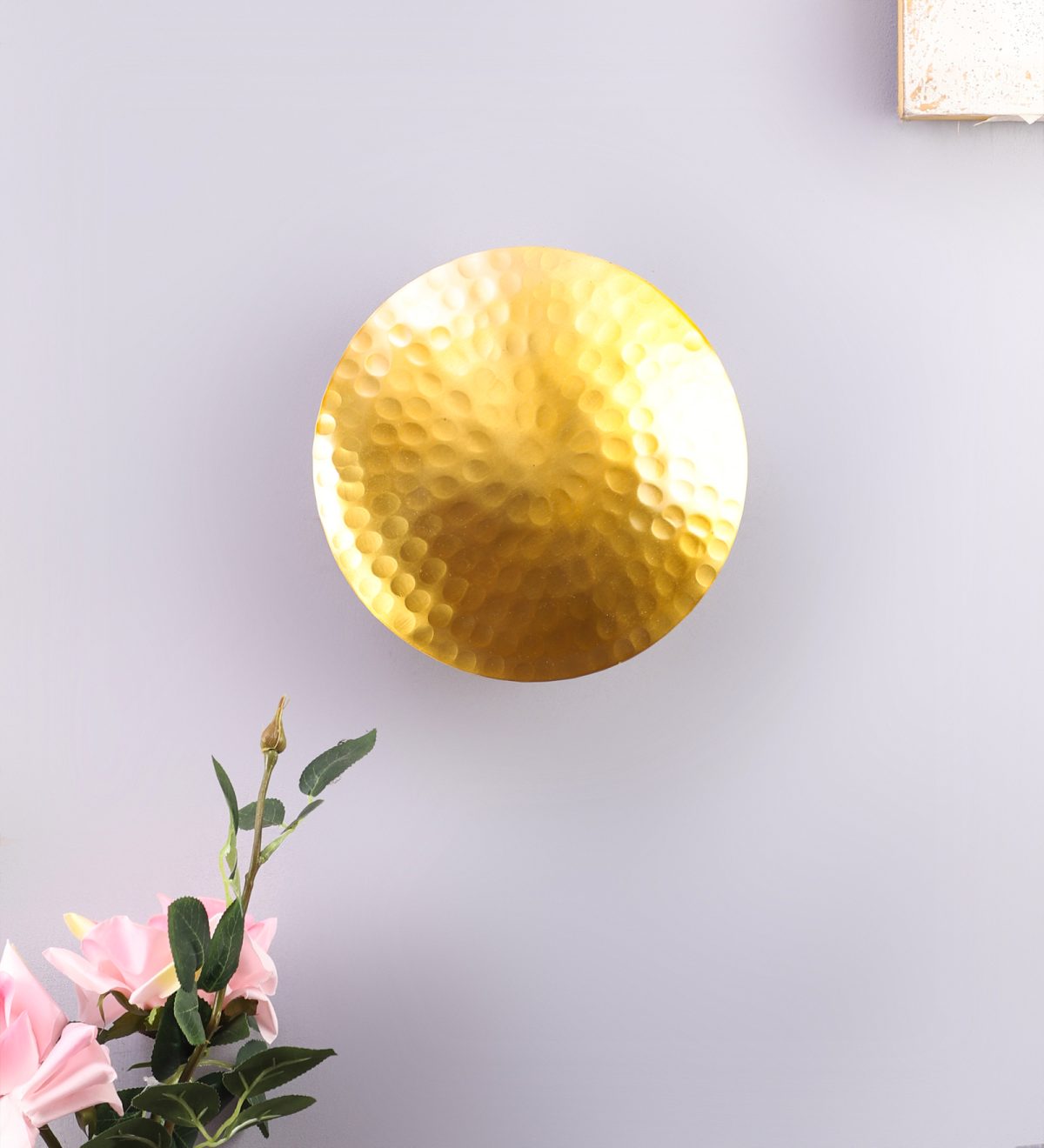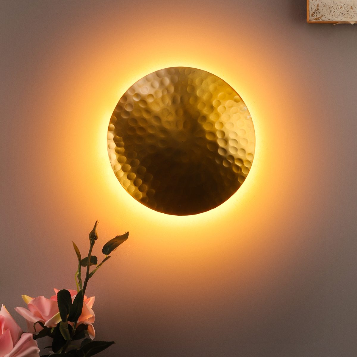 Antique gold finish aluminium sheet round LED wall light with indirect light, using high quality LED and driver with high success rate having less than 0.5% replacement with warm white (yellow) light output.This design is largely preferred by architects and interior designers. Application includes both residential and commercial premises. Also available in copper colour with code WL2940.