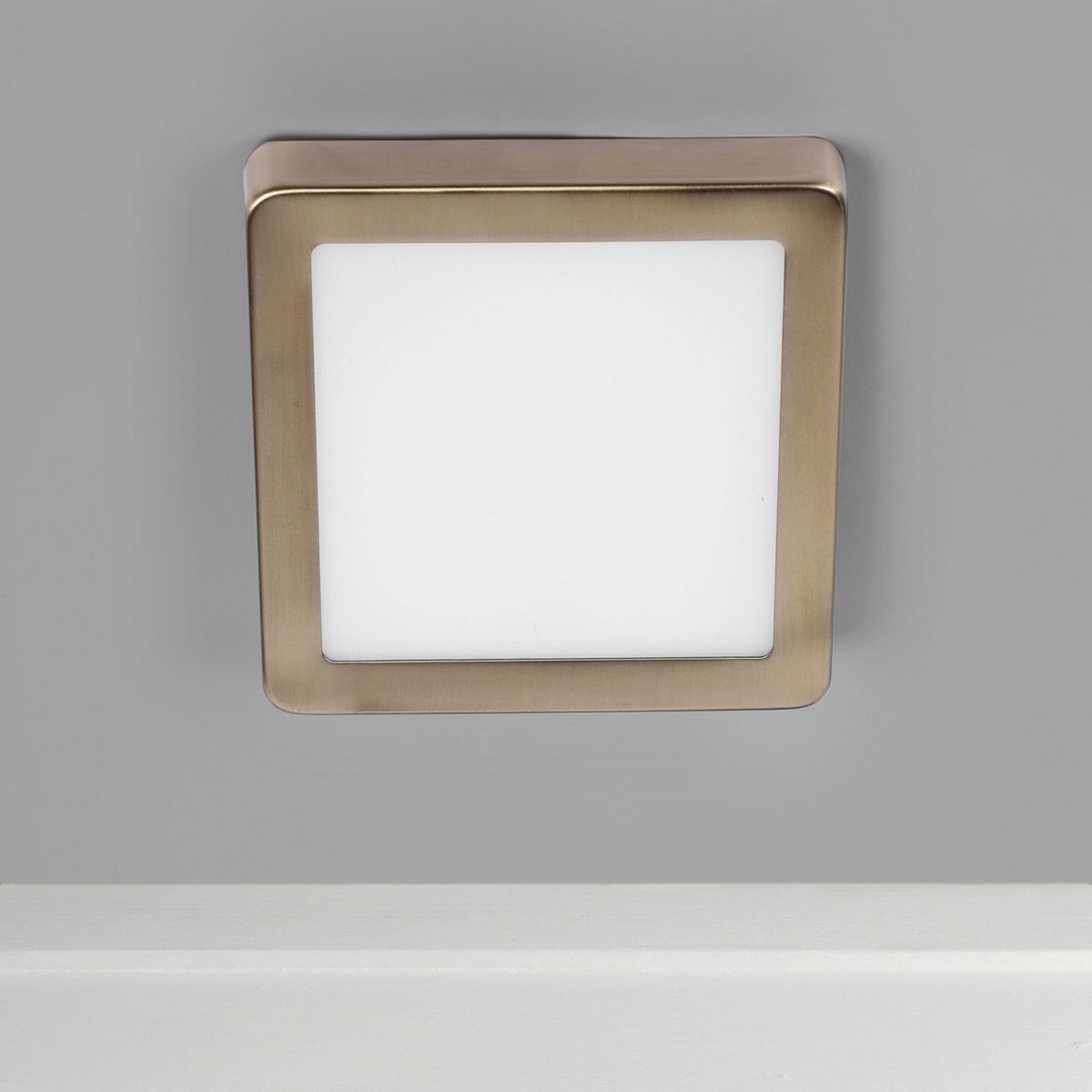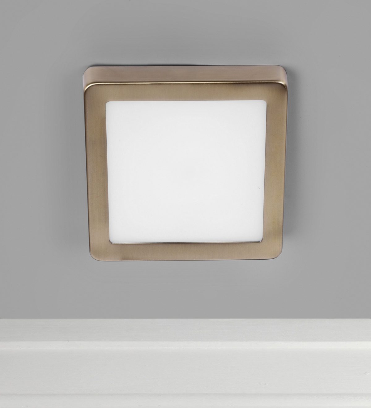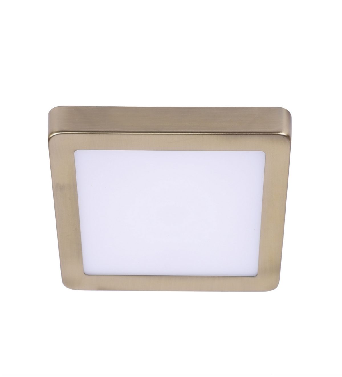 Antique brass finish square LED surface seiling light with warm white (yellow) light output. Can be used both indoors and outdoors.