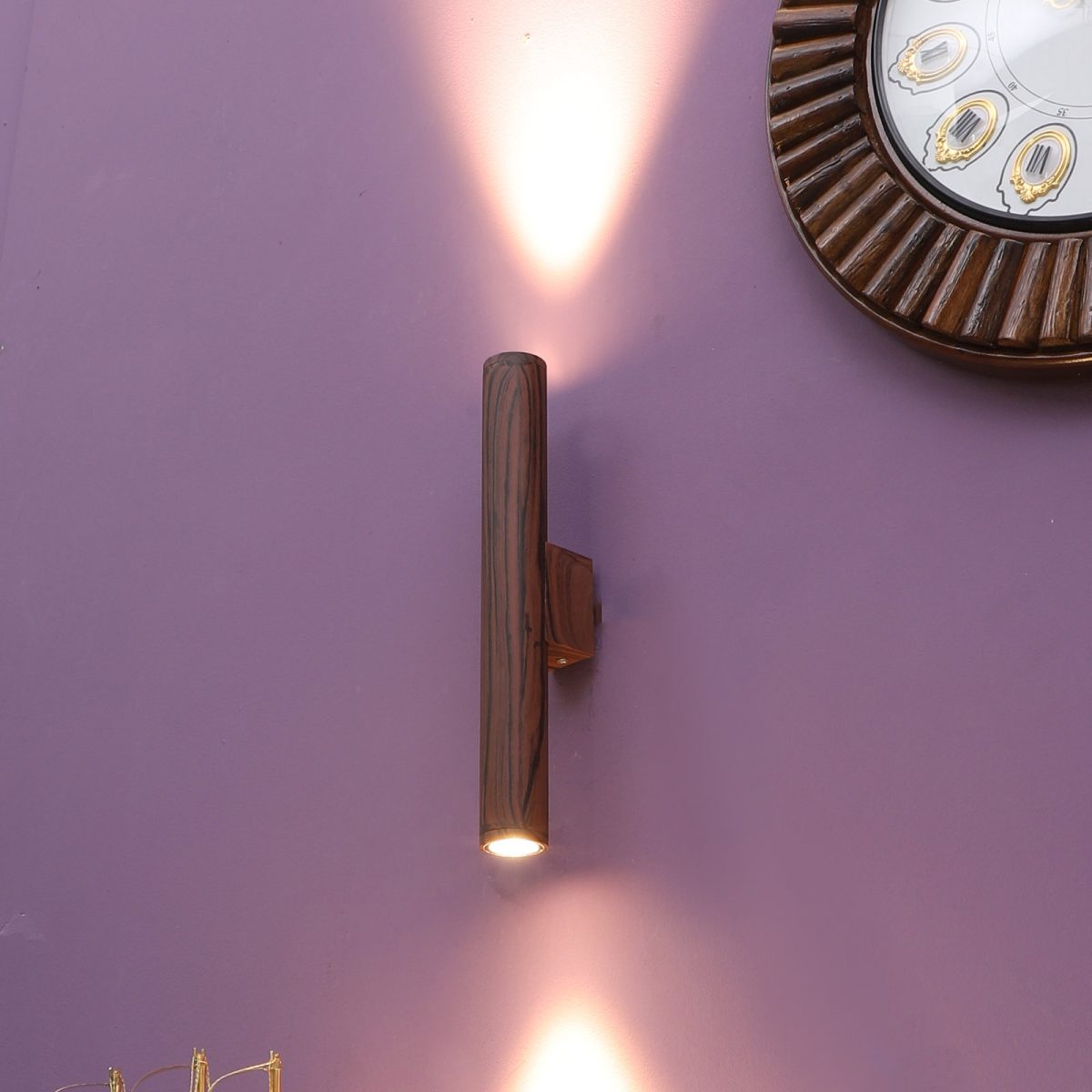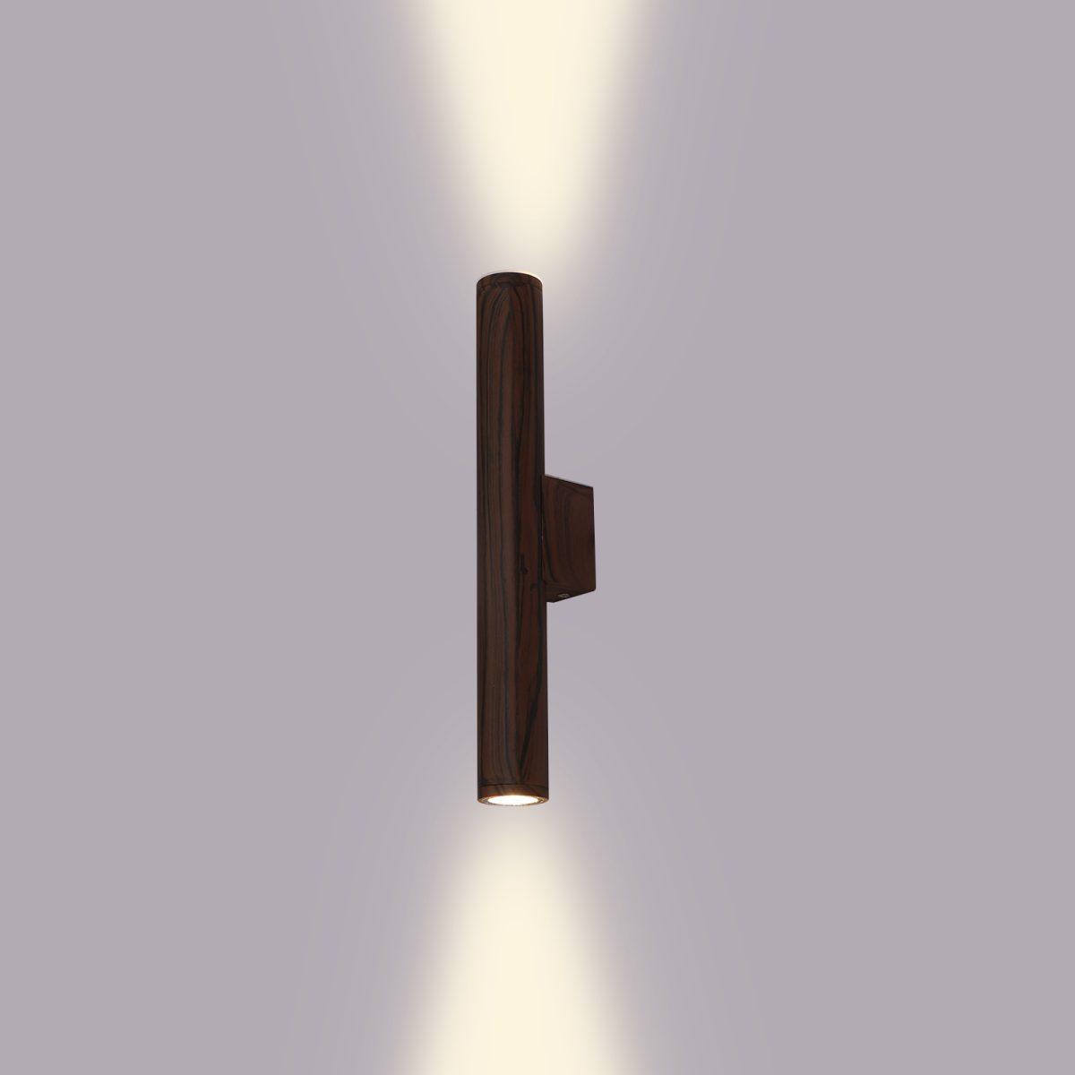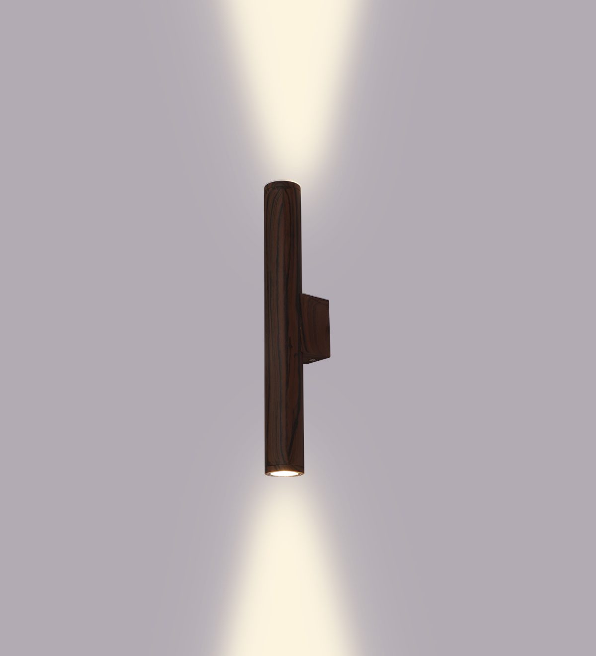 Brown (premium wood finish with grains) up and down (6*2=12 watt) LED wall light using high quality LED and driver with high success rate having less than 0.5% replacement with warm white (yellow) light output. This design is largely preferred by architects and interior designers. Application includes both residential and commercial premises. Also used as a wall highlighter. Can be customized as per requirement.