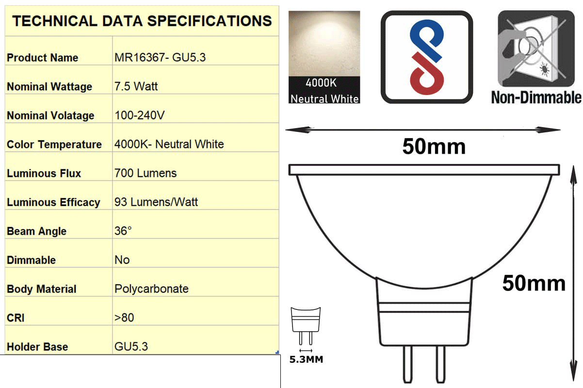 OSRAM LEDVANCE MR16 5.5 W LED LAMP COOL DAY LIGHT,WHITE 6500K LA1001