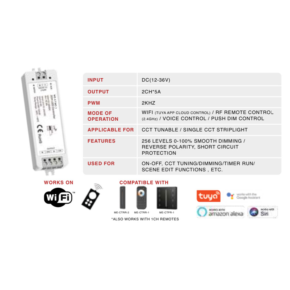 RF and WiFi controller for 2 channel CCT tunable and single CCT strip light.