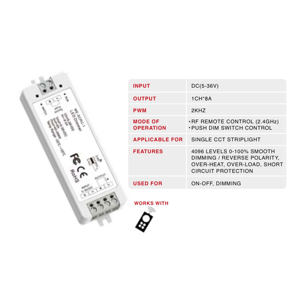 RF controller for 1 channel single CCT strip light used for on off and dimming operation.