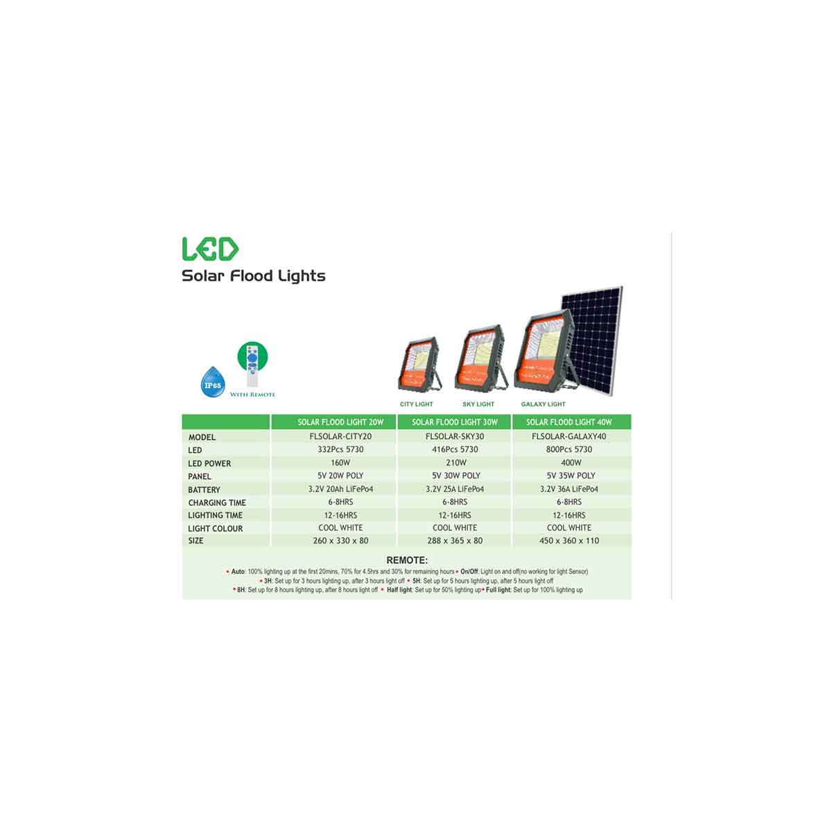 Superscape 20 watt IP65 semi integrated solar flood light with remote, city model GS1444