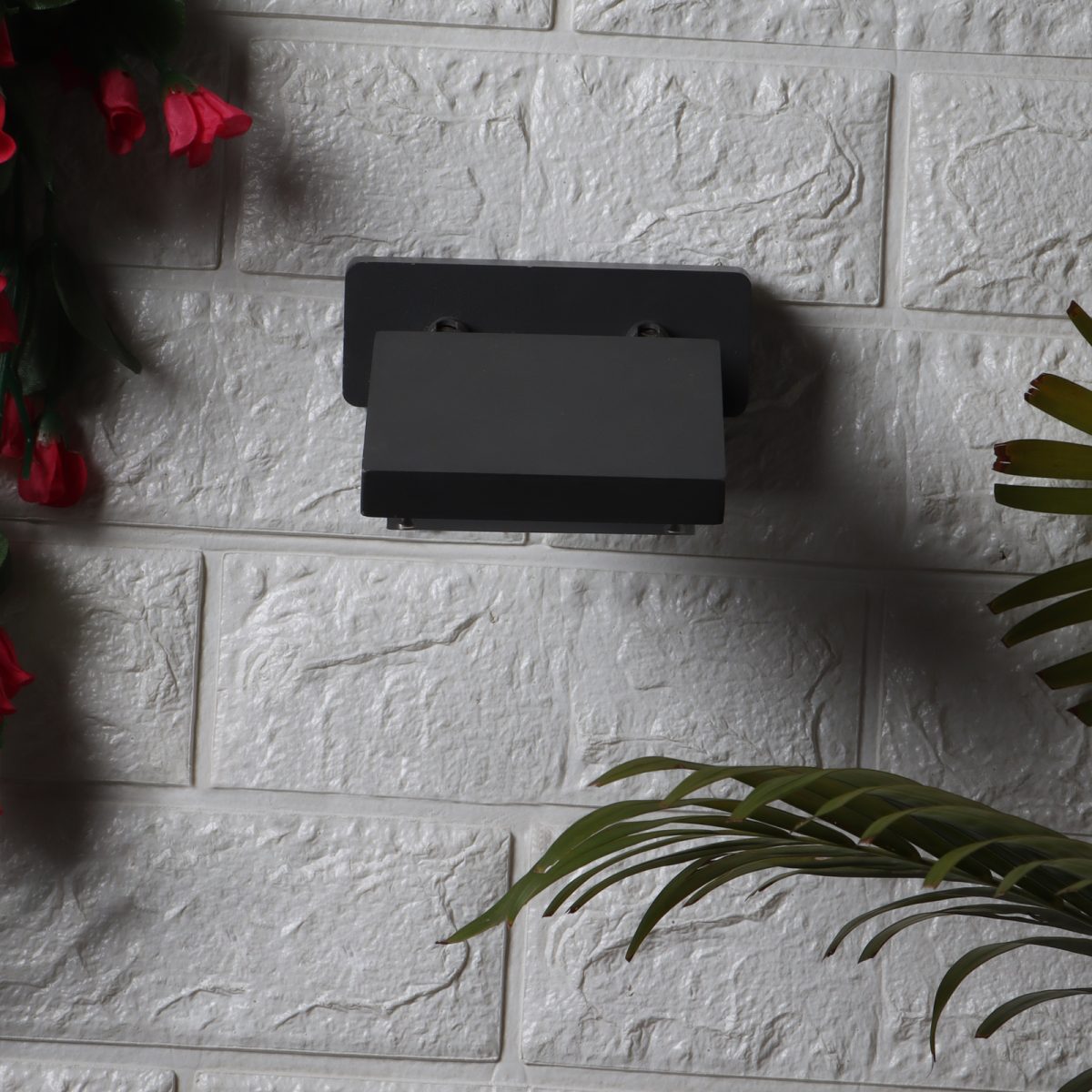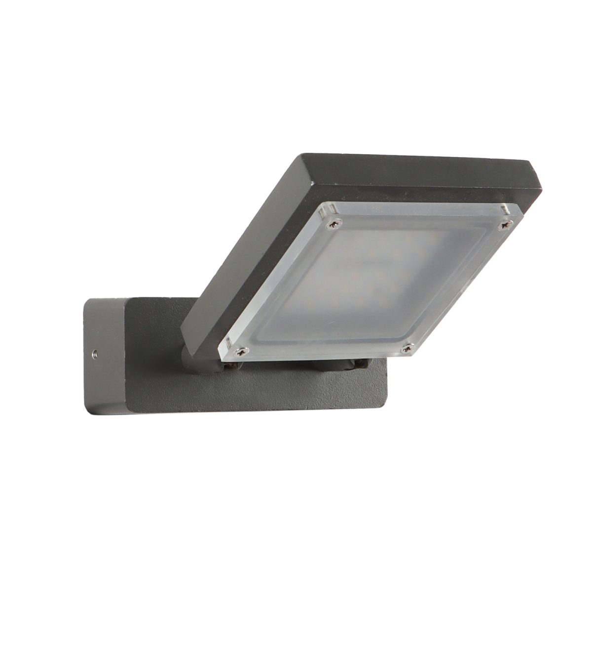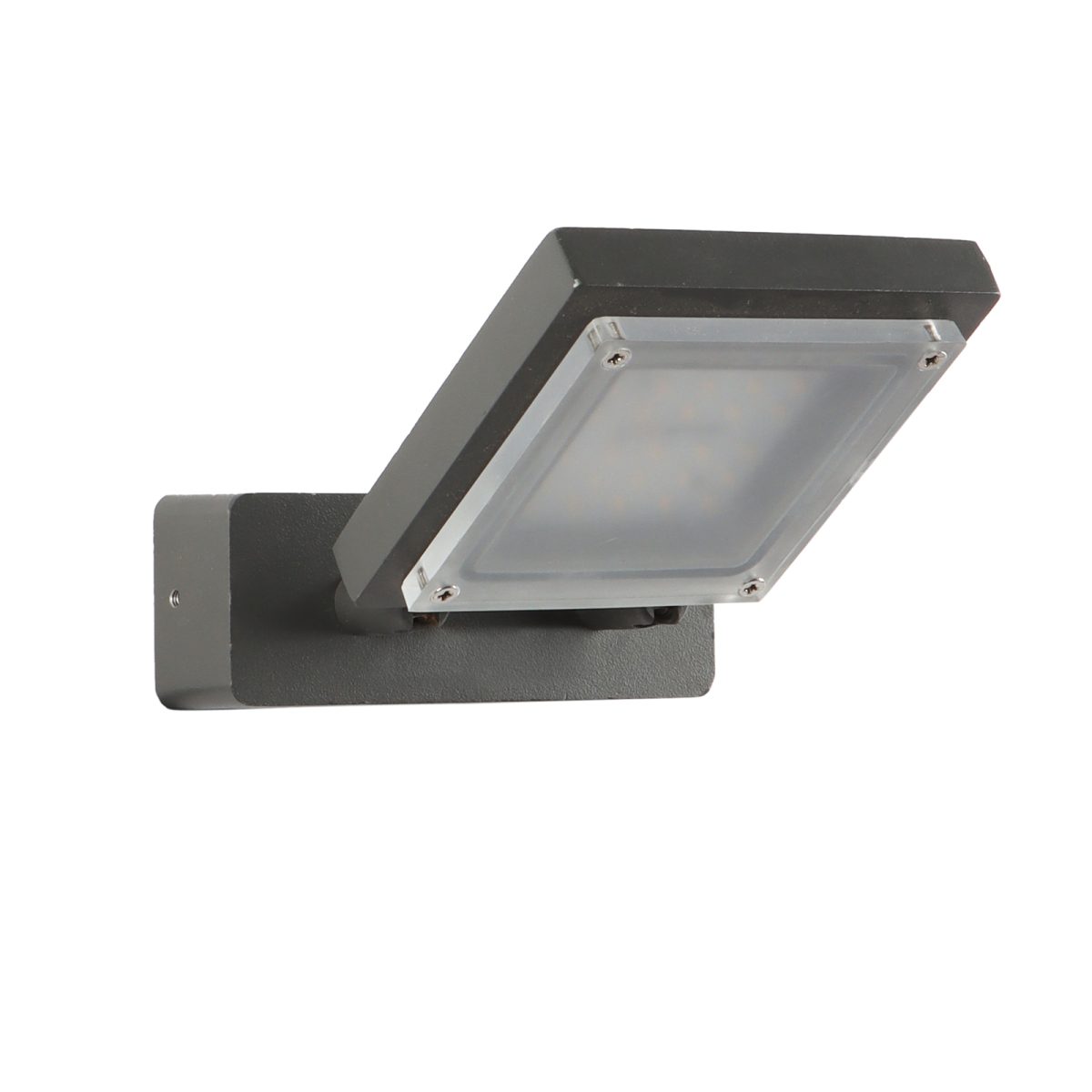 Compact, rectangular, aluminium die cast modern outdoor wall mounted adjustible spot light in grey finish, using high quality LED and driver with high success rate having less than 0.5% replacement. IP54 rated, providing protection from sprayed water in any direction and making this light perfect for use outdoors. It can also be used in indoor applications. Application areas include Stair case walls, passage to staircase, terrace walls, terrace gardens outdoor walls, boundary walls, open parking, stilt parking, basement parking, balcony, highlighting name plate.