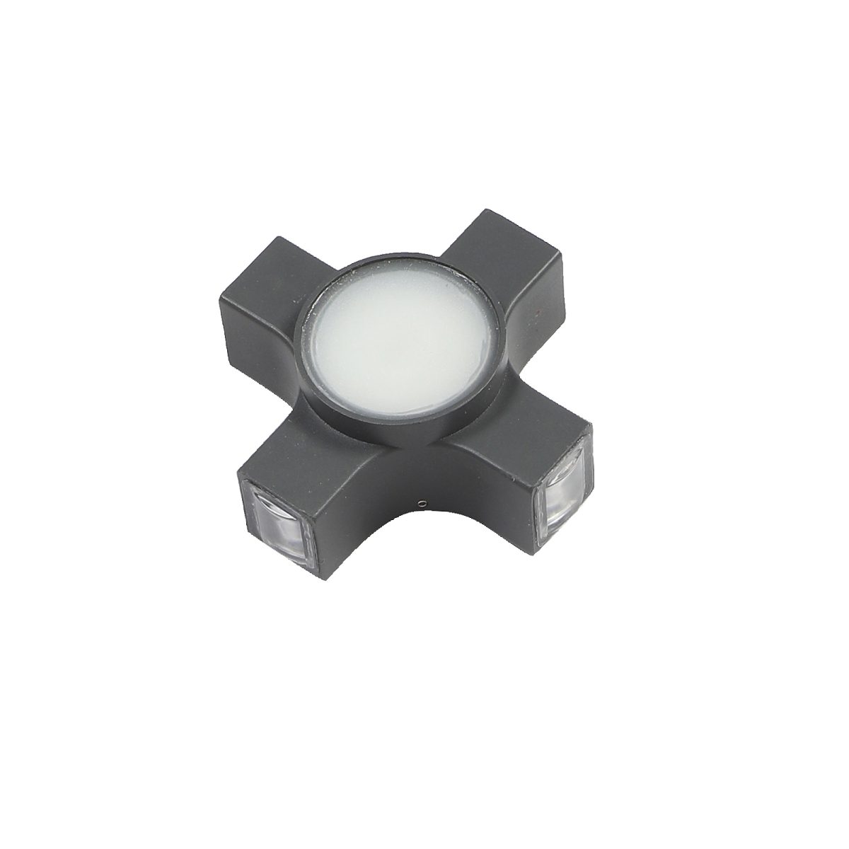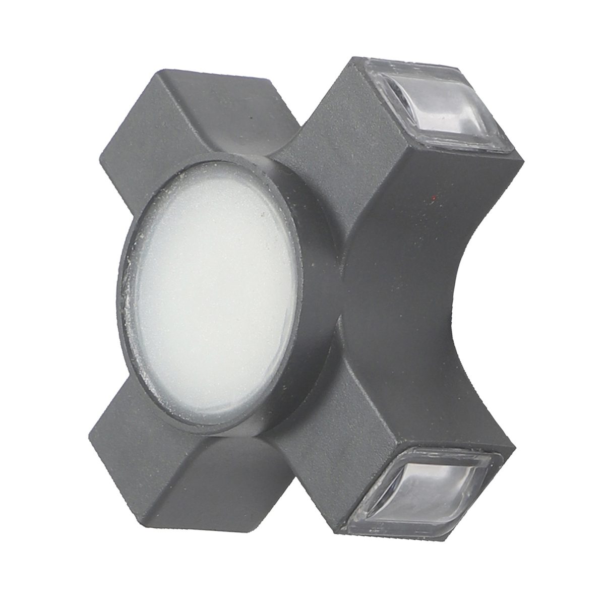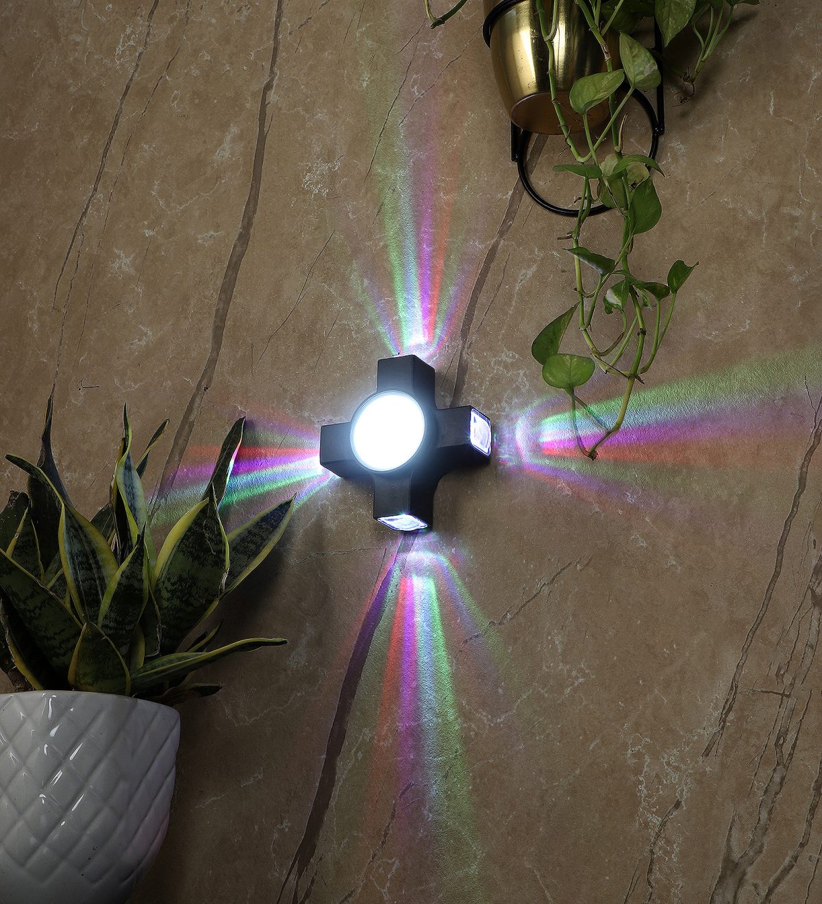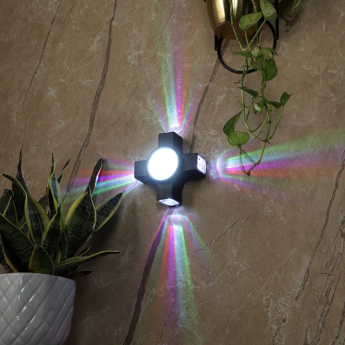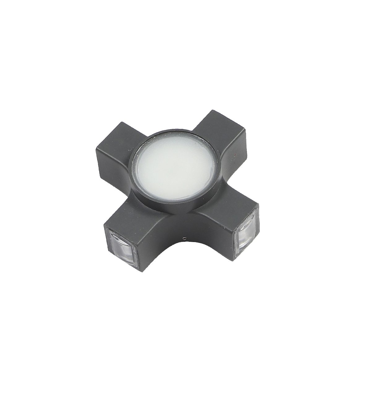 Elegant nicely shaped aluminum die cast outdoor wall light in grey finish using high quality LED and driver. It is a four way multicolour light with lens to enhance the output to give a defined beam spread in all the four directions. Central part also has light form general lighting.This in combination with multiple pieces is preferred by the lighting designers to create a lighting effect in a single wide wall, and multiple units are used to create the design.