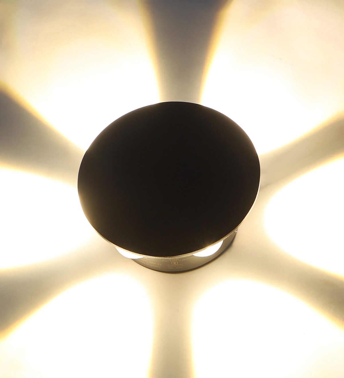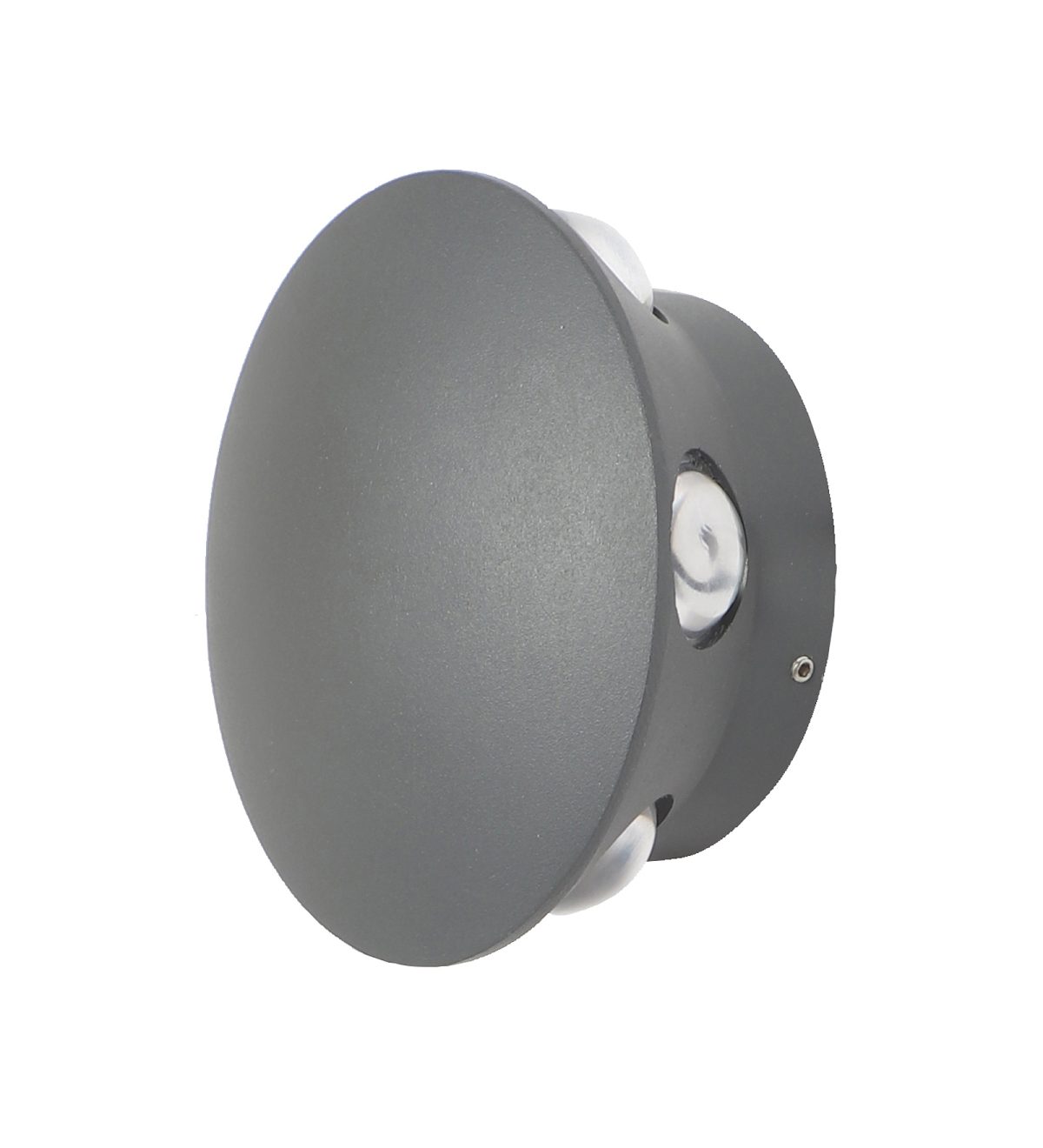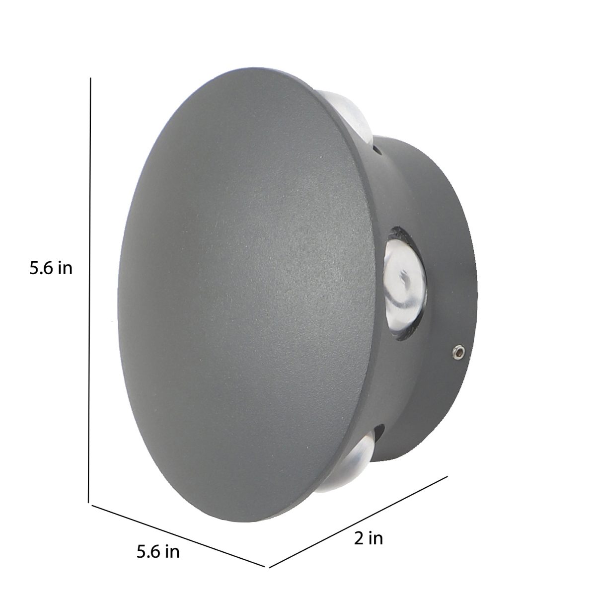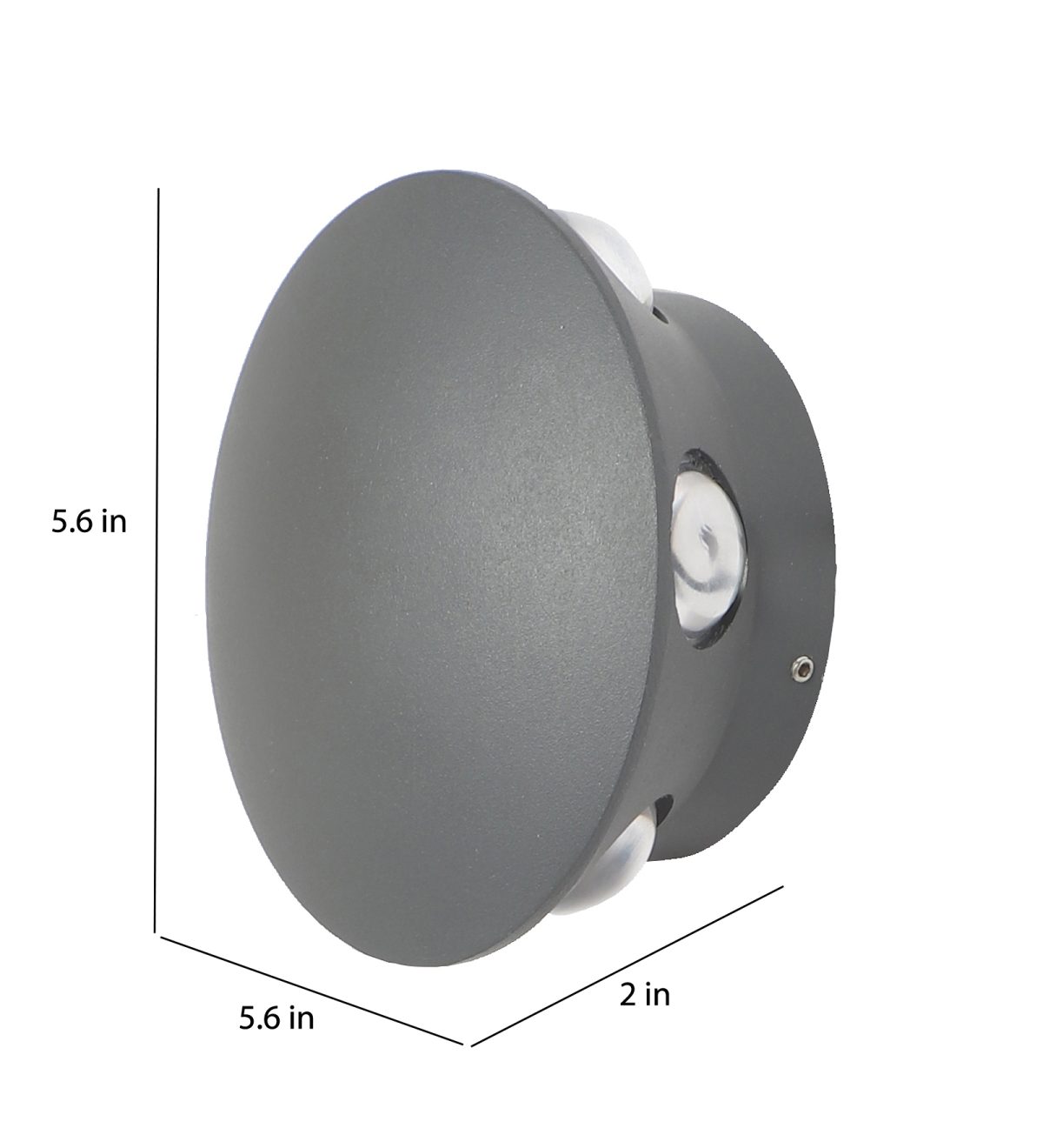 Round aluminum die cast outdoor wall light in grey finish using high quality LED and driver. It is a six way light. This in combination with multiple pieces is preferred by the lighting designers to create a lighting effect in a single wide wall, and multiple units are used to create the design.