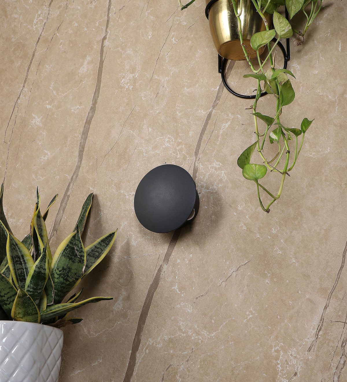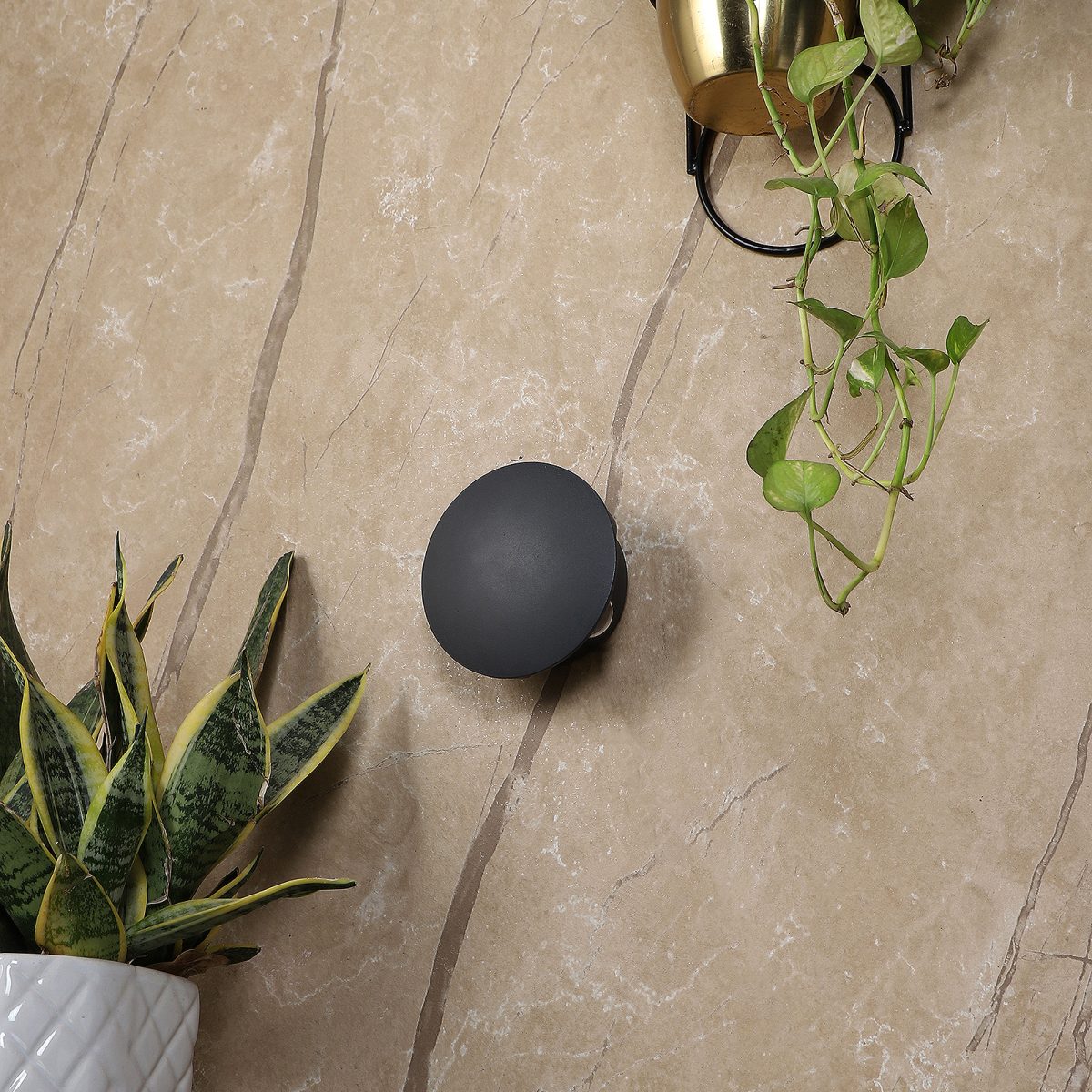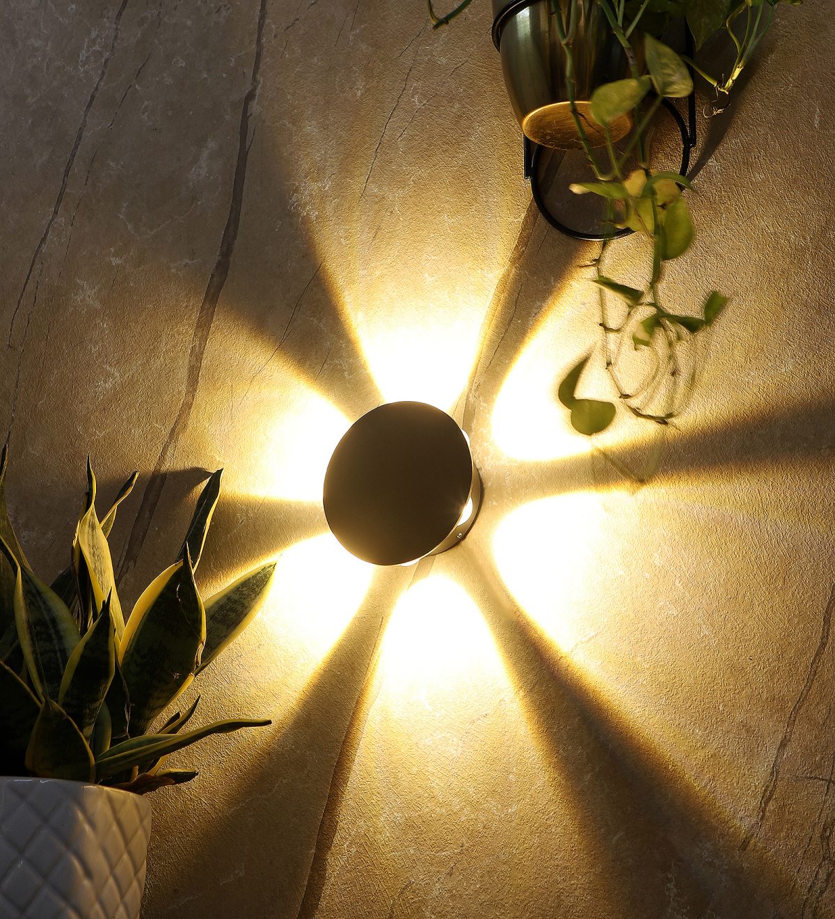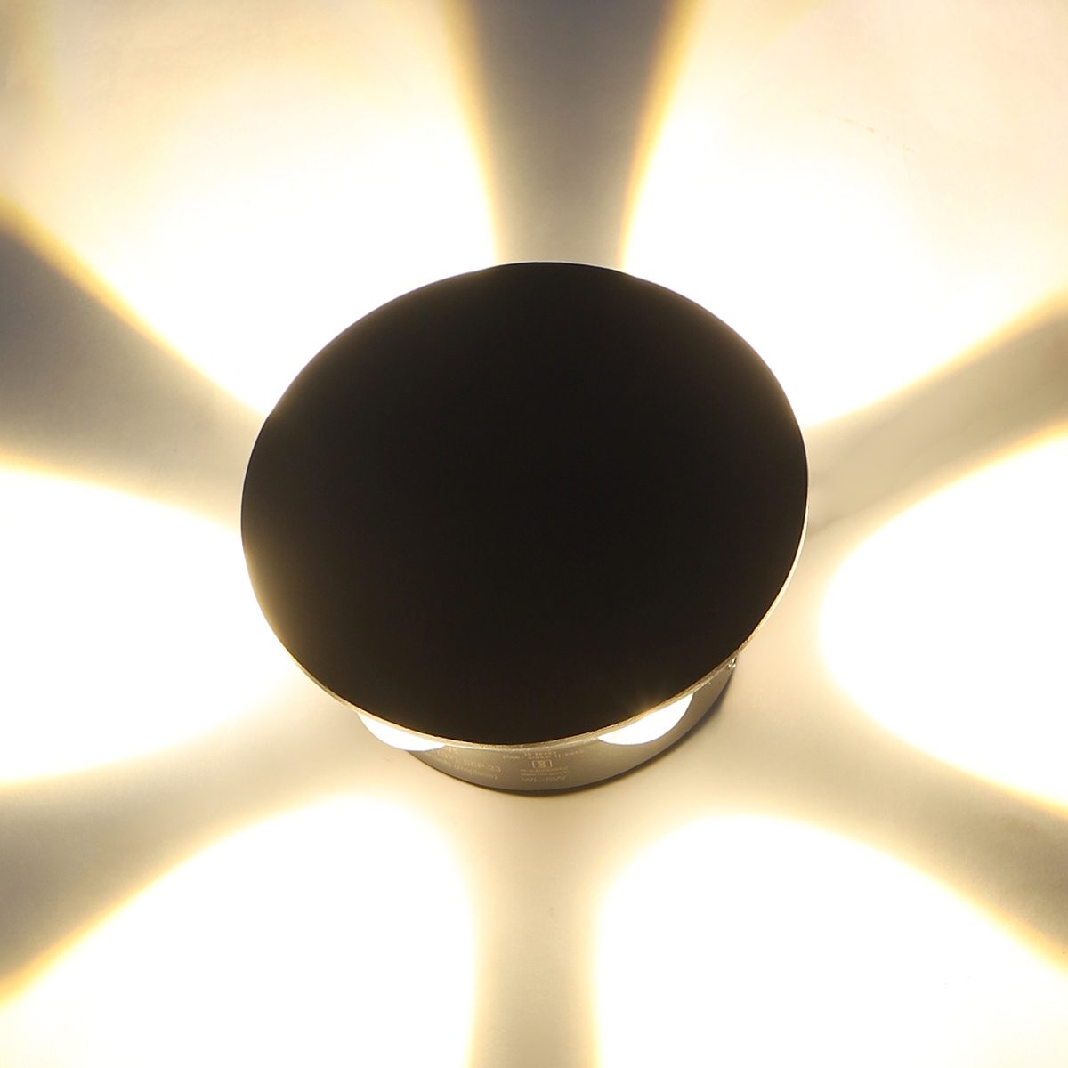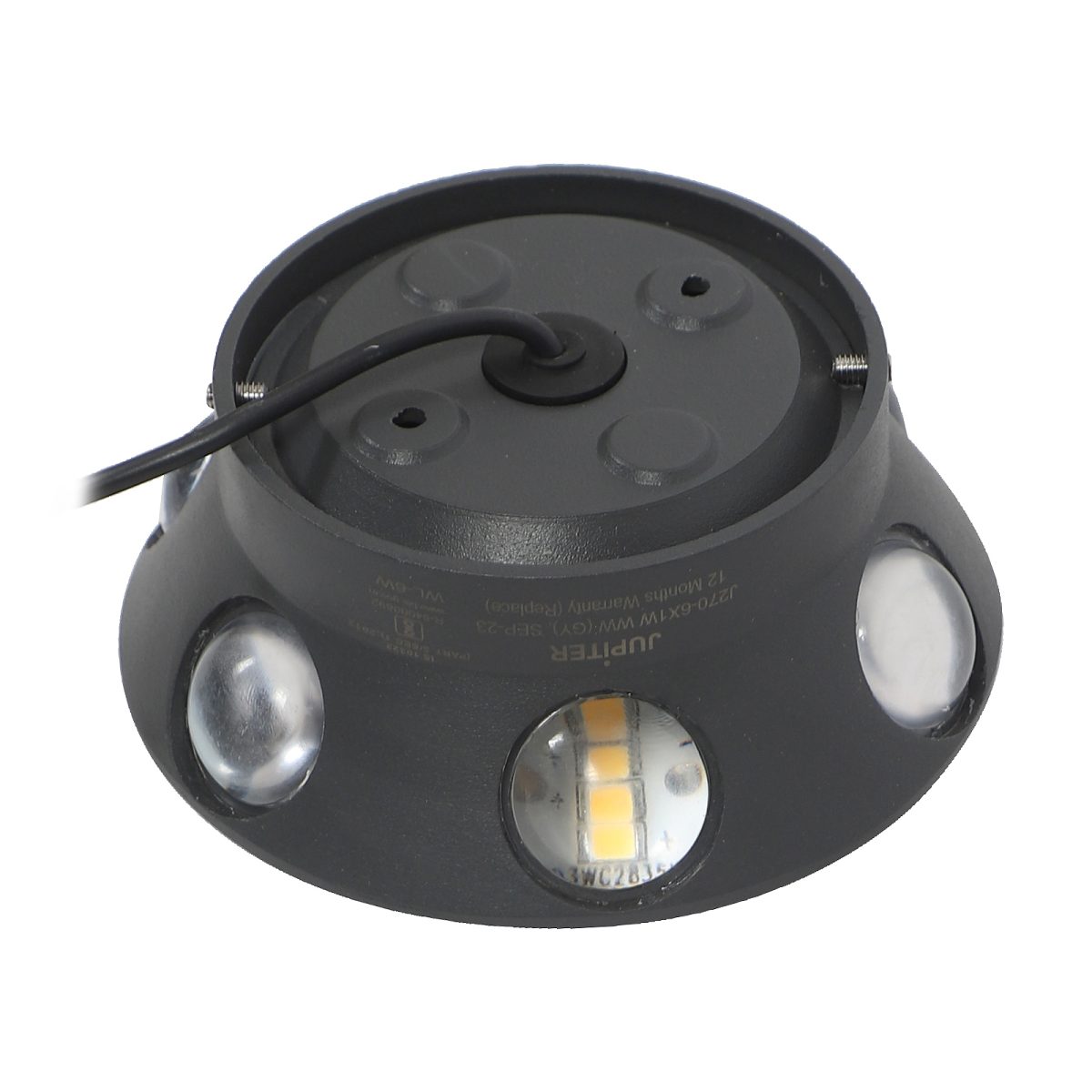 Round aluminum die cast outdoor wall light in grey finish using high quality LED and driver. It is a six way light. This in combination with multiple pieces is preferred by the lighting designers to create a lighting effect in a single wide wall, and multiple units are used to create the design.