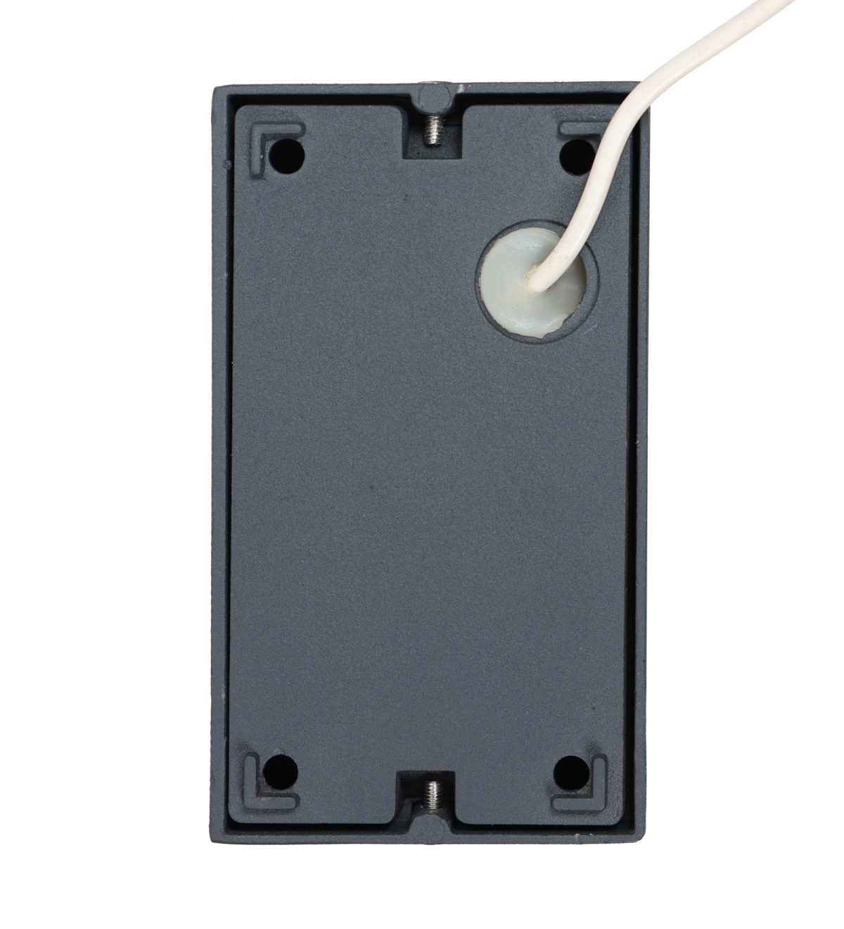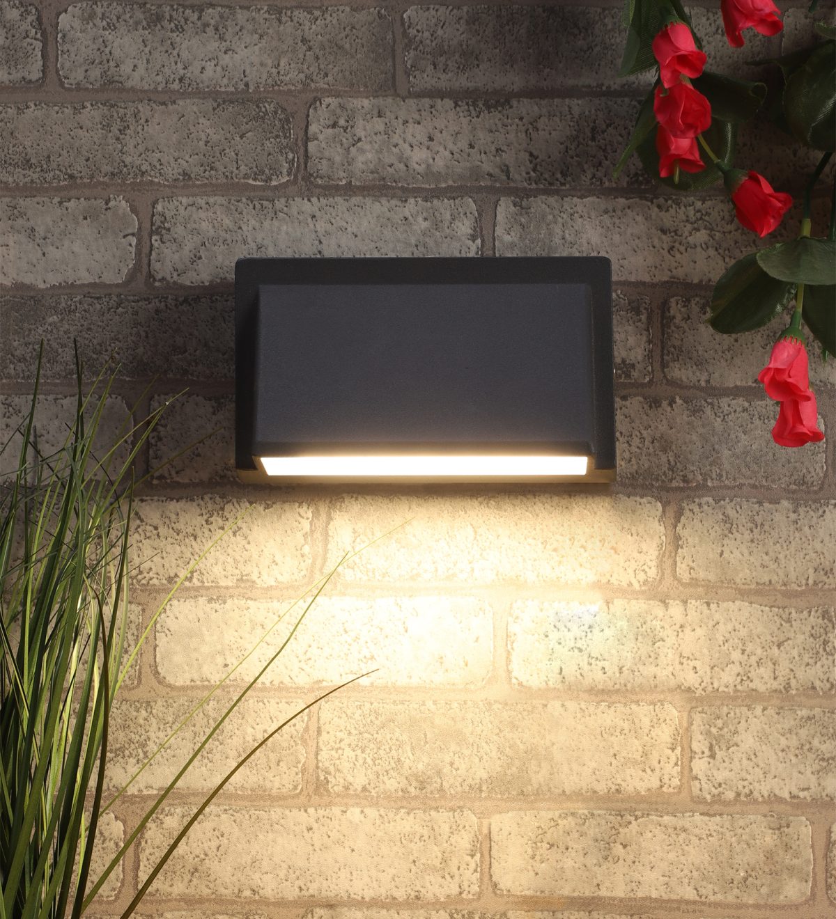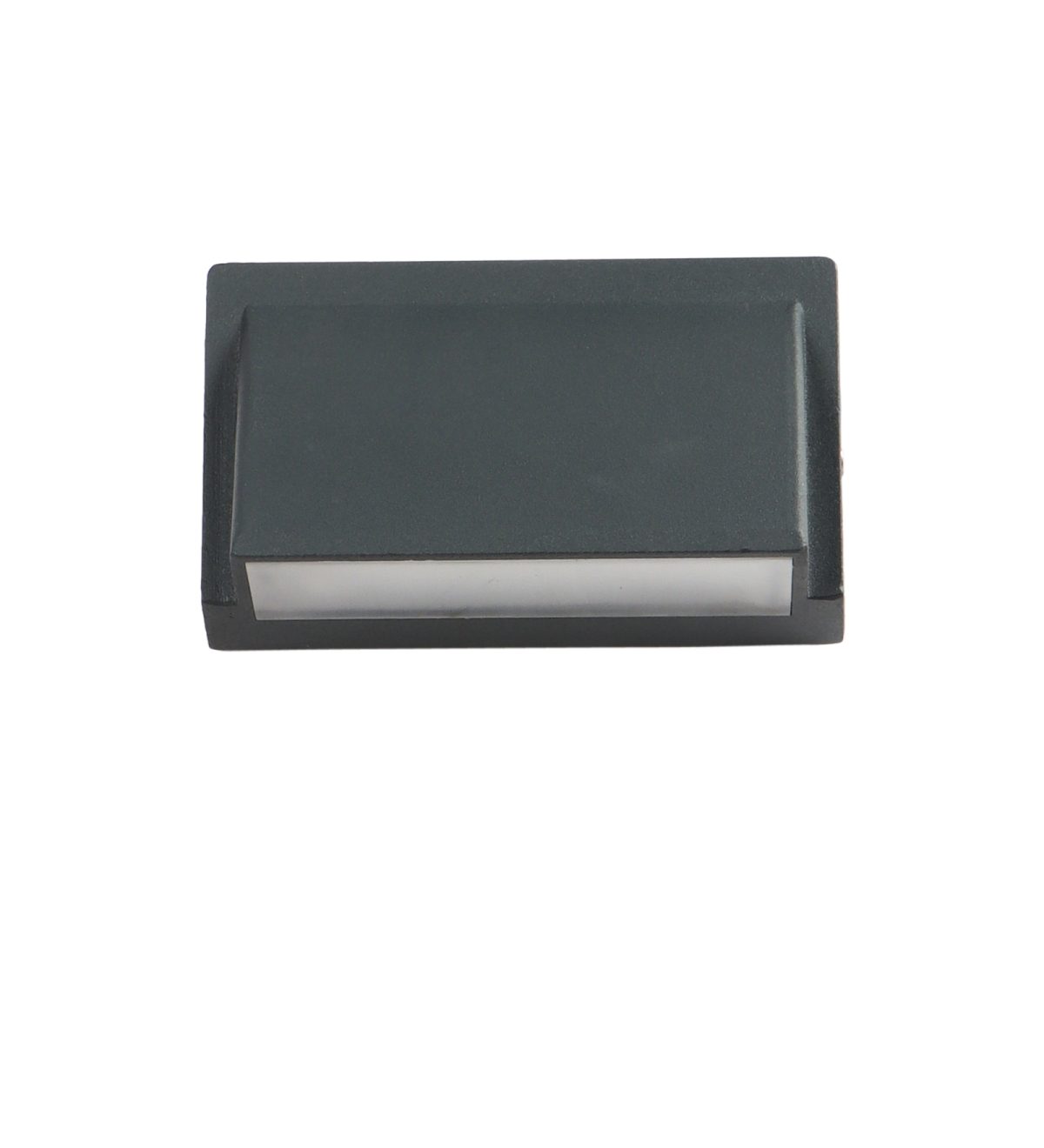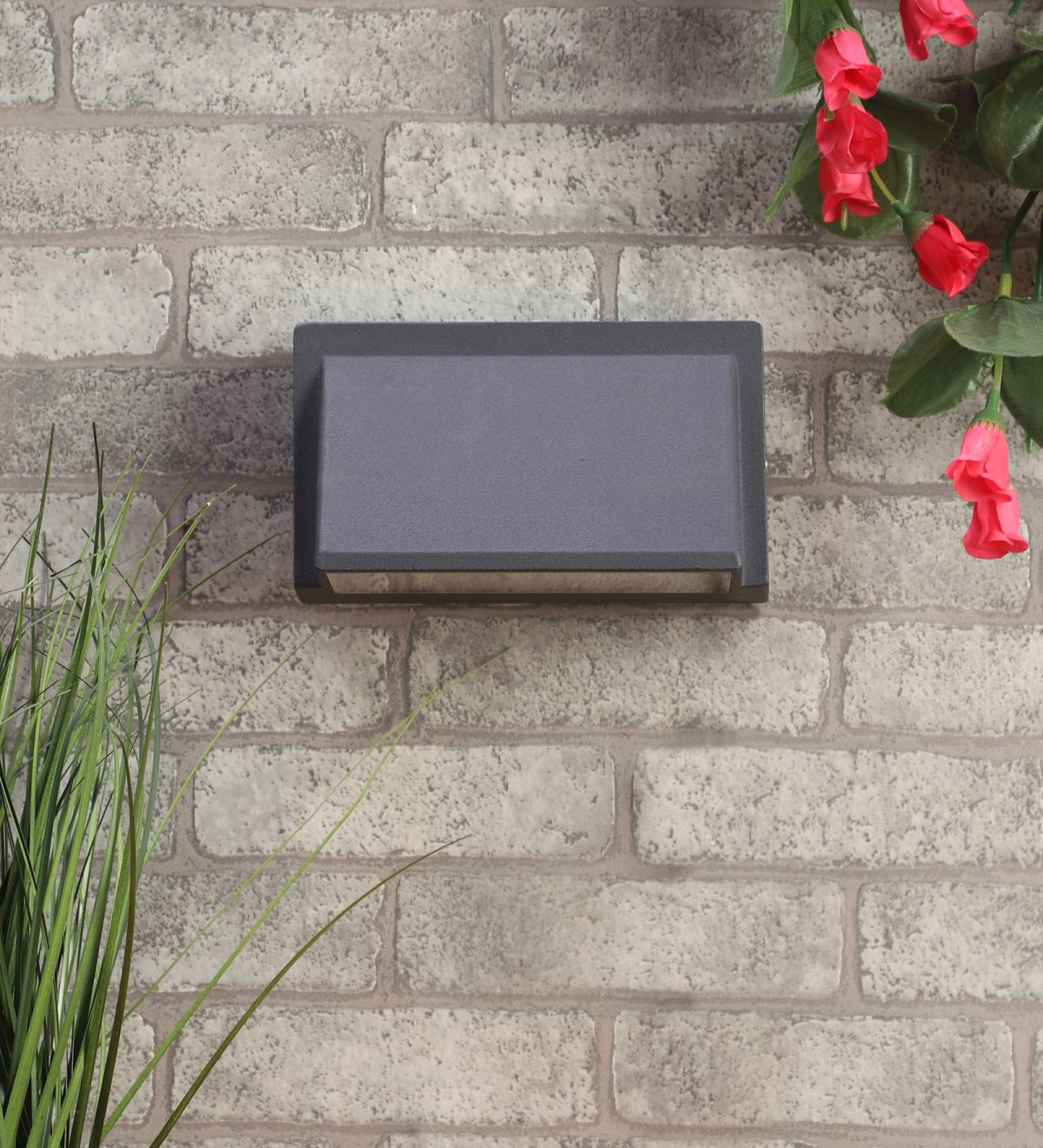 Rectangular one way (up or down) aluminum die cast outdoor wall light in gray finish using high quality LED and driver with high success rate having less than 0.5% replacement. It is a one way light with high light output. It is a premium design with good width and wider light output. It can be used in both indoor and outdoor applications such as stair case walls, terrace walls, outdoor walls, boundary walls, open parking, stilt parking, basement parking, passage walls, entrance pillars, name / address plate. Can also be used as surface foot light. IP54 rated. Protection against splashed water can be customized as per requirement for bulk quantities.