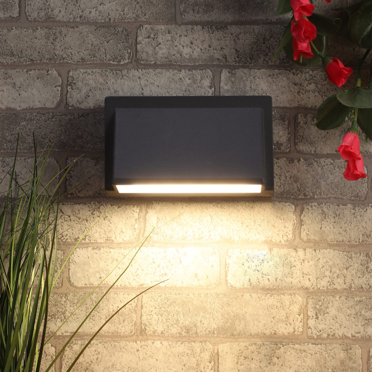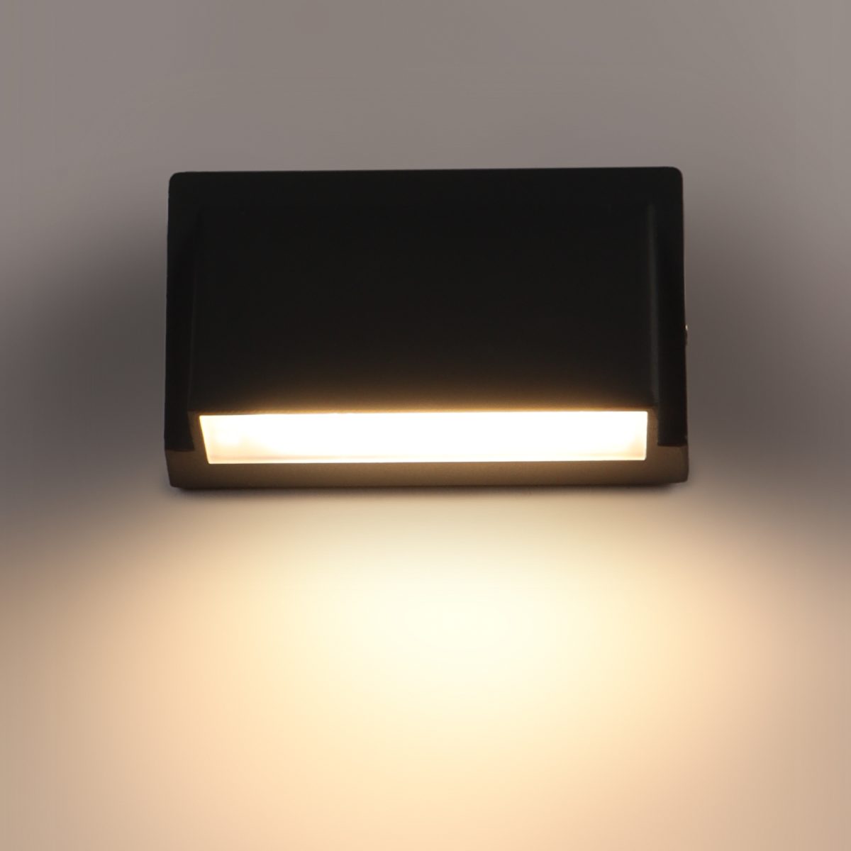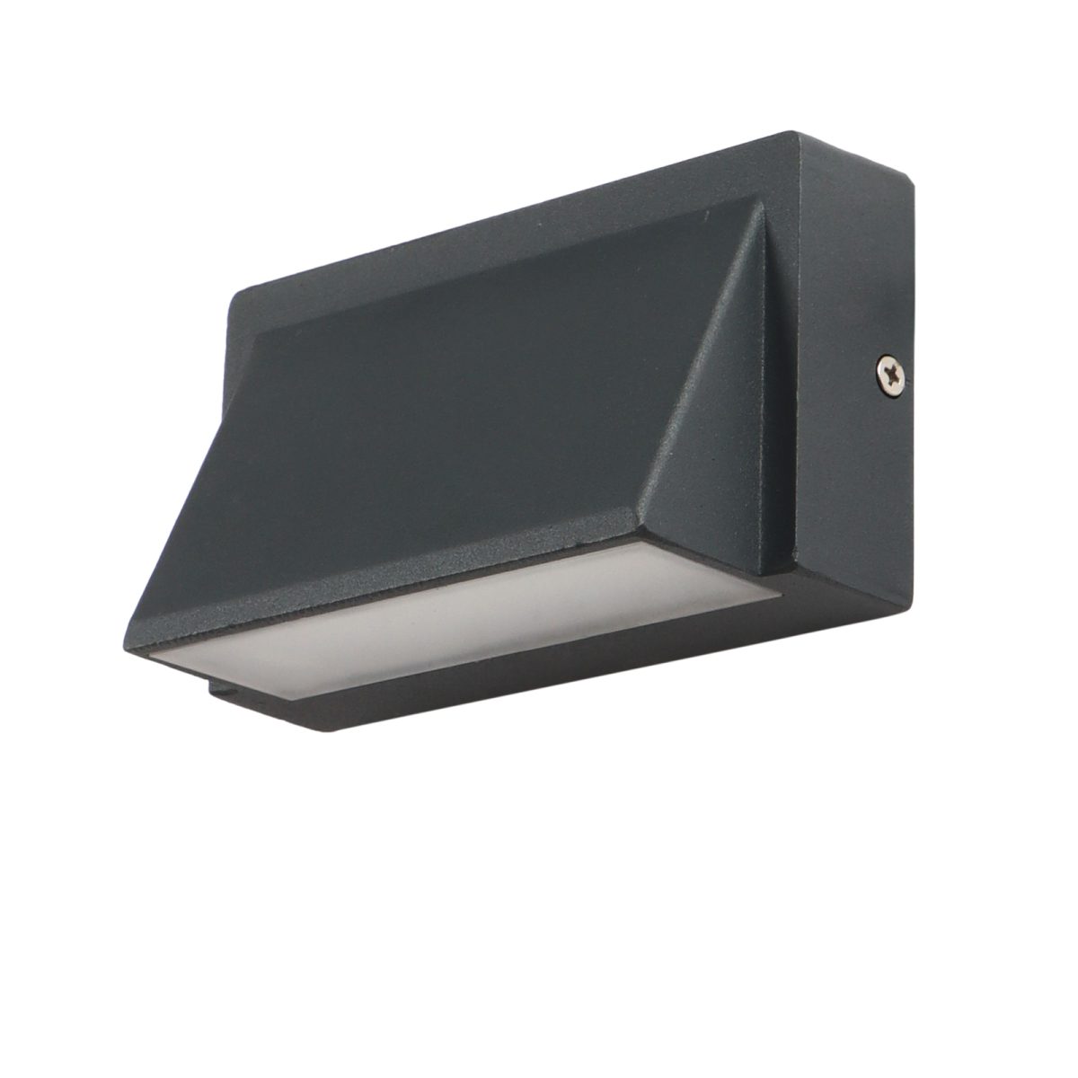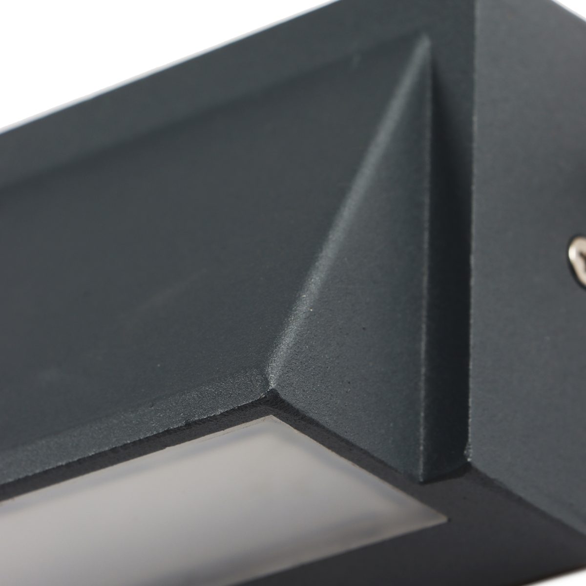 Rectangular one way (up or down) aluminum die cast outdoor wall light in gray finish using high quality LED and driver with high success rate having less than 0.5% replacement. It is a one way light with high light output. It is a premium design with good width and wider light output. It can be used in both indoor and outdoor applications such as stair case walls, terrace walls, outdoor walls, boundary walls, open parking, stilt parking, basement parking, passage walls, entrance pillars, name / address plate. Can also be used as surface foot light. IP54 rated. Protection against splashed water can be customized as per requirement for bulk quantities.