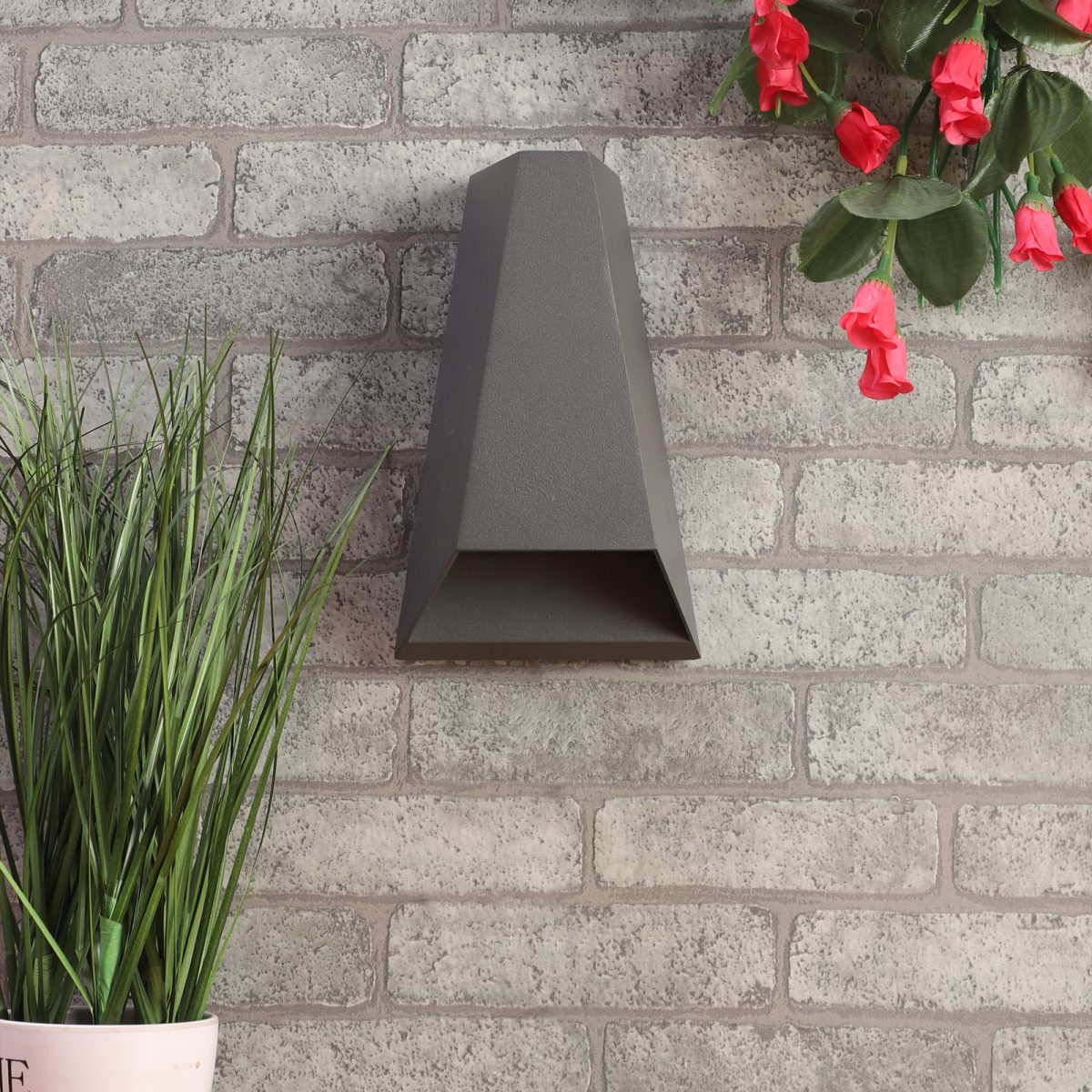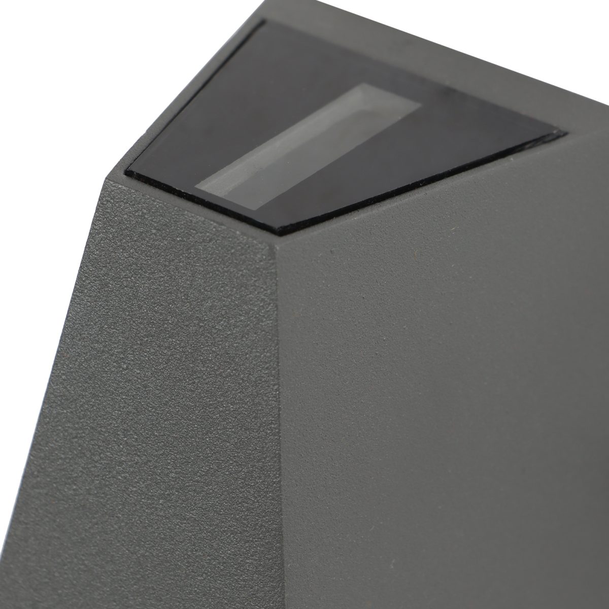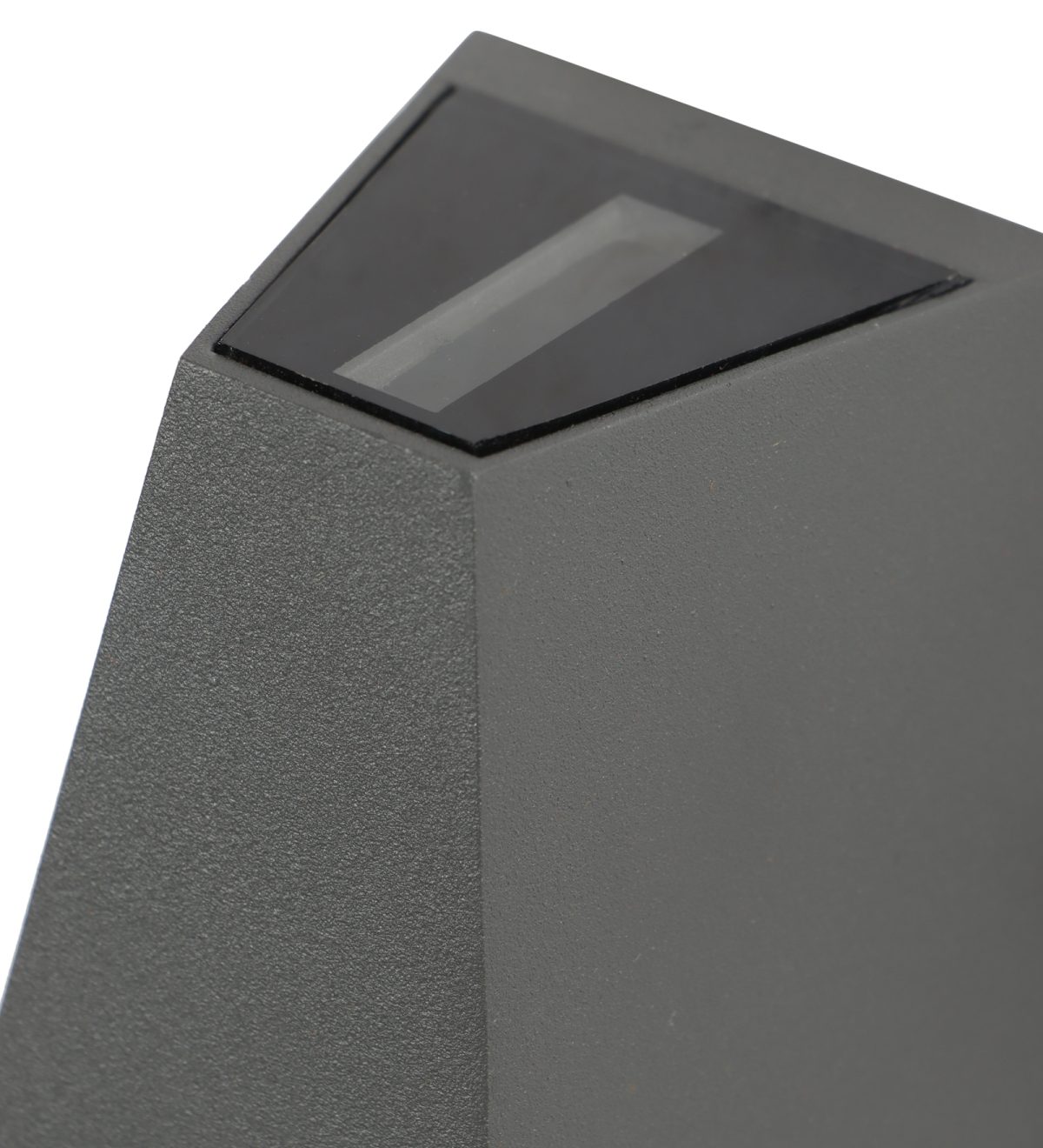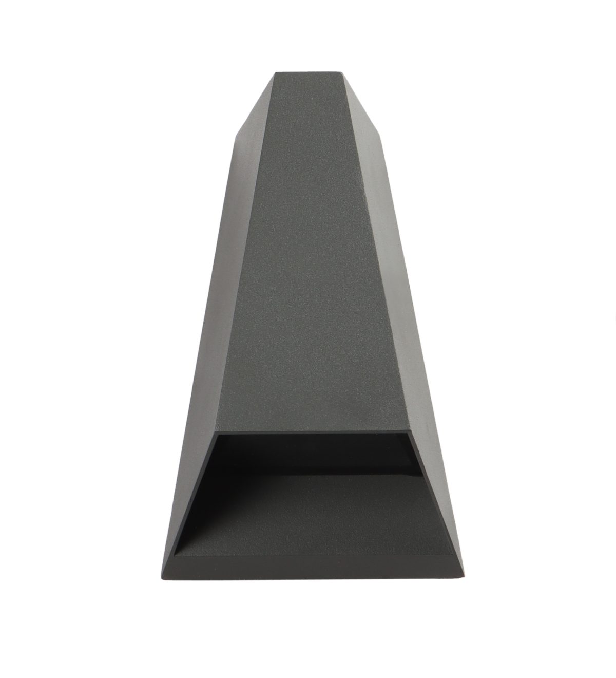 Vertical up and down aluminum die cast outdoor wall light in gray finish using high quality LED and driver with high success rate having less than 0.5% replacement. It is a unique two way light providing a narrow beam in one direction and spread output in another direction. It is economical and one of the most popular design preferred by the lighting designers, builders and architects. It can be used in both indoor and outdoor applications such as stair case walls, terrace walls, outdoor walls, boundary walls, open parking, stilt parking, basement parking, passage walls, entrance pillars. IP54 rated. Protection against splashed water can be customized as per requirement for bulk quantities.