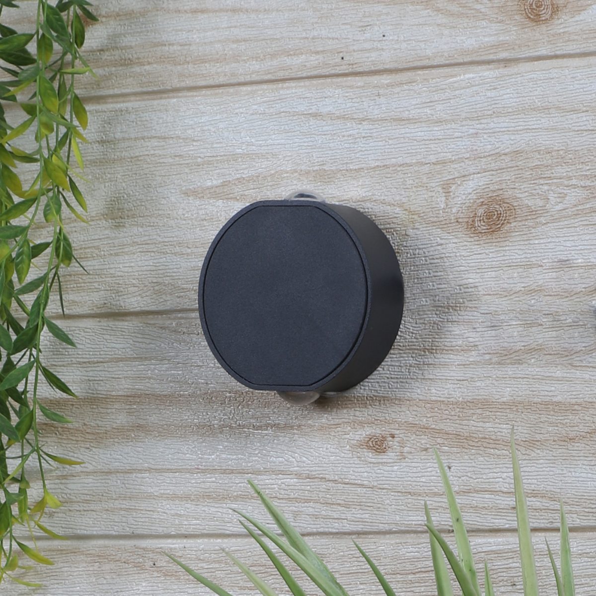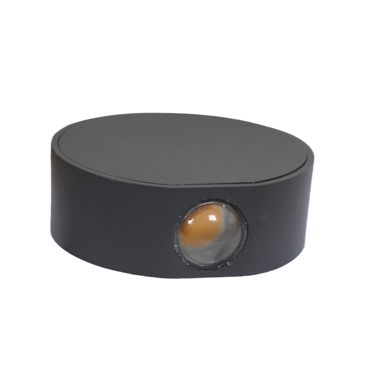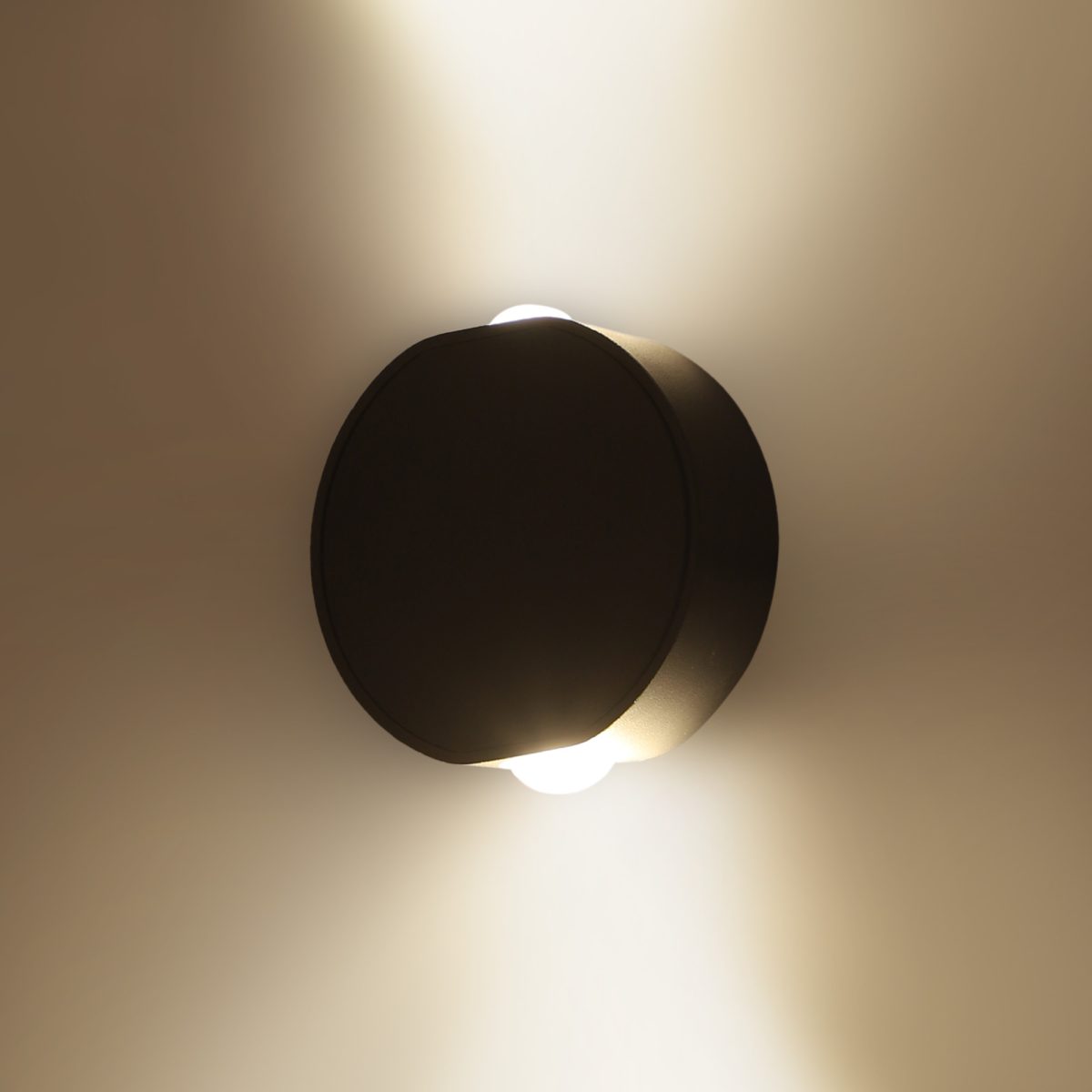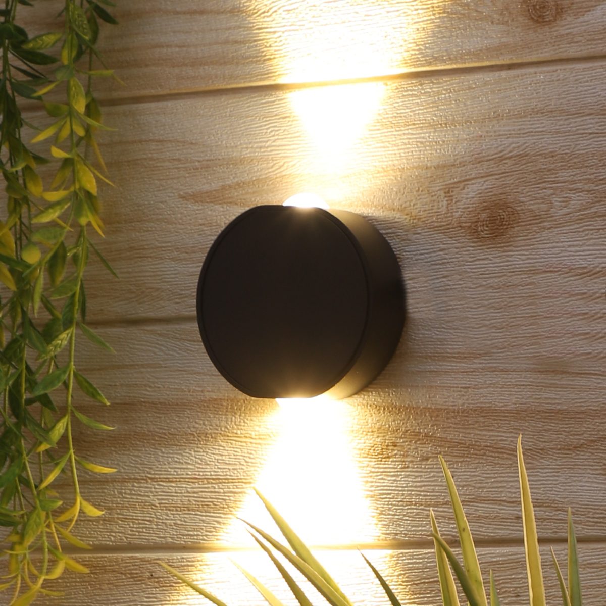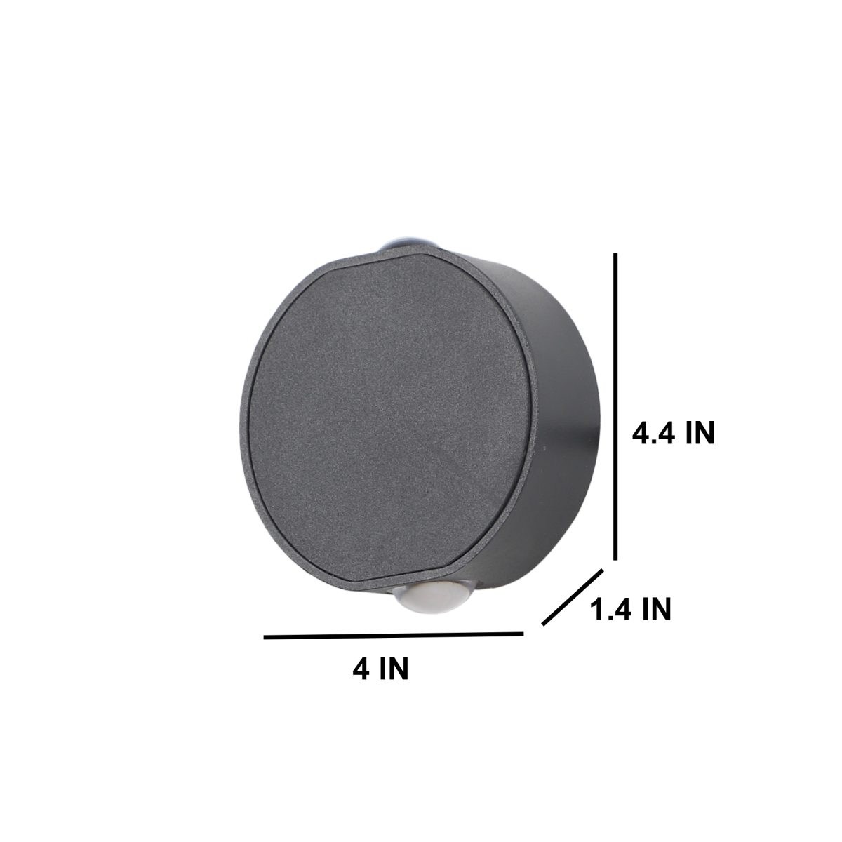 Round, two way, up and down aluminum die cast outdoor wall light in grey finish using high quality LED and driver with high success rate having less than 0.5% replacement. It is a two way light with high output It is economical and one of the most popular design preferred by the lighting designers, builders and architects. It can be used in both indoor and outdoor applications such as stair case walls, terrace walls, outdoor walls, boundary walls, open parking, stilt parking, basement parking, passage walls, entrance pillars. IP54 rated. Protection against splashed water.