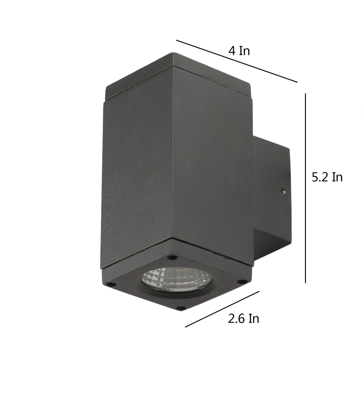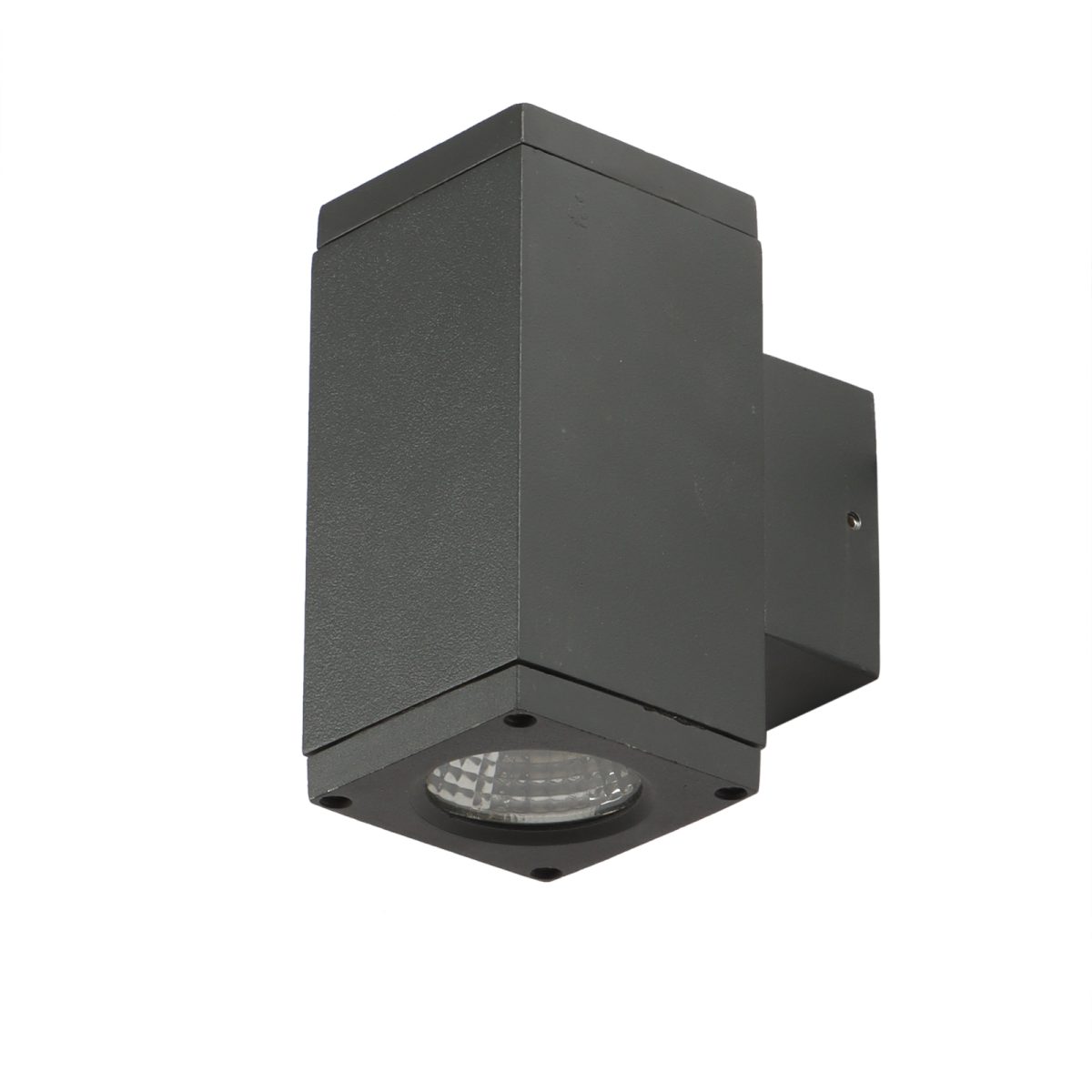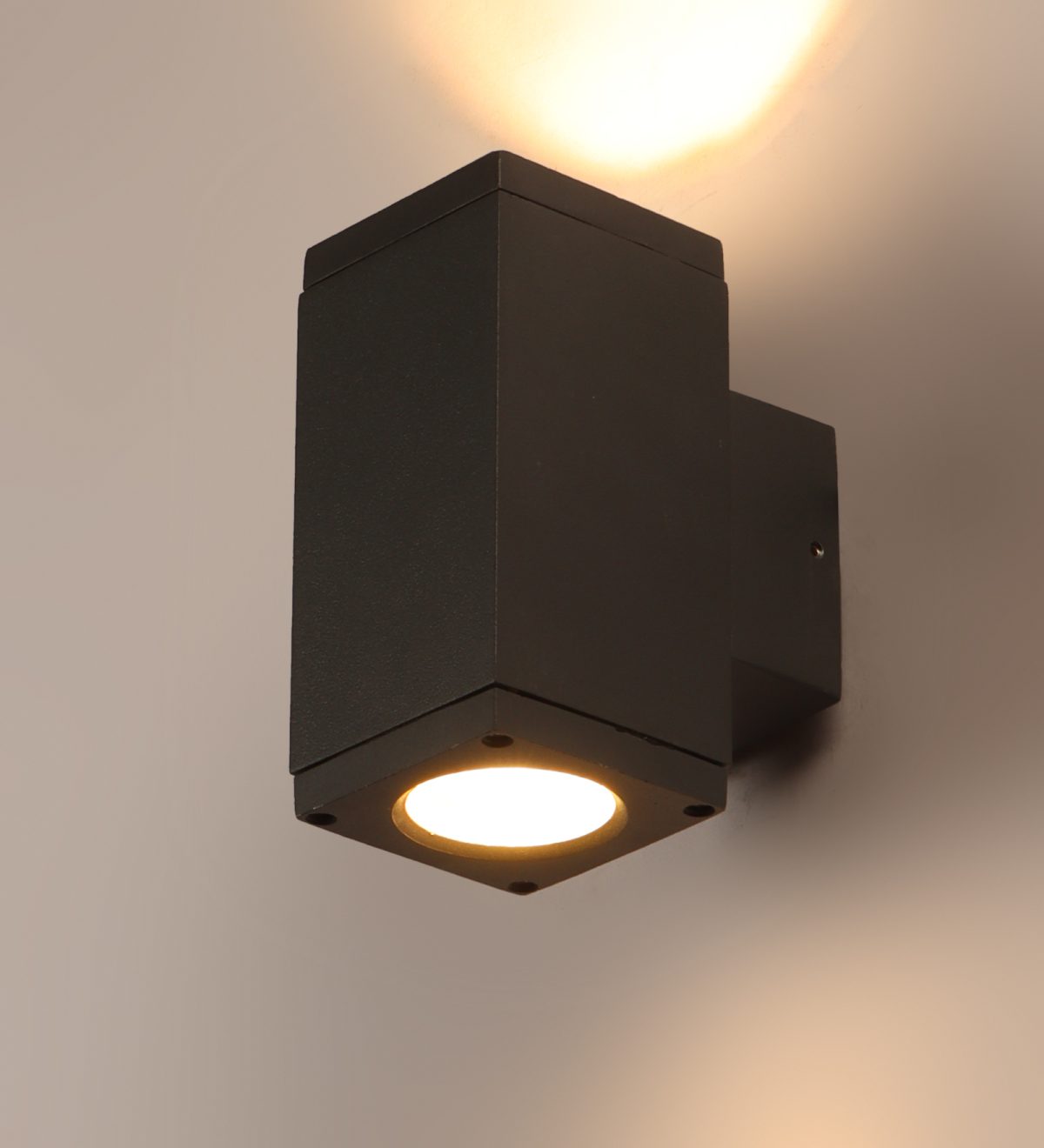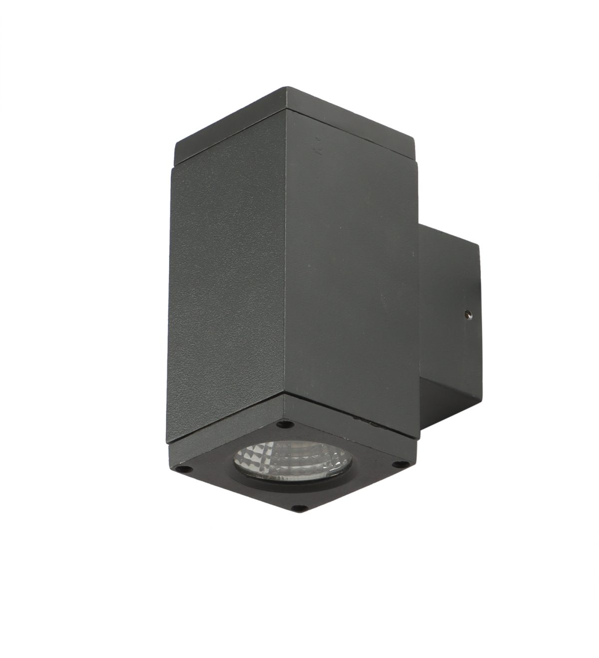 Vertical, square shaped, two way up and down aluminum die cast outdoor wall light in gray finish using high quality LED and driver with high success rate having less than 0.5% replacement. It is a two way light with high output having 5W COB with reflector for more light output. It is economical and one of the most popular design preferred by the lighting designers, builders and architects. It can be used in both indoor and outdoor applications such as stair case walls, terrace walls, outdoor walls, boundary walls, open parking, stilt parking, basement parking, passage walls, entrance pillars. Also available in one way (Code Wl2326). IP54 rated. Protection against splashed water can be customized as per requirement for bulk quantities.