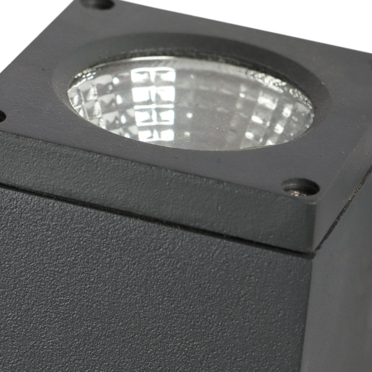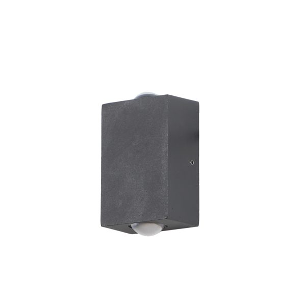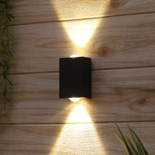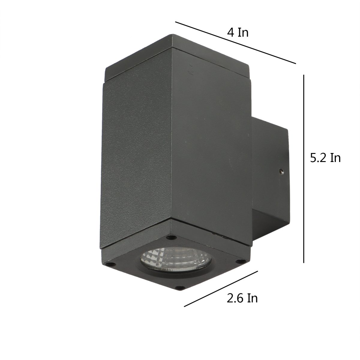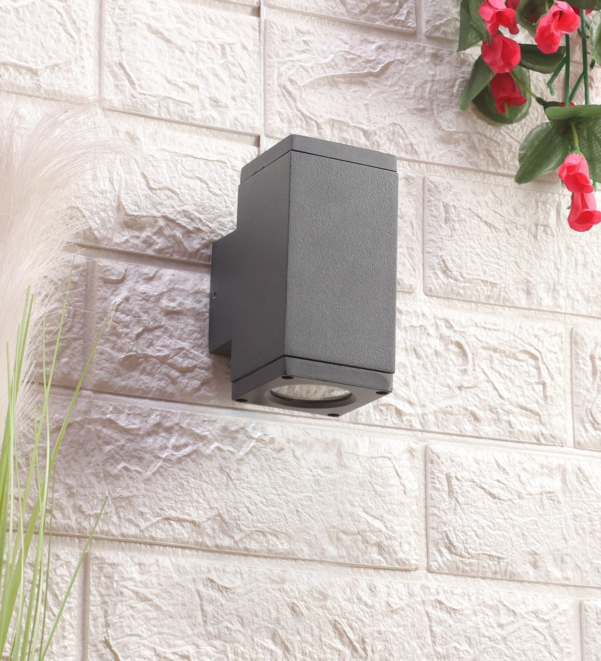 Vertical, square shaped, two way up and down aluminum die cast outdoor wall light in gray finish using high quality LED and driver with high success rate having less than 0.5% replacement. It is a two way light with high output having 5W COB with reflector for more light output. It is economical and one of the most popular design preferred by the lighting designers, builders and architects. It can be used in both indoor and outdoor applications such as stair case walls, terrace walls, outdoor walls, boundary walls, open parking, stilt parking, basement parking, passage walls, entrance pillars. Also available in one way (Code Wl2326). IP54 rated. Protection against splashed water can be customized as per requirement for bulk quantities.