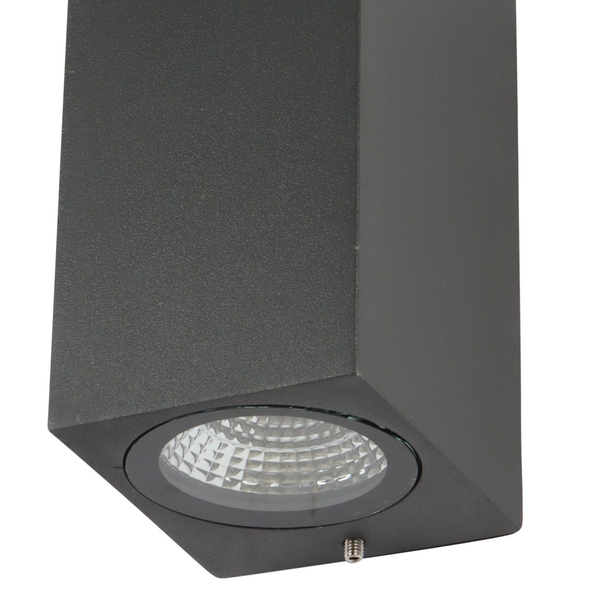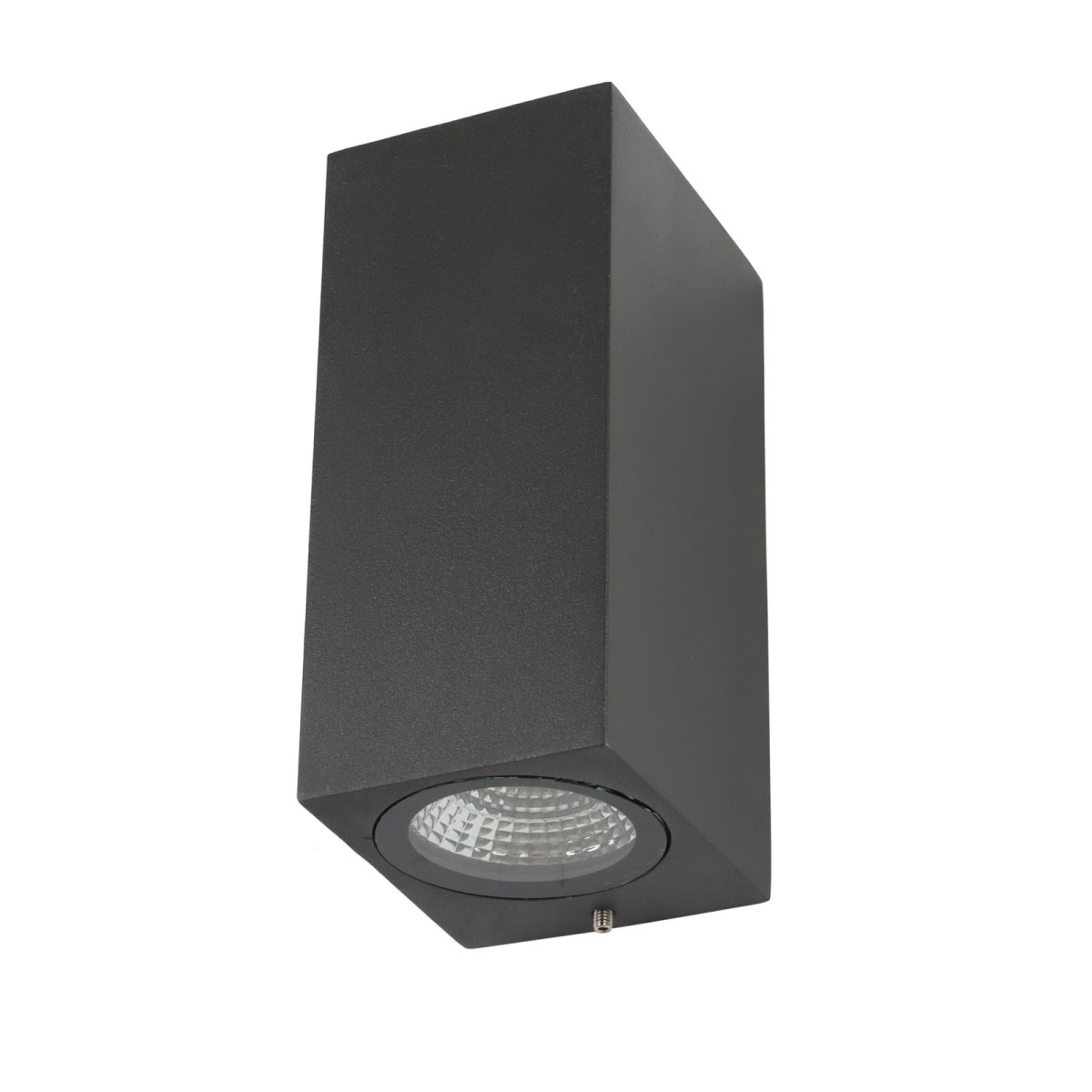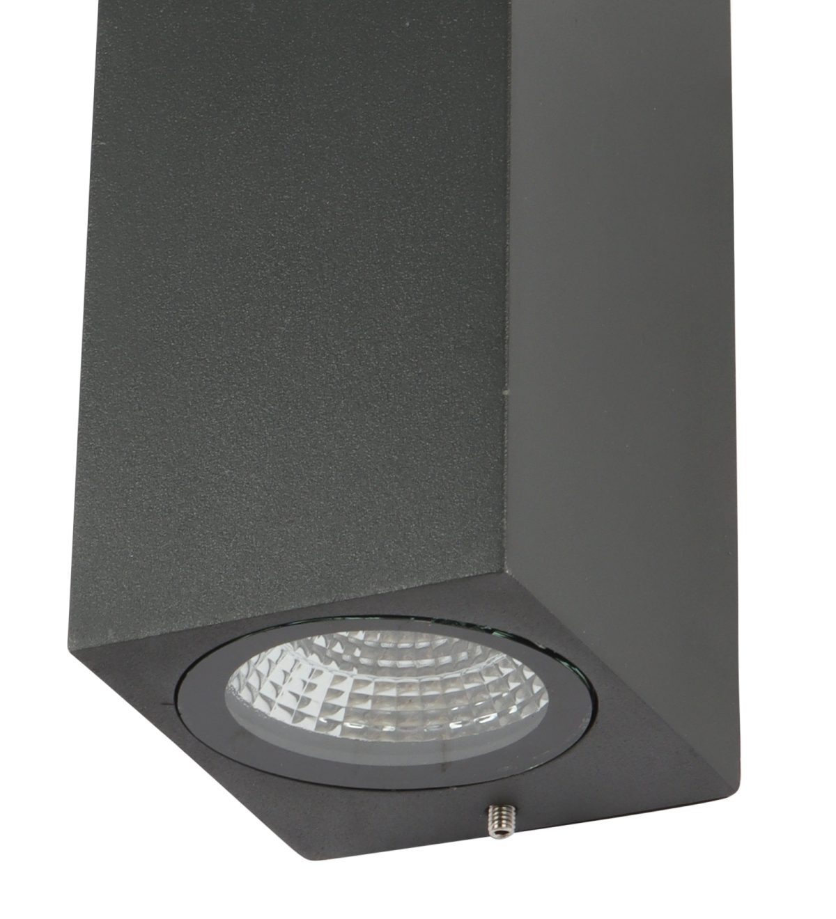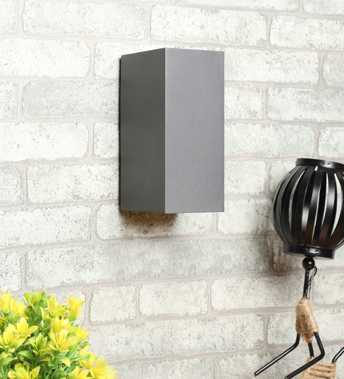 Vertical, square shaped, two way up and down aluminum die cast outdoor wall light in grey finish using high quality LED and driver with high success rate having less than 0.5% replacement. It is a two way light with high output having 5W COB with reflector for more light output. It is economical and one of the most popular design preferred by the lighting designers, builders and architects. It can be used in both indoor and outdoor applications such as stair case walls, terrace walls, outdoor walls, boundary walls, open parking, stilt parking, basement parking, passage walls, entrance pillars. Also available in one way (Code Wl2501). IP54 rated. Protection against splashed water can be customized as per requirement for bulk quantities.
