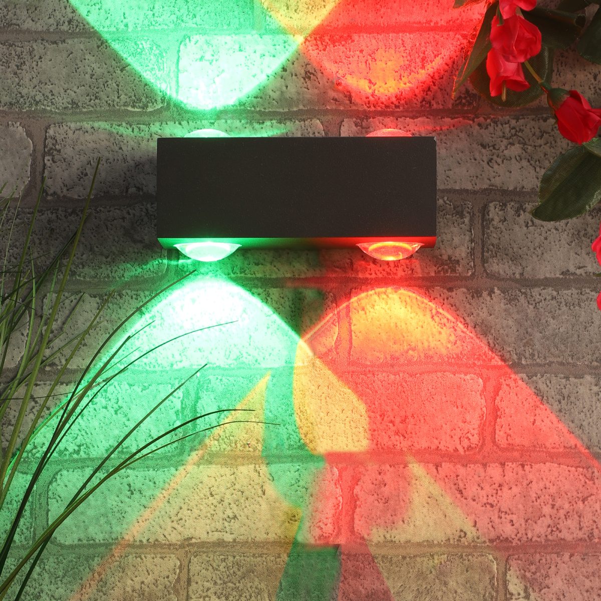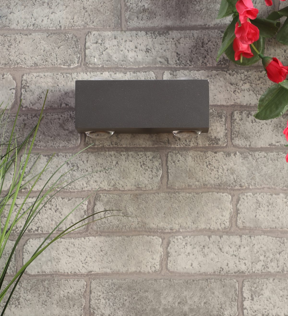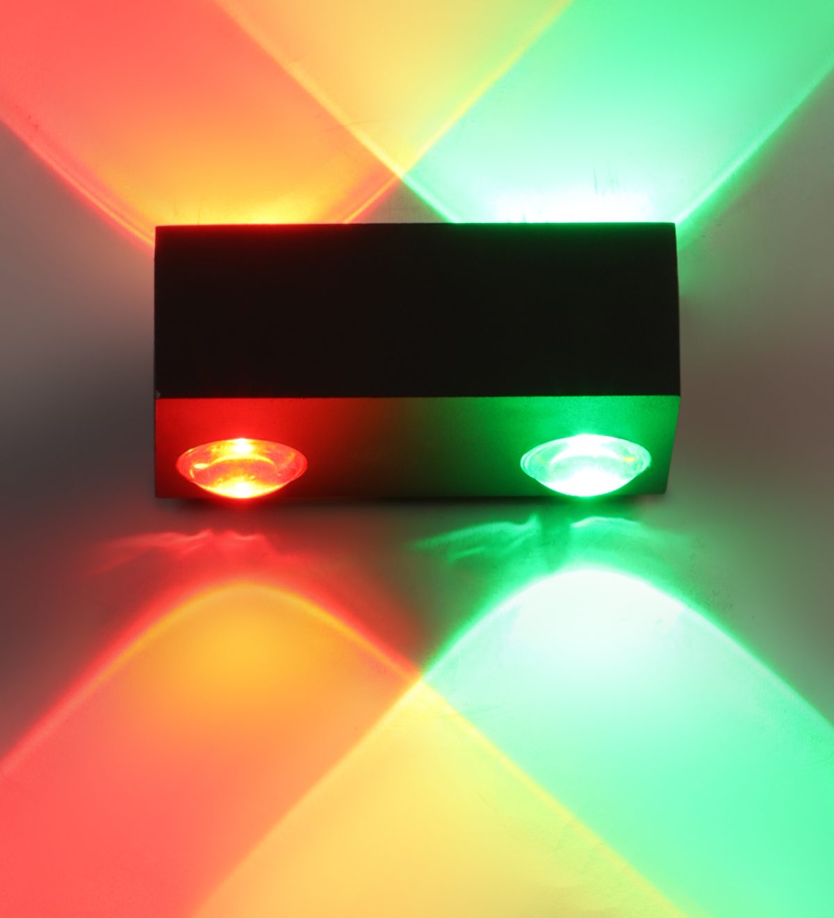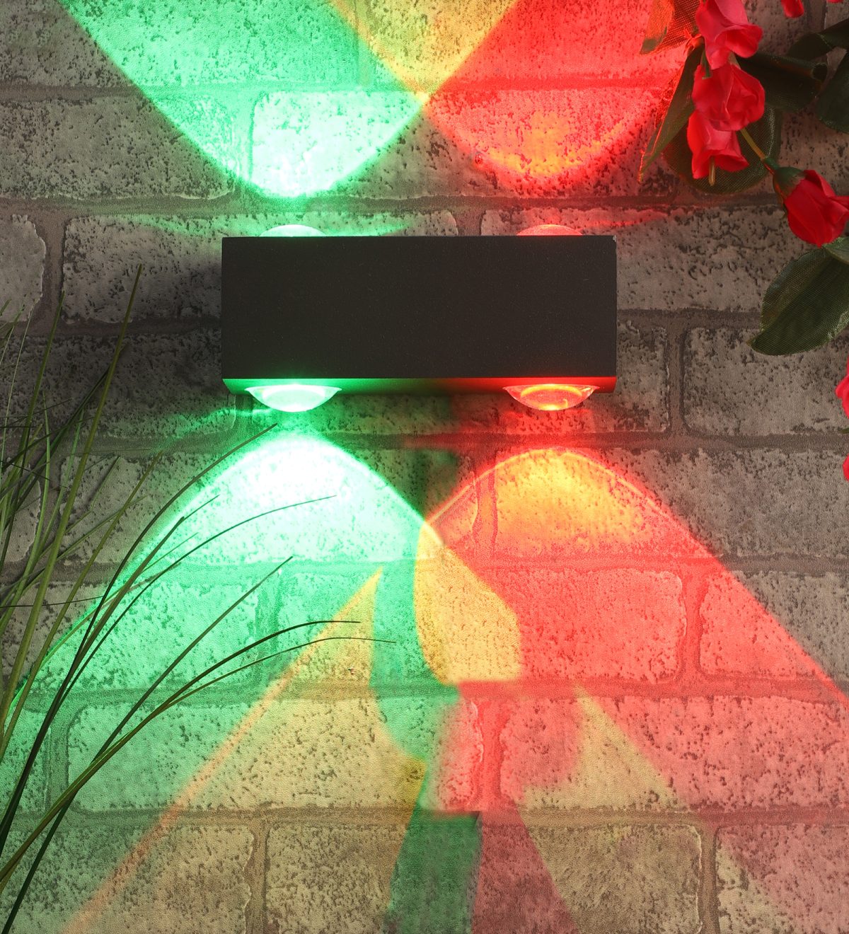 Multi colored up and down aluminum die cast outdoor wall light in gray finish using high quality LED and driver with high success rate having less than 0.5% replacement. It is a two way light with high light output creating a defined beam in red and green color in both the directions for a colorful visual effect. It can be used in both indoor and outdoor applications such as stair case walls, terrace walls, outdoor walls, boundary walls, open parking, stilt parking, basement parking, passage walls, entrance pillars. IP54 rated. Protection against splashed water can be customized as per requirement for bulk quantities.
