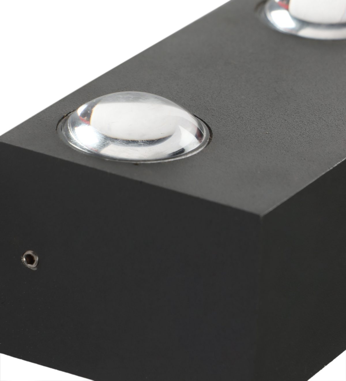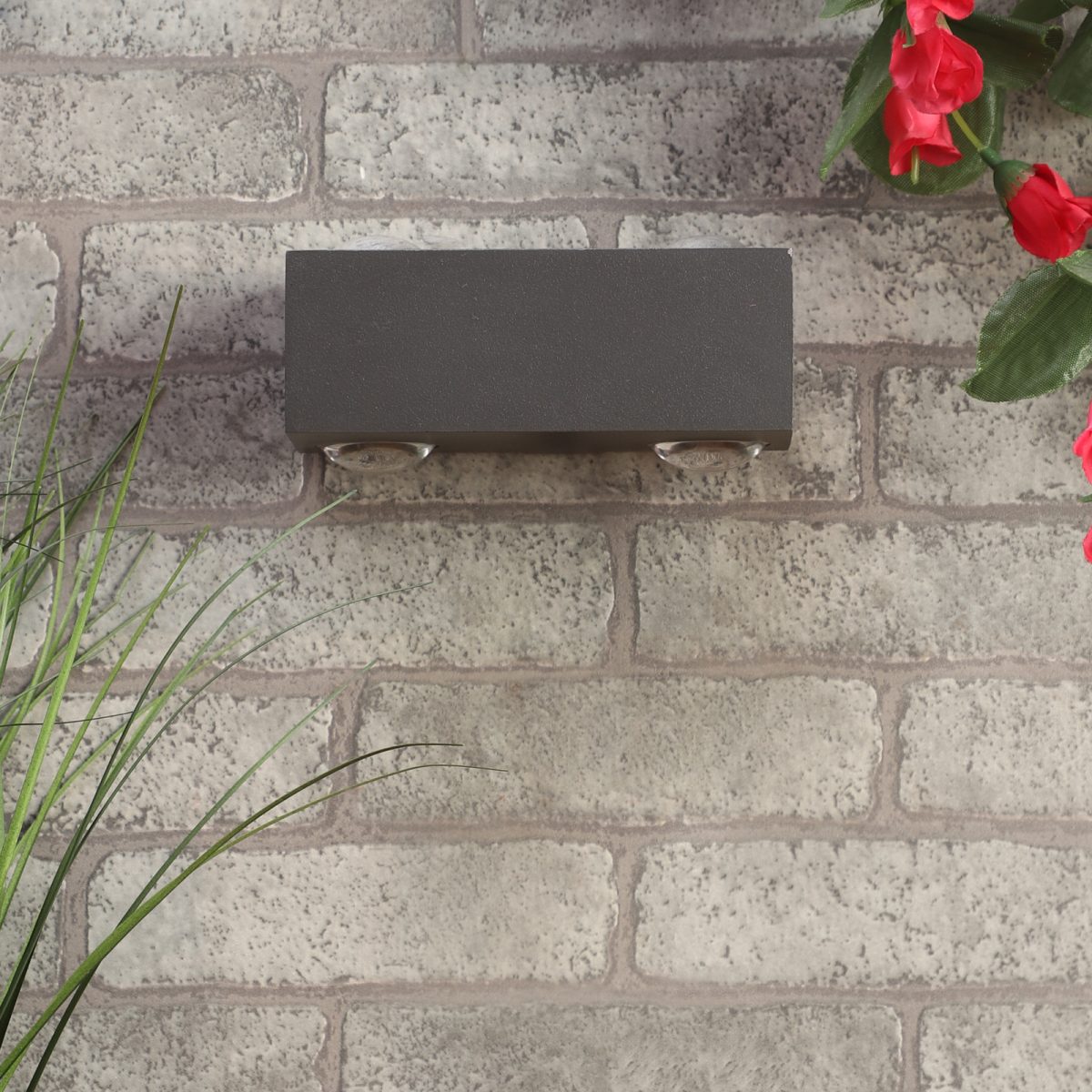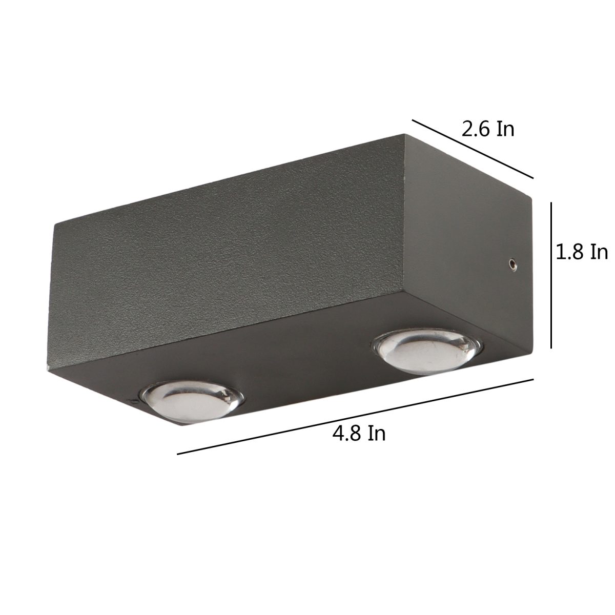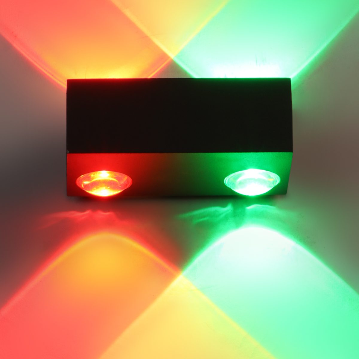Multi colored up and down aluminum die cast outdoor wall light in gray finish using high quality LED and driver with high success rate having less than 0.5% replacement. It is a two way light with high light output creating a defined beam in red and green color in both the directions for a colorful visual effect. It can be used in both indoor and outdoor applications such as stair case walls, terrace walls, outdoor walls, boundary walls, open parking, stilt parking, basement parking, passage walls, entrance pillars. IP54 rated. Protection against splashed water can be customized as per requirement for bulk quantities.