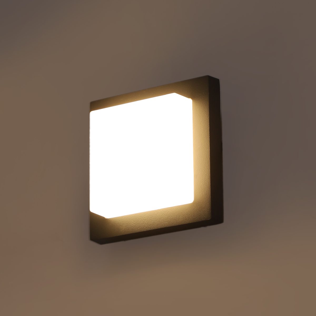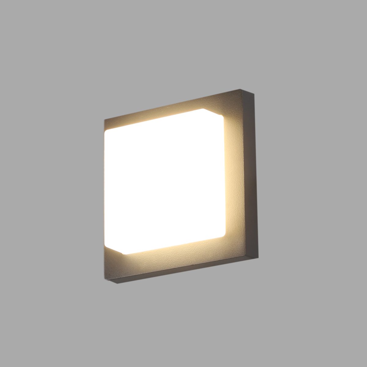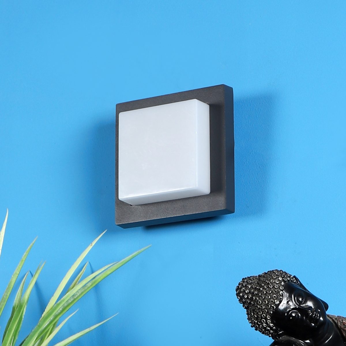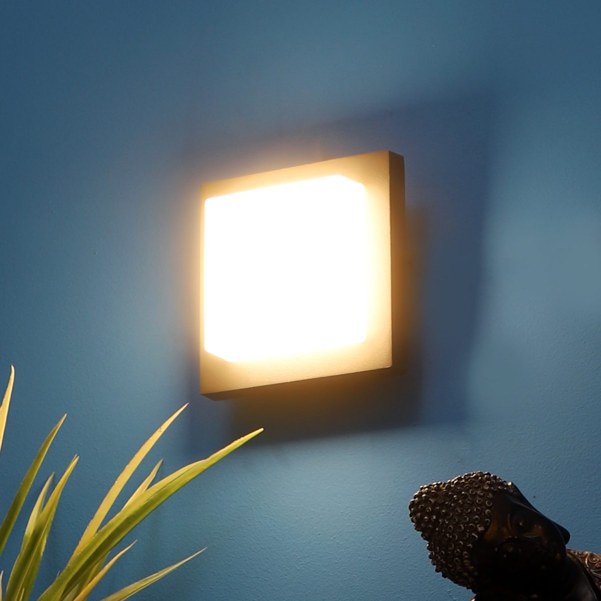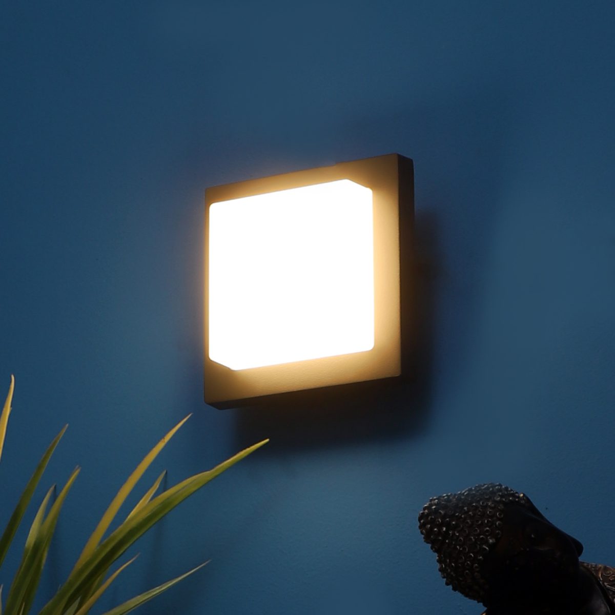 Square aluminium die cast outdoor wall light in grey finish. Can be used as a ceiling light. It uses high quality LED and driver with high success rate having less than 0.5% replacement. It is a small light with bright output. It can be used in both indoor and outdoor applications. Application areas include porches, entrance, patio, verandah, balcony, bathroom, staircase ceiling, terrace, stilt parking, basement parking . IP54 rated, protection against splashed water.