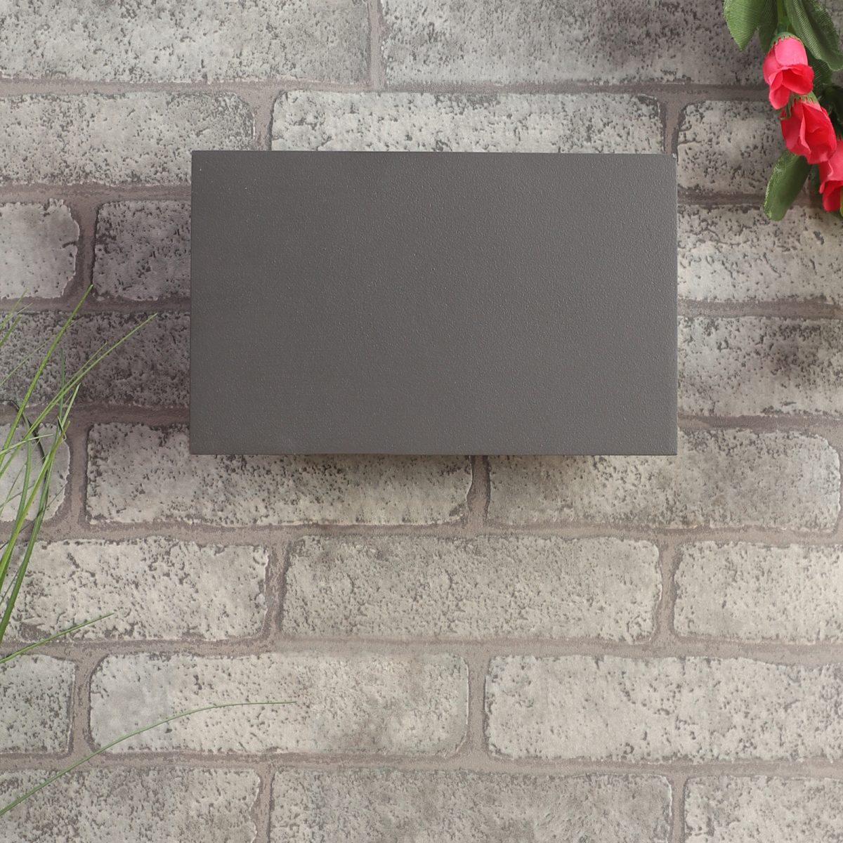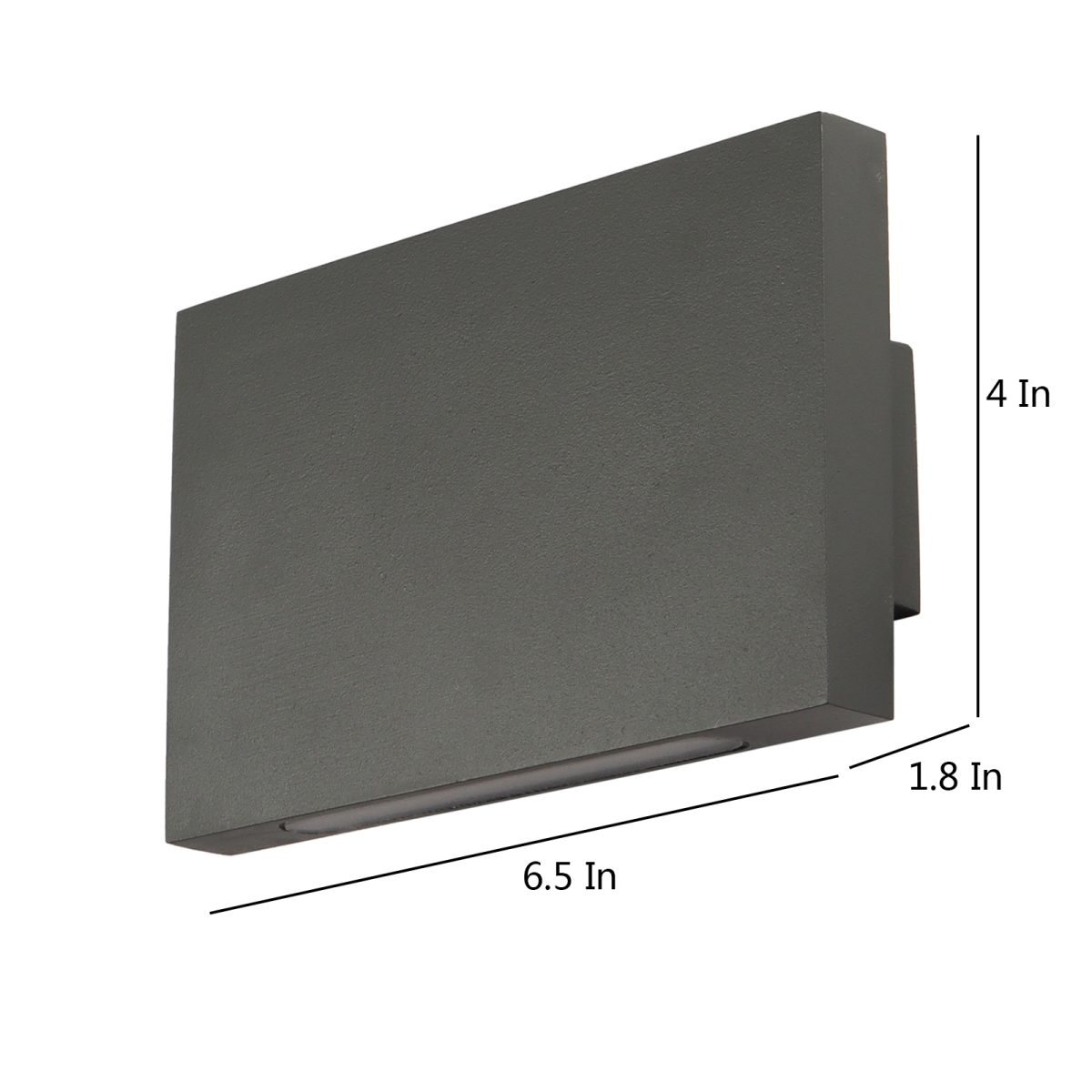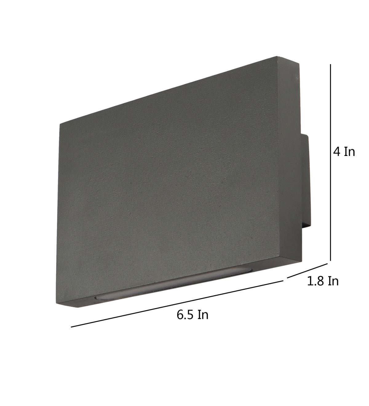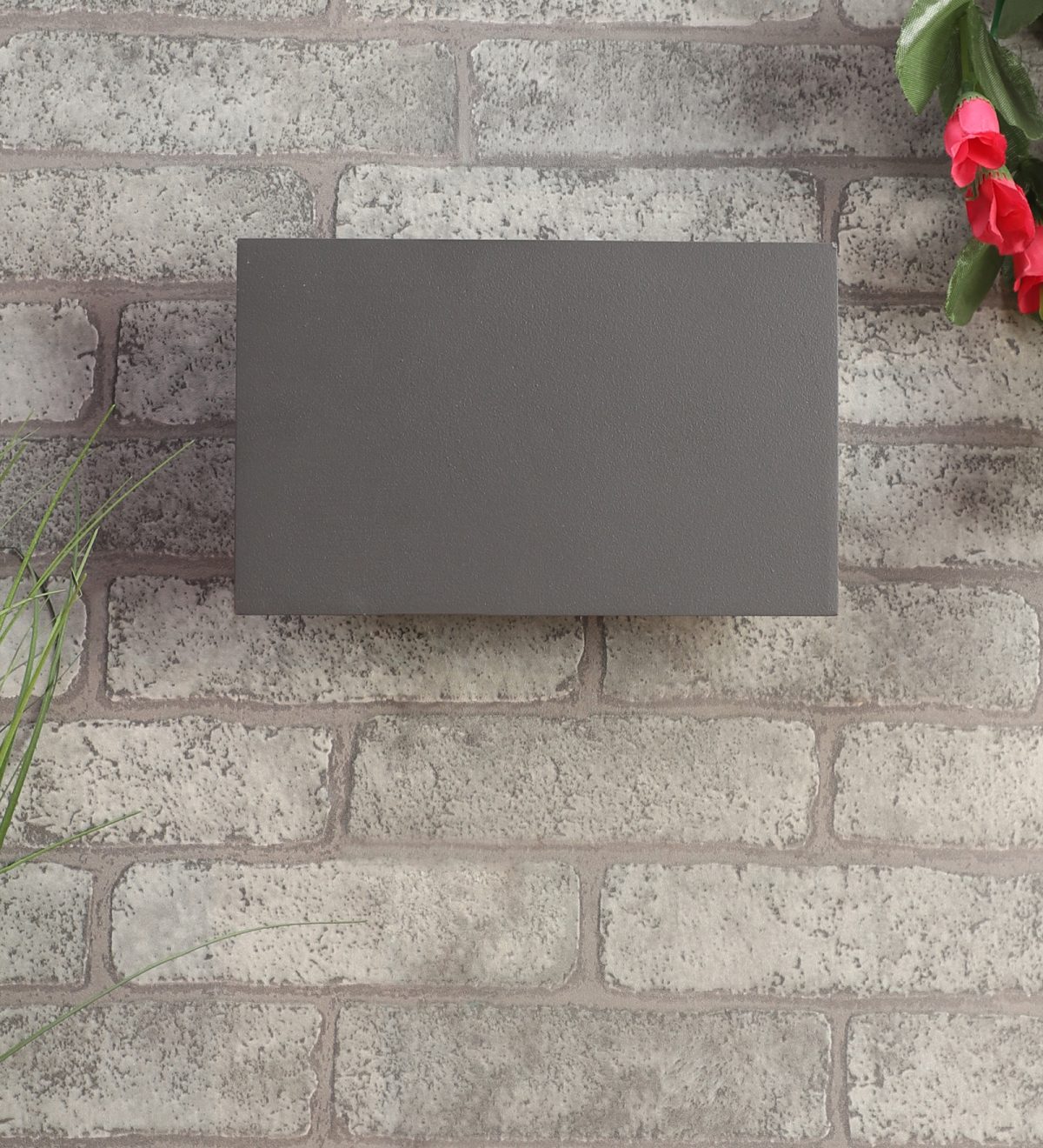 Vertical, rectangular, up and down, two way aluminum die cast outdoor wall light in gray finish using high quality LED and driver with high success rate having less than 0.5% replacement. This is one of the highest selling product. It is a two way light providing light in two directions. It can be used in both indoor and outdoor applications such as stair case walls, terrace walls, outdoor walls, boundary walls, open parking, stilt parking, basement parking, passage walls. IP54 rated. Protection against splashed water can be customized as per requirement for bulk quantities.
