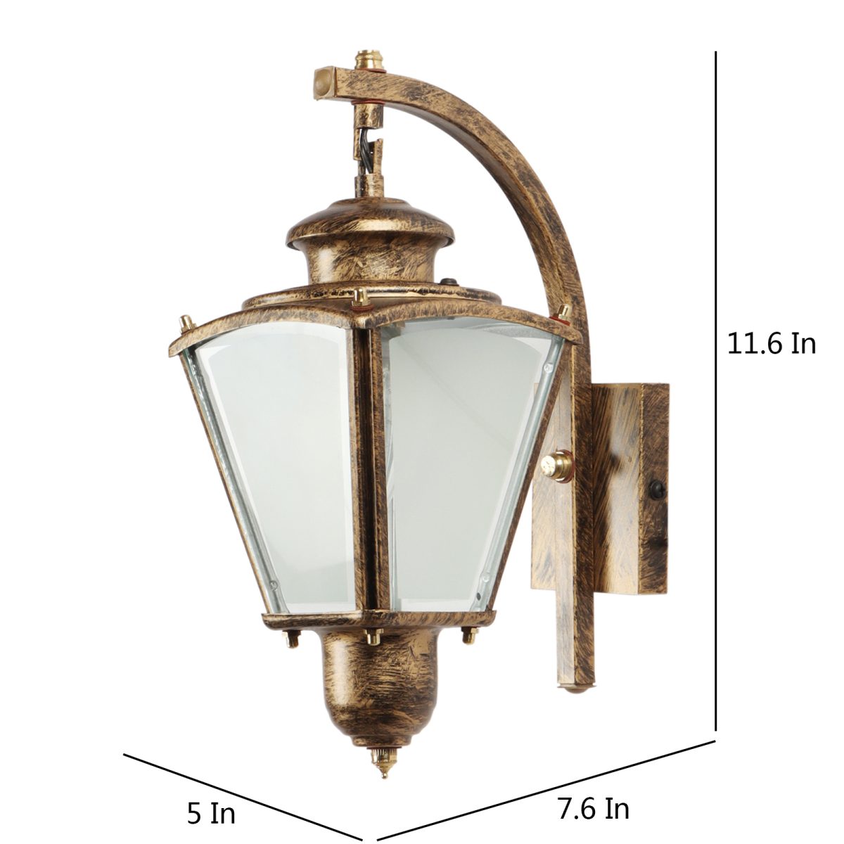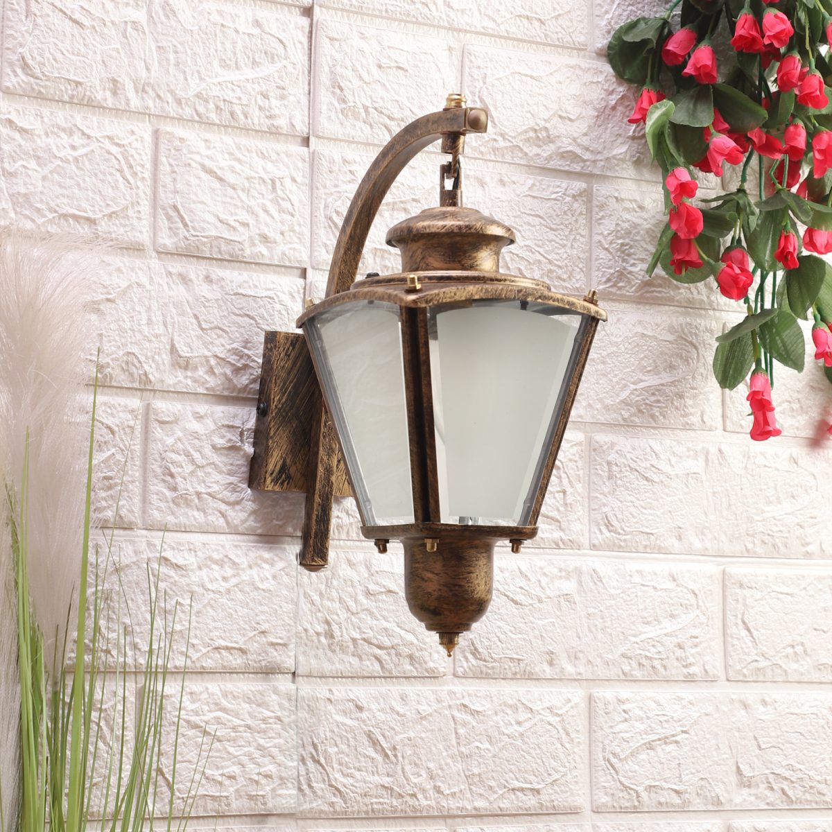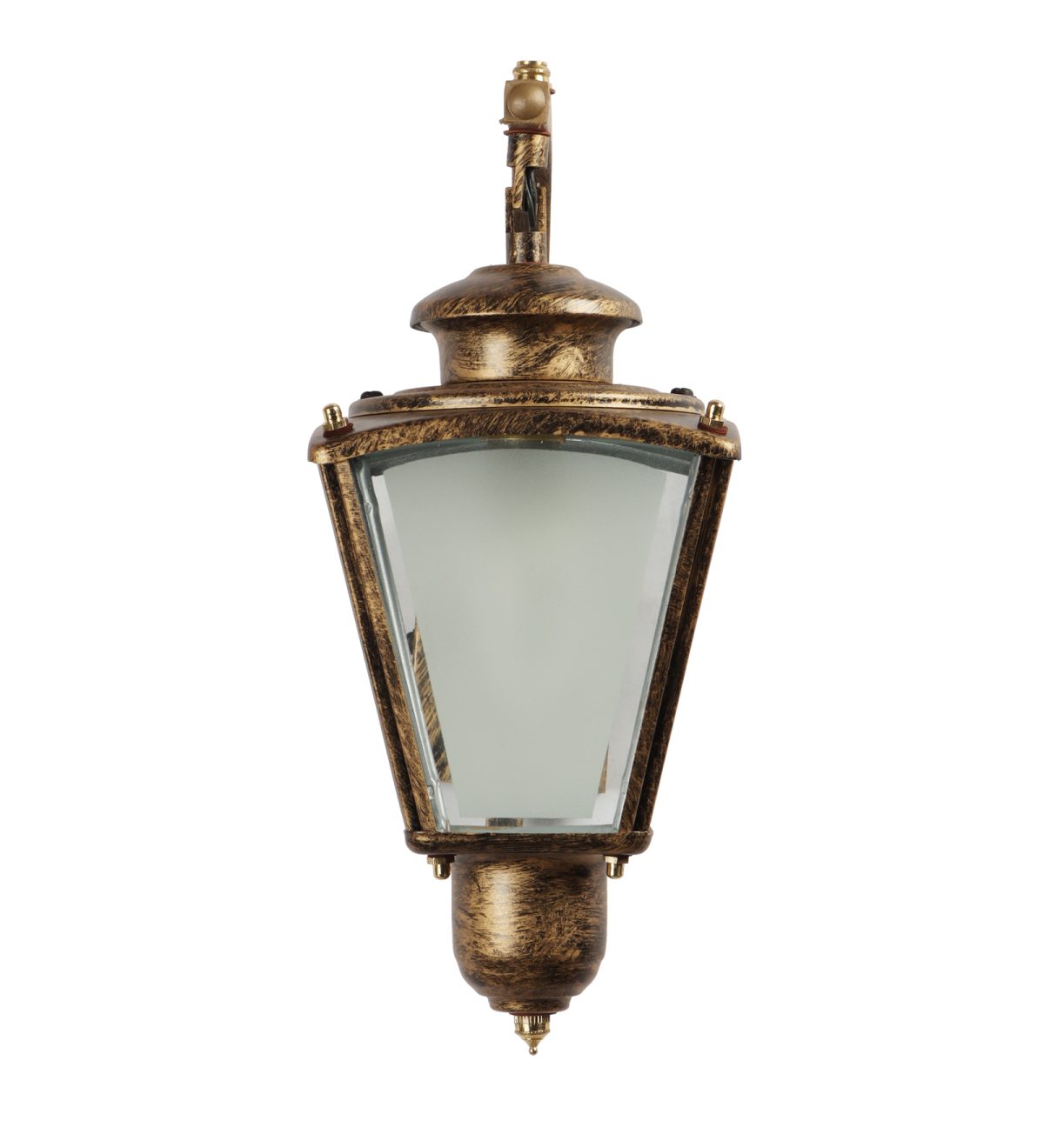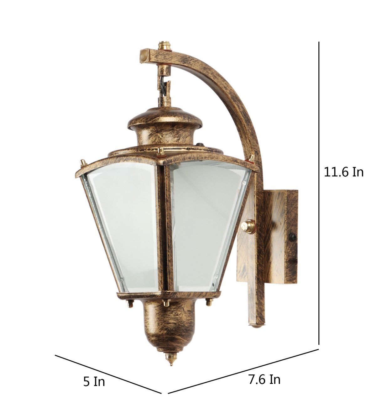 Vertical, aluminium sheet, export quality top selling traditional hanging outdoor wall light in antique gold finish with frosted glass. It is maintenance free, comes with an B22 holder, only the change of lamp is required, which is available locally everywhere You can of course swap out the bulb for one that is dimmable, has a higher light output or a different color temperature. IP54 rated providing protection from sprayed water in any direction and making this light perfect for use outdoors. Application areas include Stair case walls, passage to staircase, terrace walls, terrace gardens, outdoor walls, boundary walls, open parking, stilt parking, basement parking, balcony, can also be installed inside, also suits theme restaurants and bars. Available in black color finish also (WL1876).
