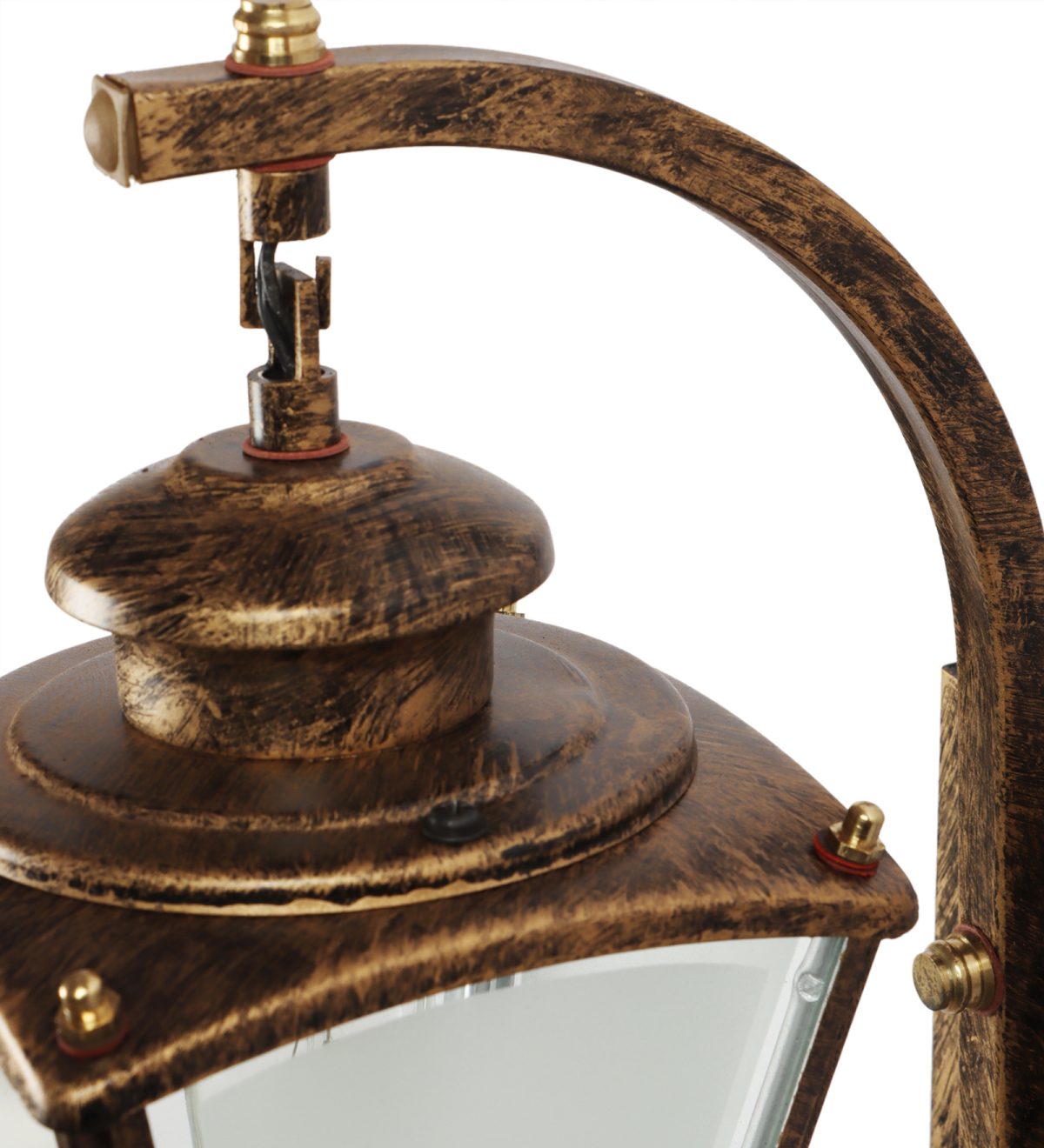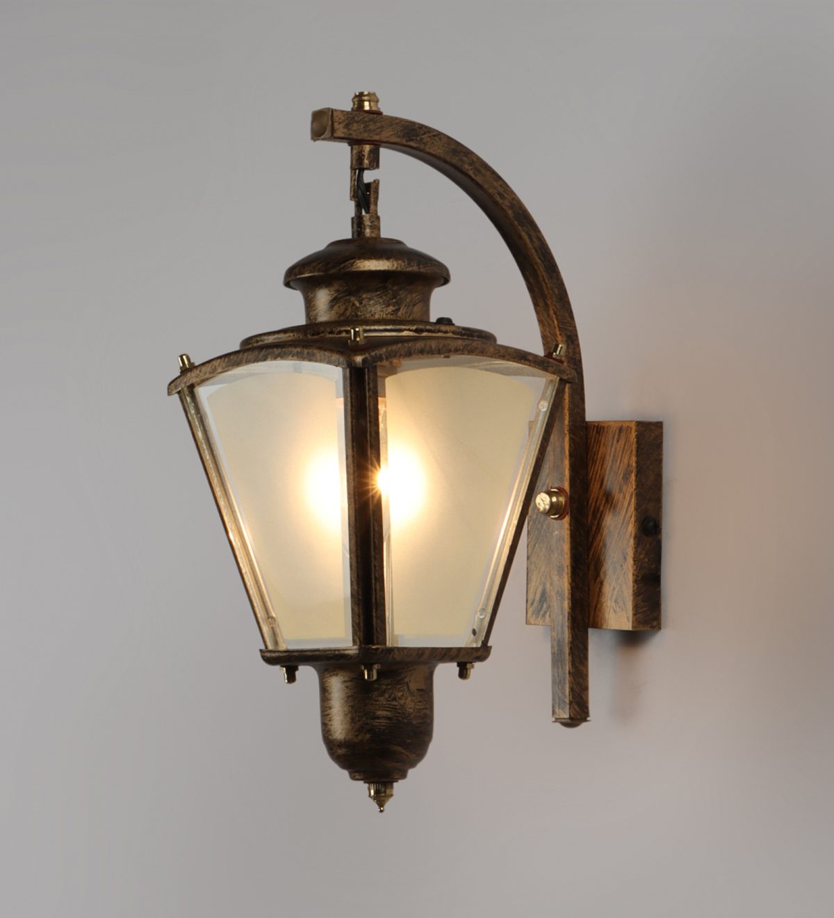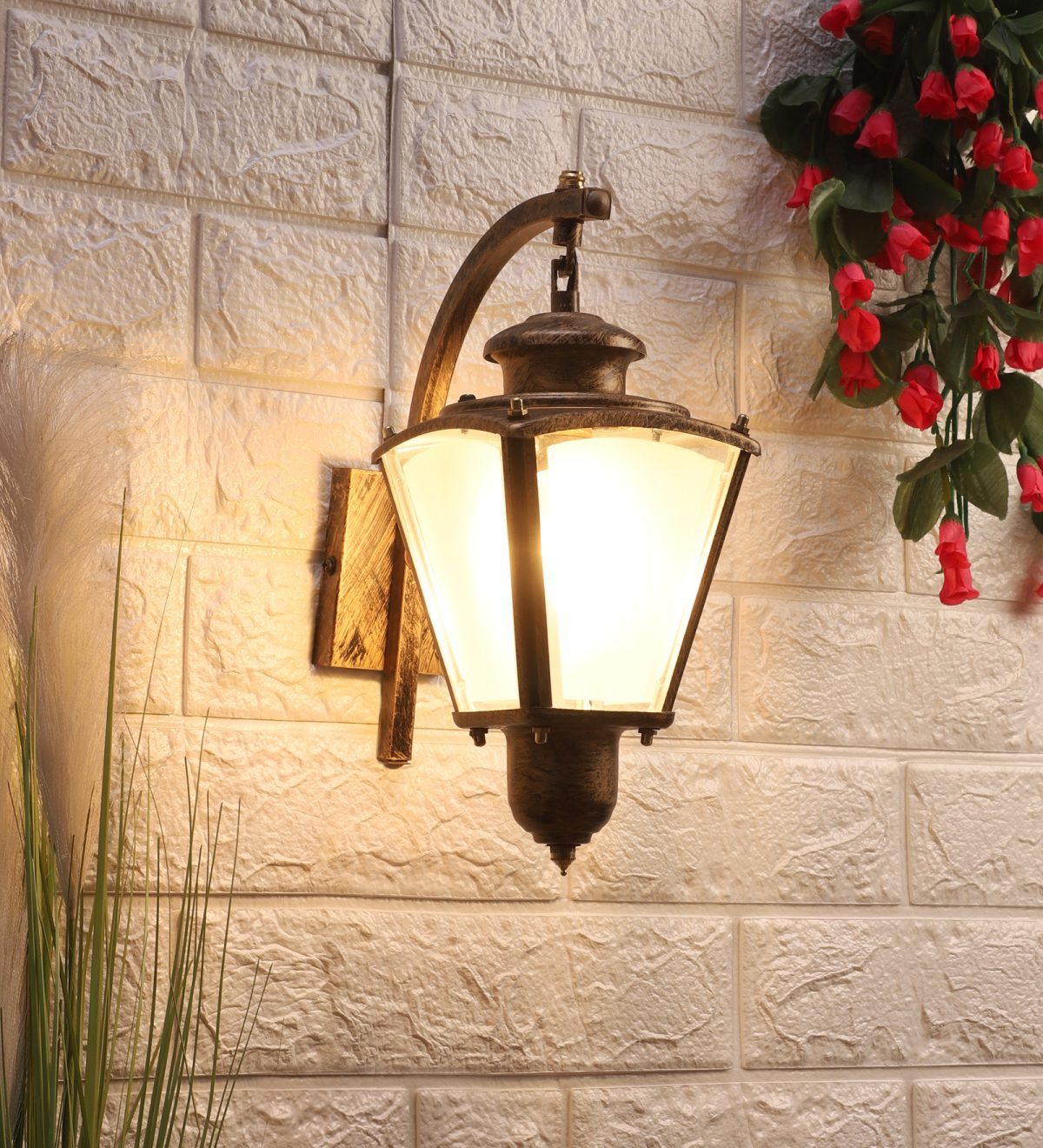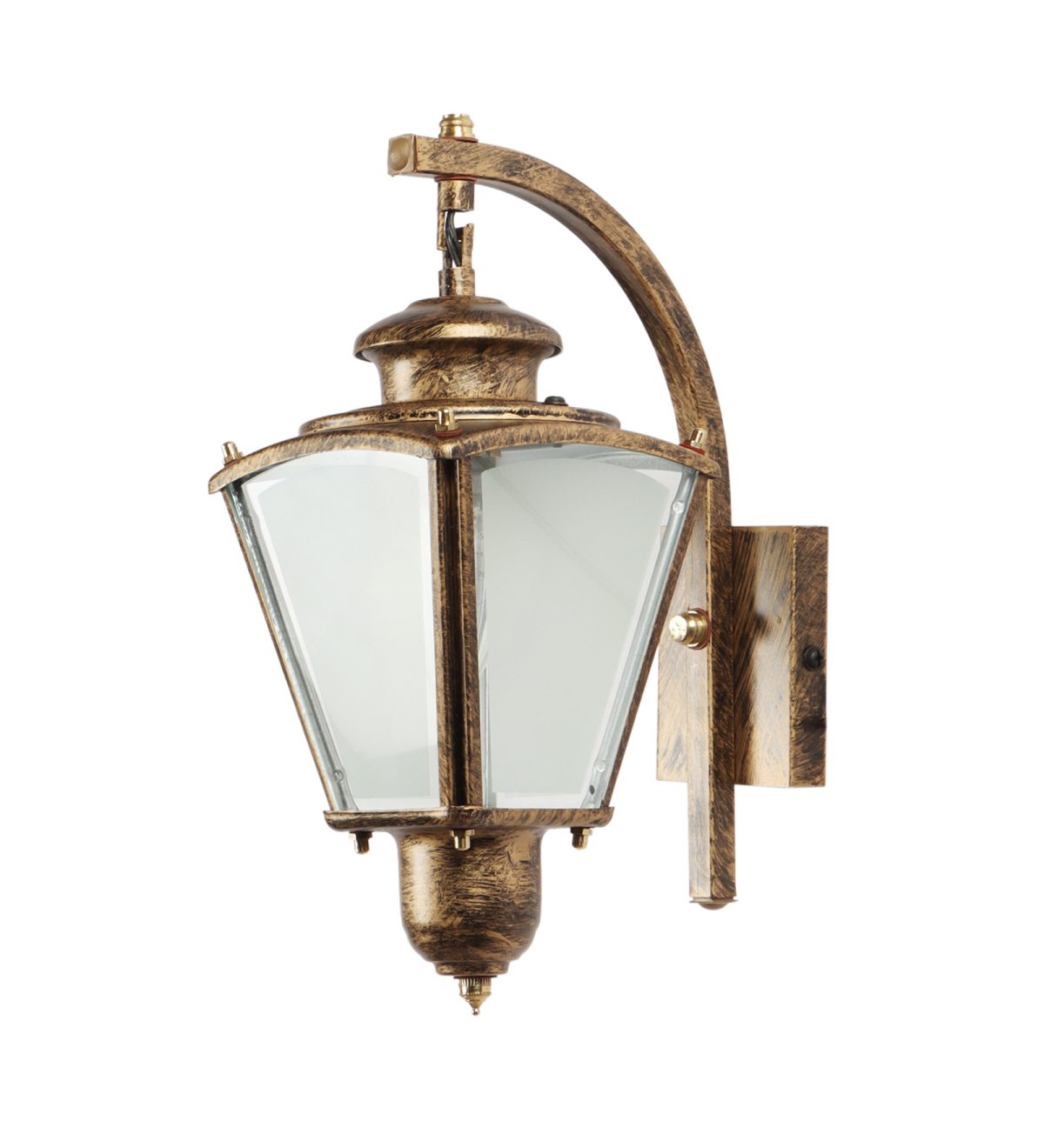 Vertical, aluminium sheet, export quality top selling traditional hanging outdoor wall light in antique gold finish with frosted glass. It is maintenance free, comes with an B22 holder, only the change of lamp is required, which is available locally everywhere You can of course swap out the bulb for one that is dimmable, has a higher light output or a different color temperature. IP54 rated providing protection from sprayed water in any direction and making this light perfect for use outdoors. Application areas include Stair case walls, passage to staircase, terrace walls, terrace gardens, outdoor walls, boundary walls, open parking, stilt parking, basement parking, balcony, can also be installed inside, also suits theme restaurants and bars. Available in black color finish also (WL1876).