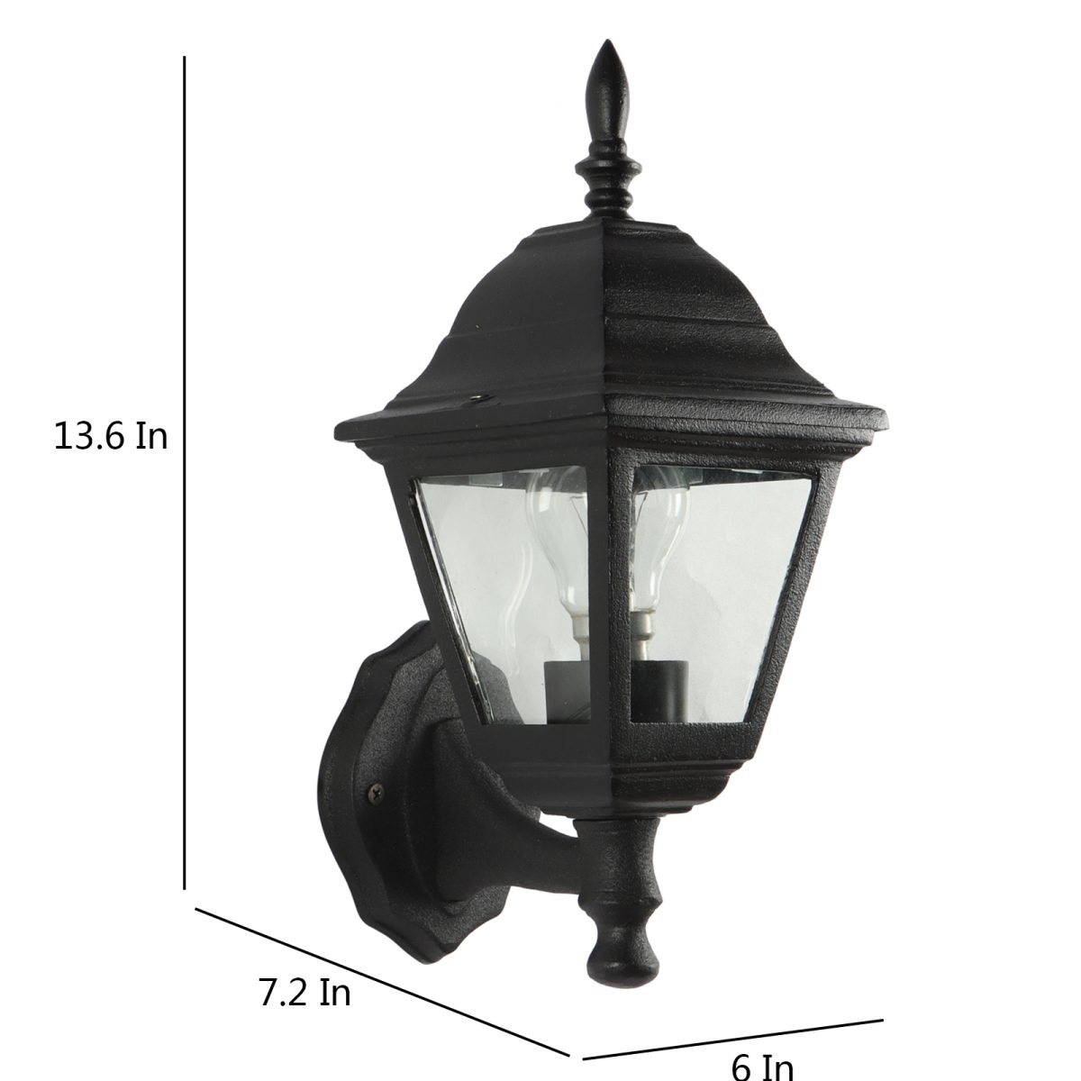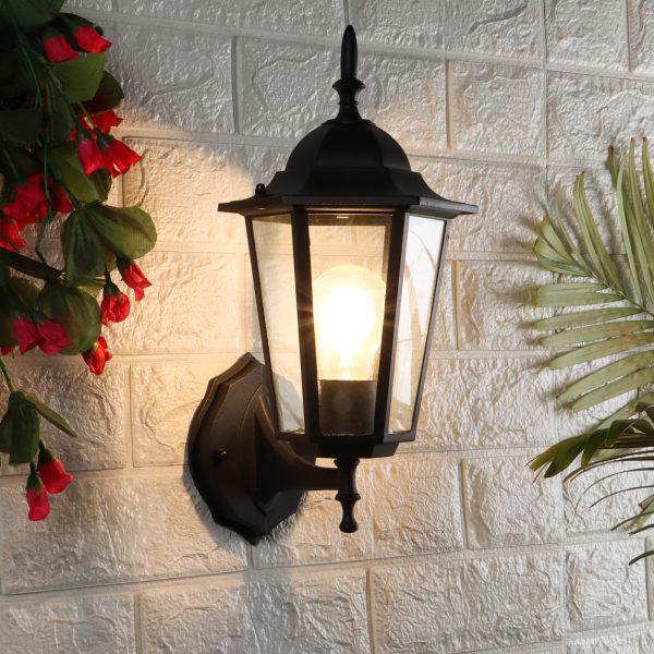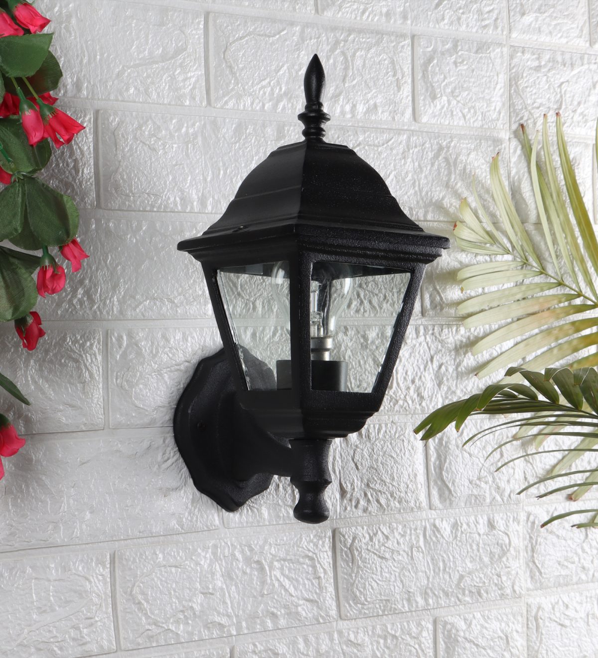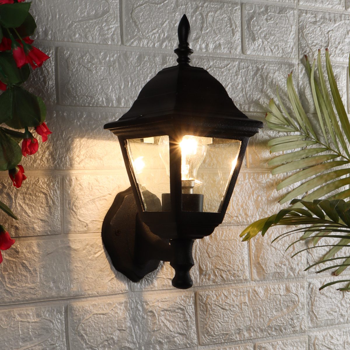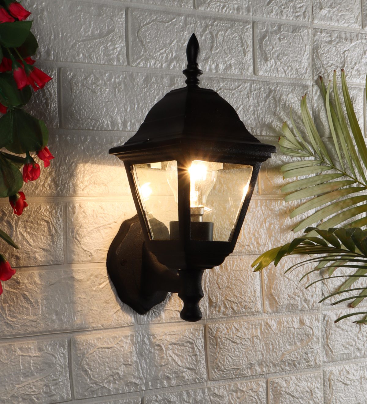 Vertical, aluminium die cast,traditional outdoor wall light in black finish with clear glass. It is maintenance free, comes with an E27 holder, only the change of lamp is required, which is available locally everywhere You can of course swap out the bulb for one that is dimmable, has a higher light output or a different color temperature. Application areas include Stair case walls, passage to staircase, terrace walls, terrace gardens, outdoor walls, boundary walls, open parking, stilt parking, basement parking, balcony , can also be installed inside, also suits theme restaurants and bars. Can be used indoors if goes with the color theme.