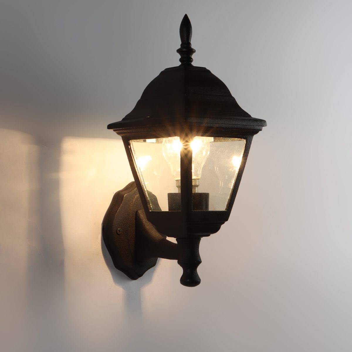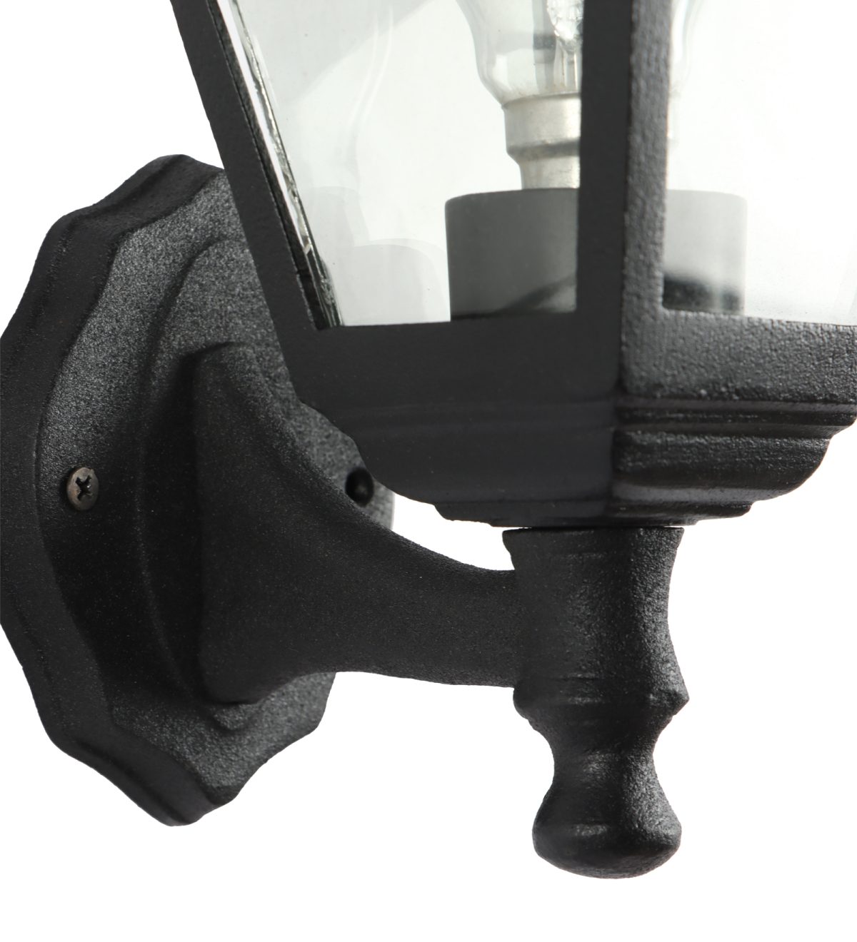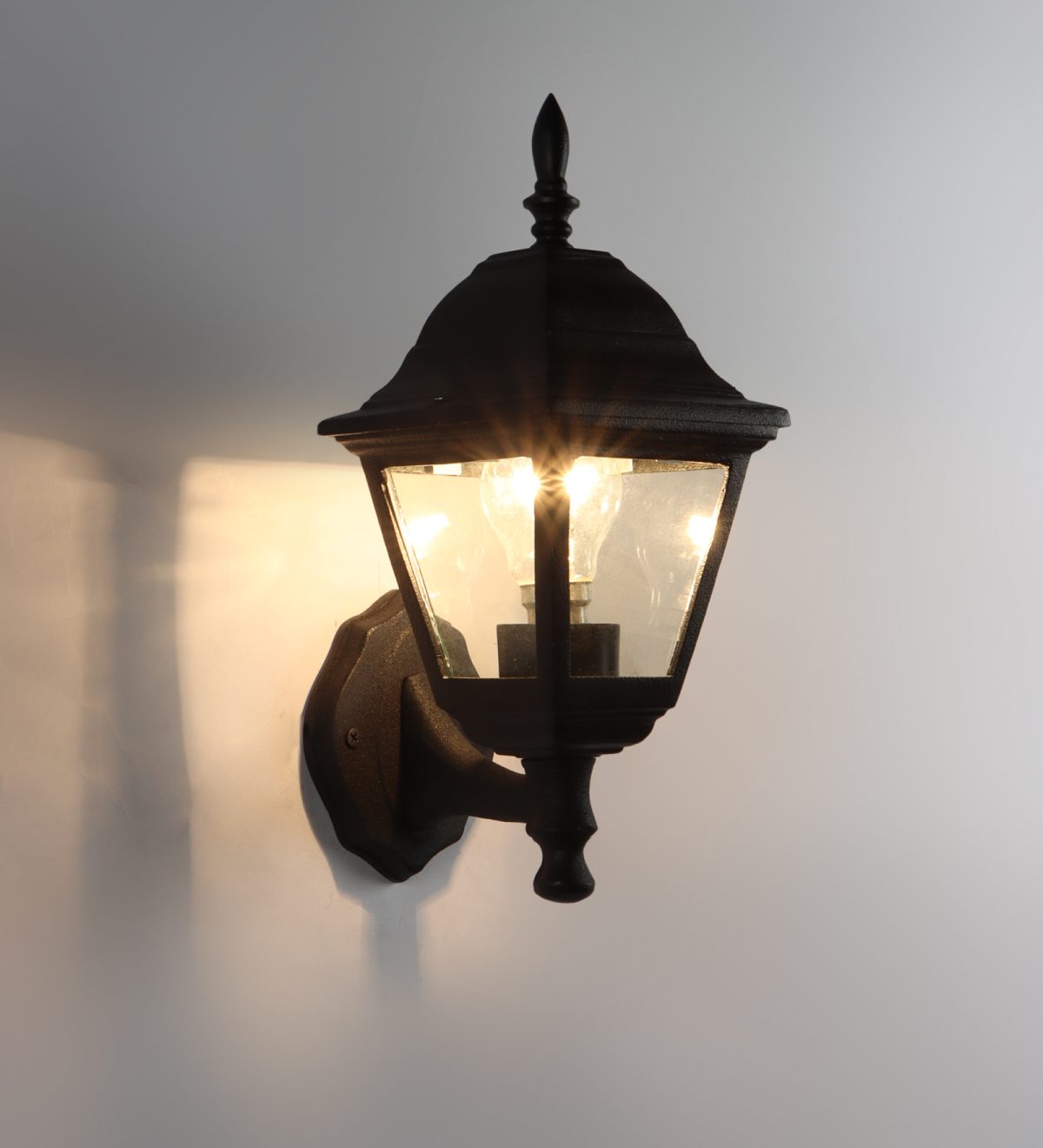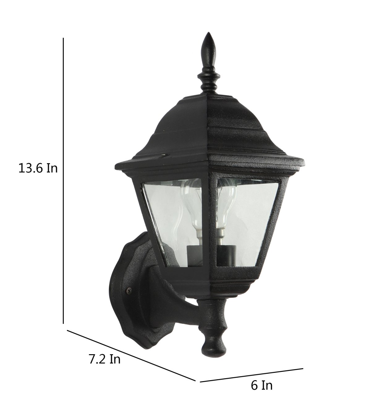 Vertical, aluminium die cast,traditional outdoor wall light in black finish with clear glass. It is maintenance free, comes with an E27 holder, only the change of lamp is required, which is available locally everywhere You can of course swap out the bulb for one that is dimmable, has a higher light output or a different color temperature. Application areas include Stair case walls, passage to staircase, terrace walls, terrace gardens, outdoor walls, boundary walls, open parking, stilt parking, basement parking, balcony , can also be installed inside, also suits theme restaurants and bars. Can be used indoors if goes with the color theme.