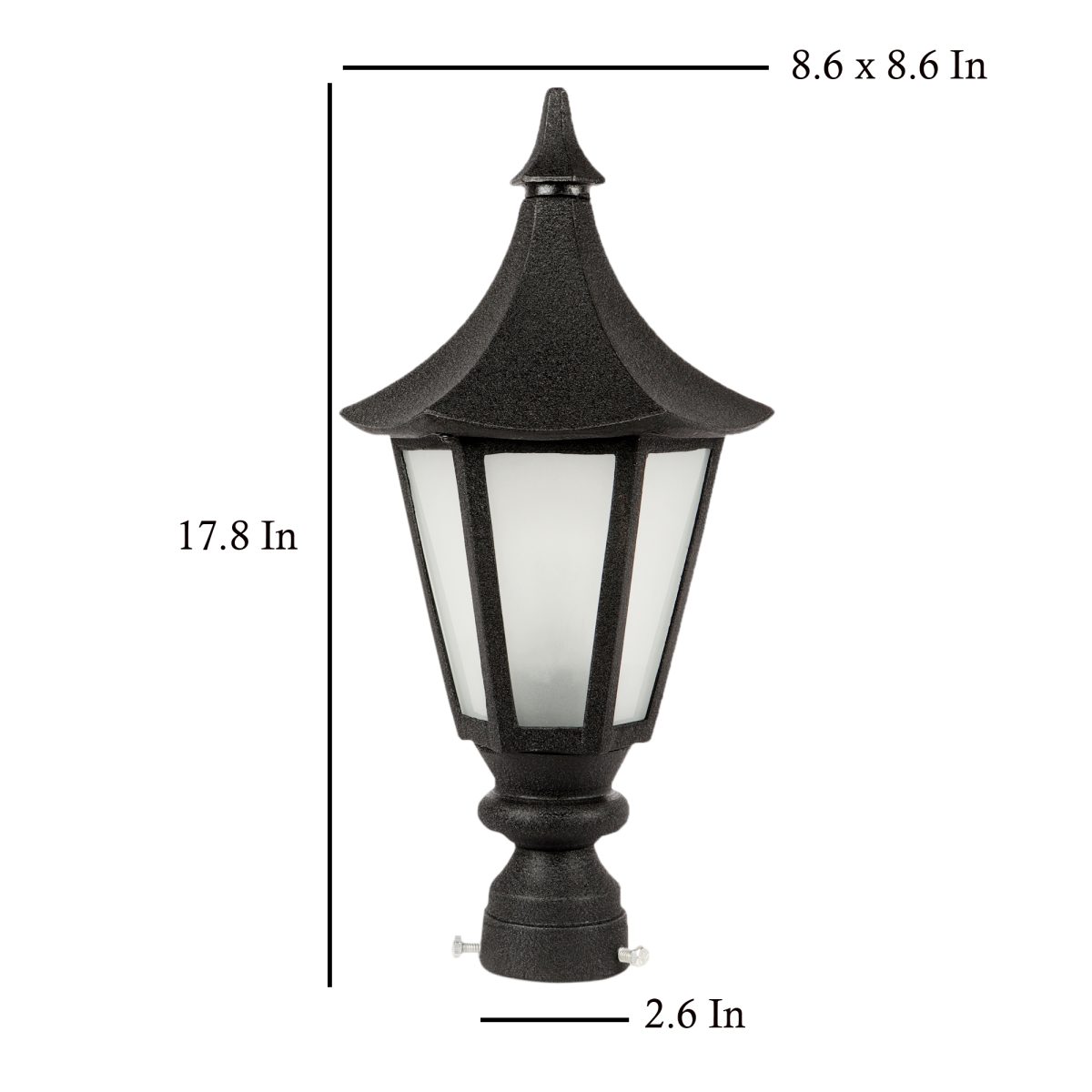 Traditional heavy duty,aluminium die cast, premium one of top selling export quality gate pillar post light in black finish. It is maintenance free, comes with an B22 holder, only the change of lamp is required, which is available locally everywhere You can of course swap out the bulb for one that is dimmable, has a higher light output or a different color temperature. IP54 rated, providing protection from sprayed water in any direction and making this light perfect for use outdoors. Application areas include building entrance, on top of terrace walls, terrace gardens, boundary walls, open parking, stilt parking. Available in three sizes with codes – GL4593-S, GL4775-M, GL4593-L. Matching wall light – WL1830, WL1834, WL1202, WL2649. Matching pendant – HL3768, HL6060. Matching Bollard code – K1076. All options available in antique gold finish also. LAMPS NOT INCLUDED.